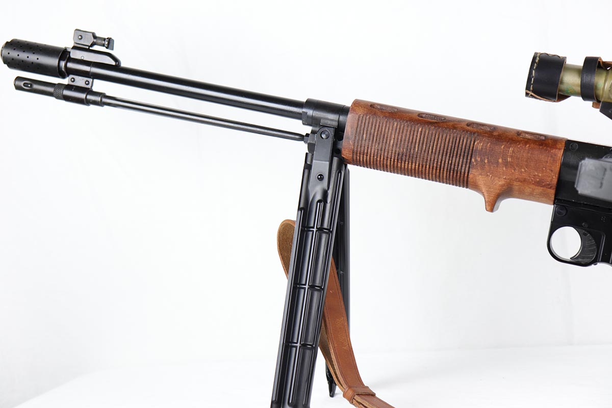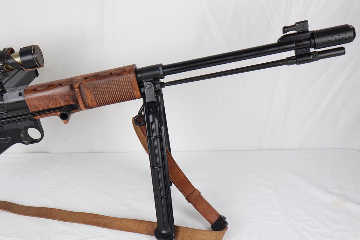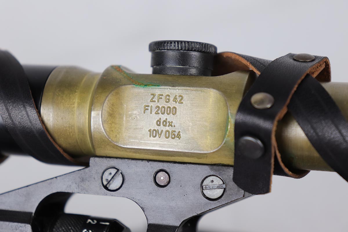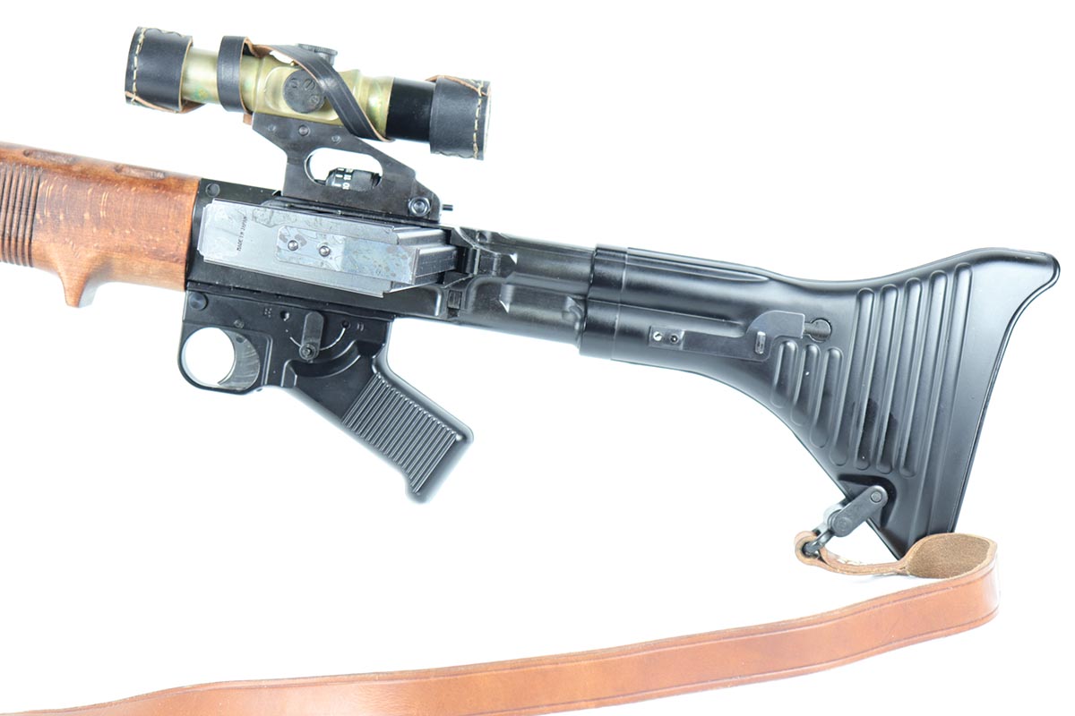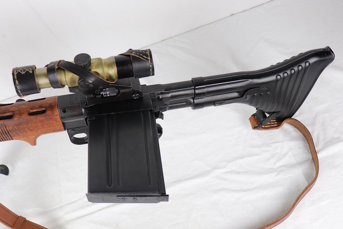 10/25/18 – This is a very cool Japanese reproduction of a German FG 42 from World War II in the original box. Manufactured by Shoei, it comes with a manual and canvas ammo belt, as well as reproduction scope and mount. This is a non-firing model that can be loaded and disassembled just like a real FG 42. It is a museum quality replica of a German WWII era FG 42. This replica is specifically designed to not be convertible to a real firearm. This reproduction is highly detailed and would satisfy re-enactors with its detail and quality.