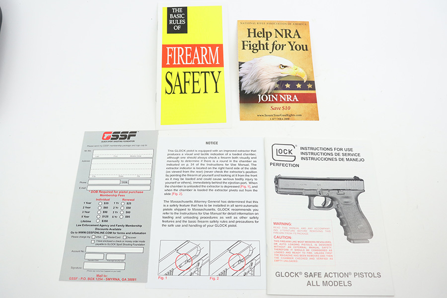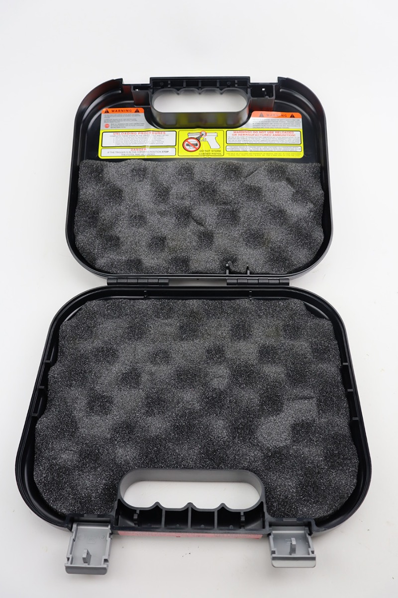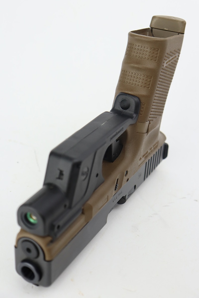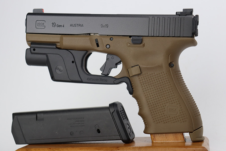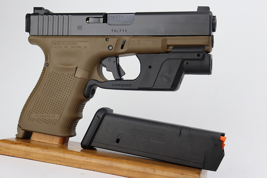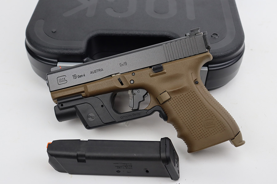 11/7/23 – This is a like-new example of a Gen 4 Glock 19. It has a dark earth colored frame with a blued slide. Comes equipped with a laser and a grip extension. It comes with its original matching hard case, owners manual, sales papers, one magazine, cleaning rod and brush, and spare grips. No signs of wear or use. Mint bore.