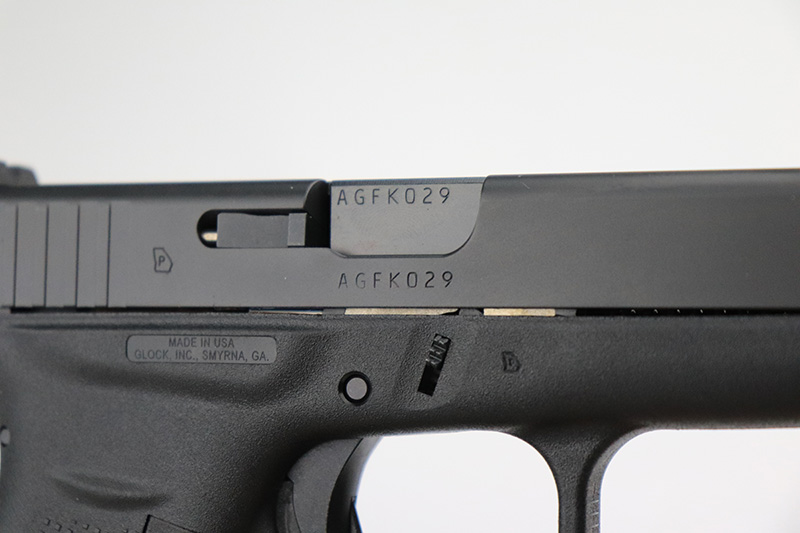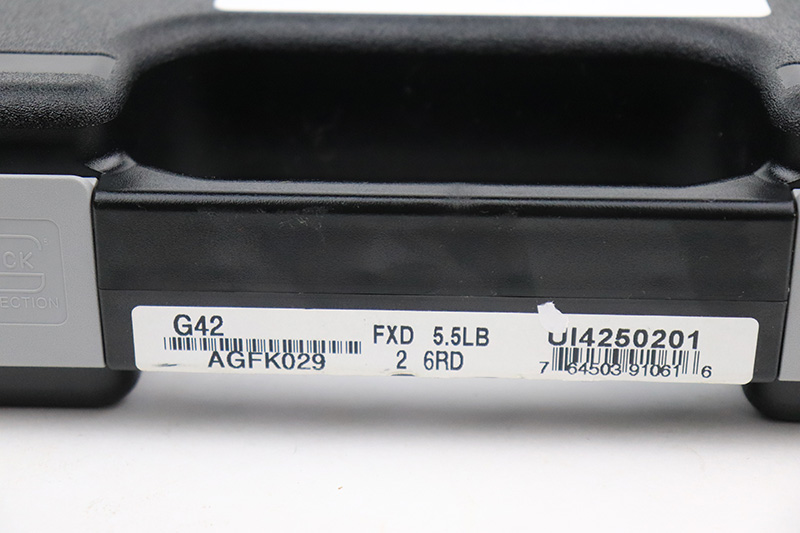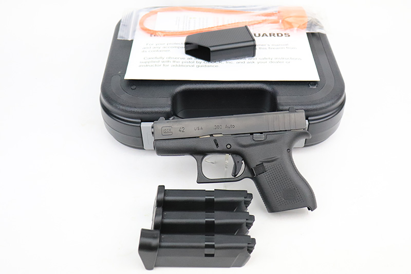 9/27/22 – This is a like-new example of a Glock 42 chambered in .380 ACP. It comes with its original matching-numbered hard case, two flat bottom magazines, one finger extension magazine, owners manual, cleaning brush, speed loading tool, and gun lock. It is in like-new condition with very no signs of wear or use. The bore is like-new. 3″ barrel.