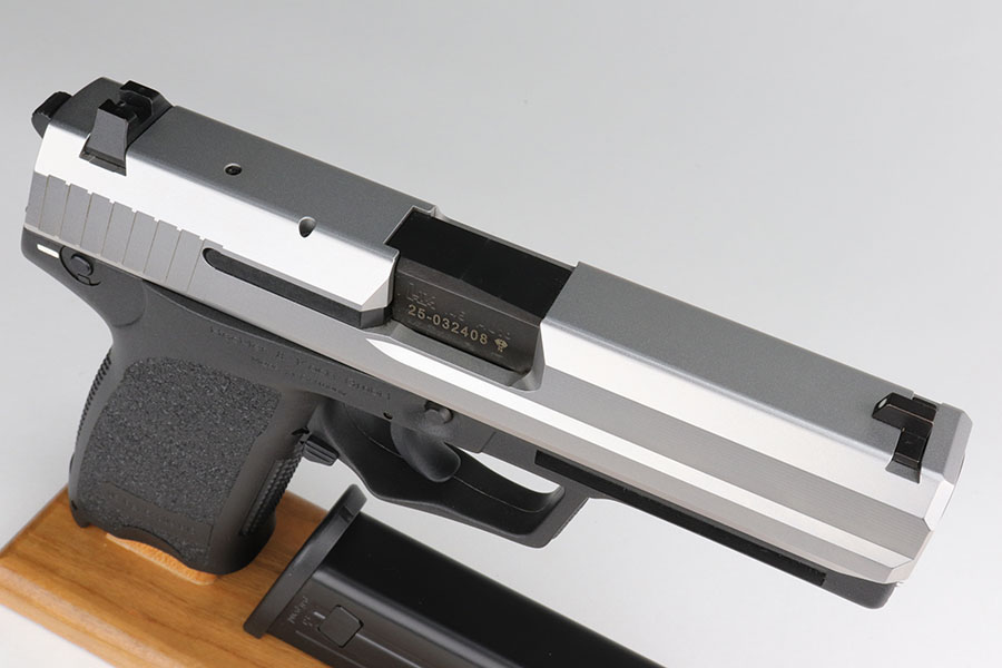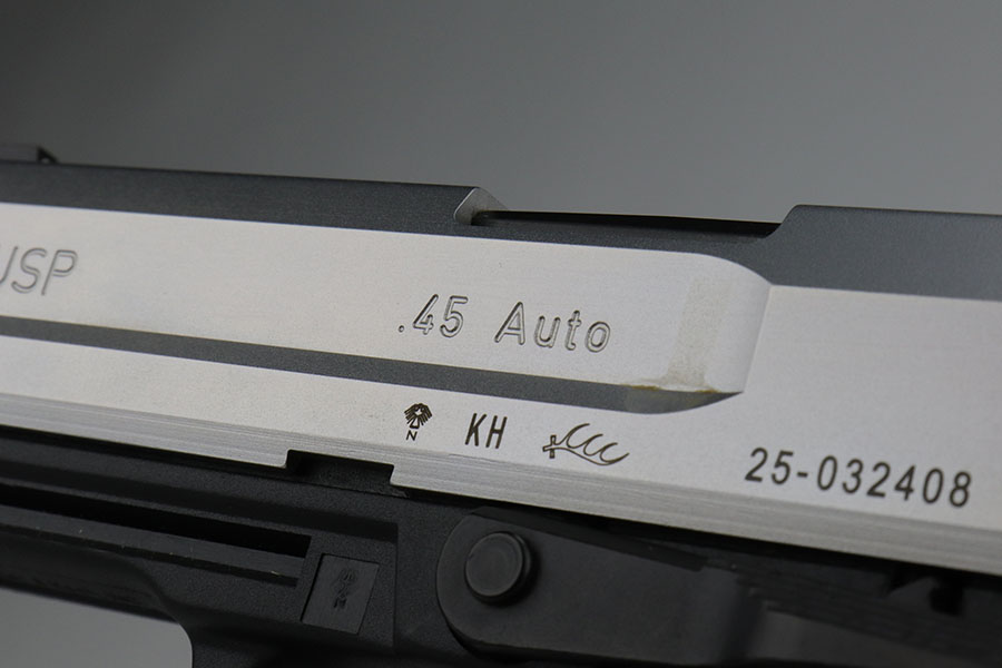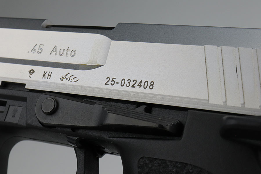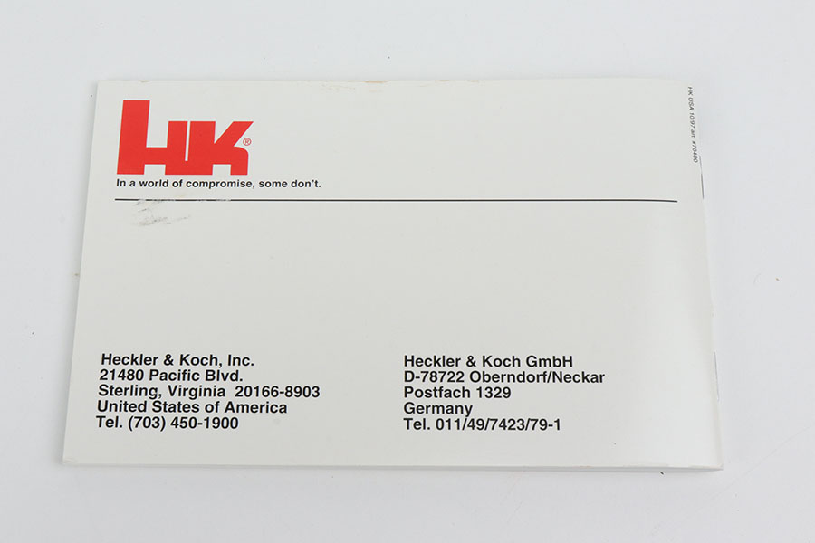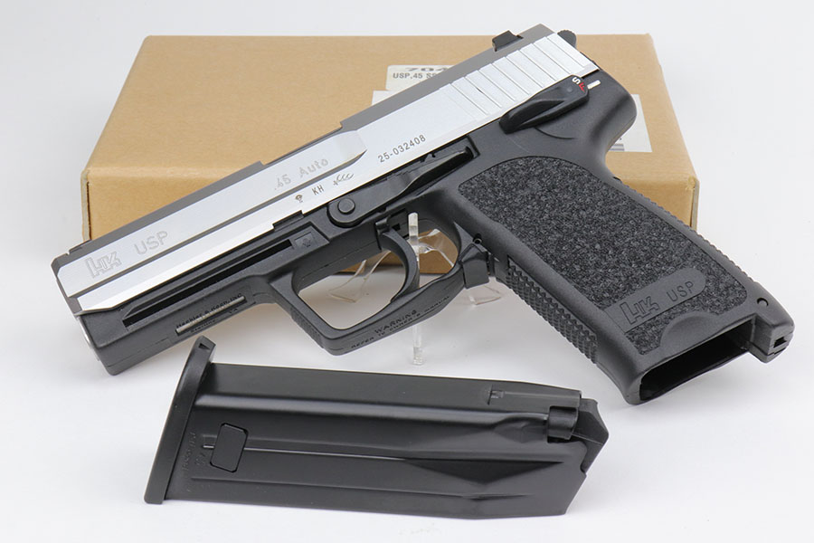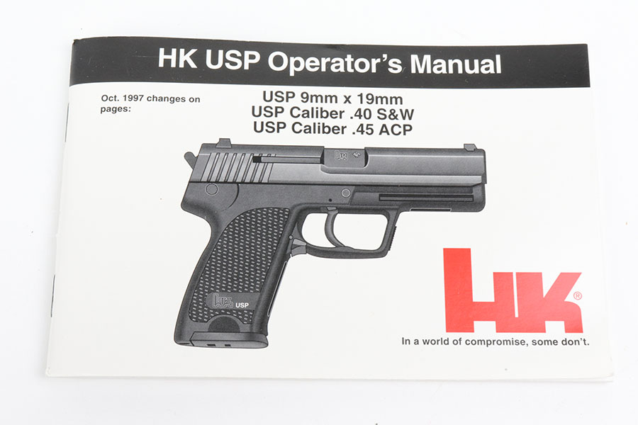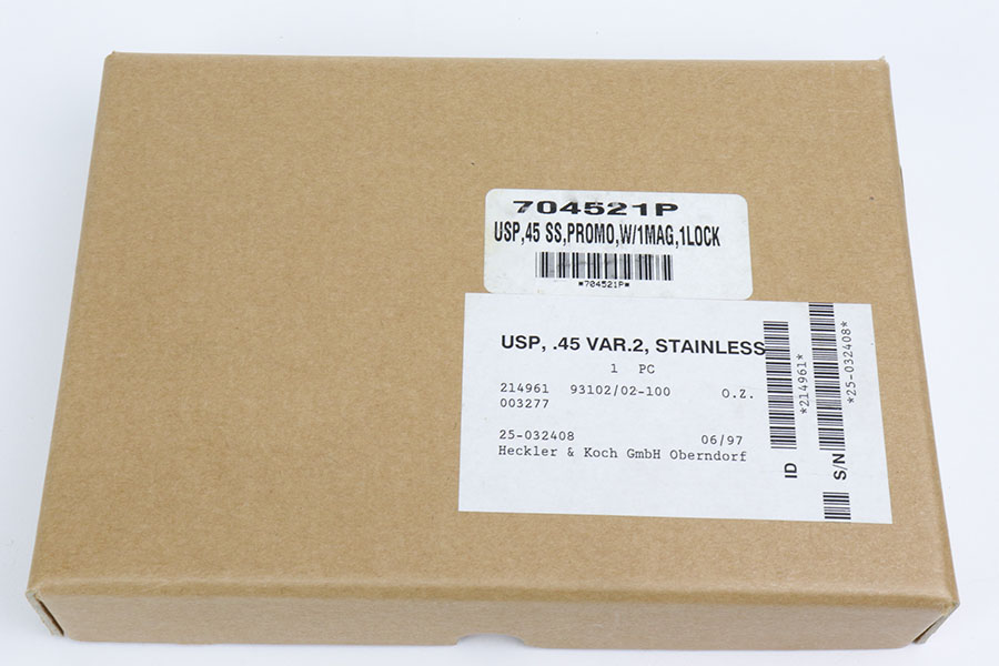 1/12/21 – This is a minty HK USP 45 in the original, matching box. It’s a stainless variation 2, as indicated on the label of the box. The pistol looks almost new, just a hint of wear on the barrel that’s visible through the ejection port. Date code on the pistol shows it was made in 1997, so FFL required. Box is numbered to the gun and includes an original manual. Stainless slide presents a nice visual contrast and were genuinely seen as more desirable to buyers/collectors.