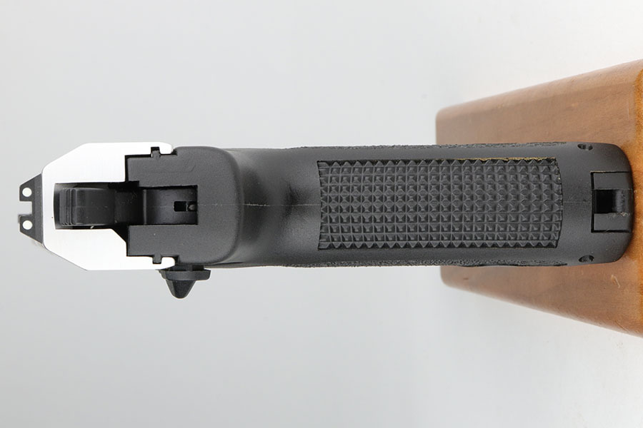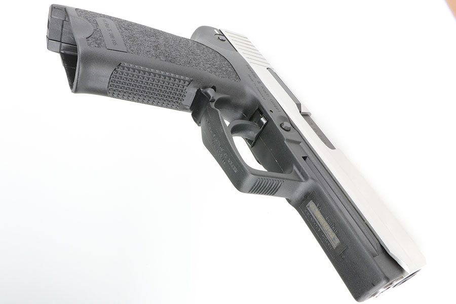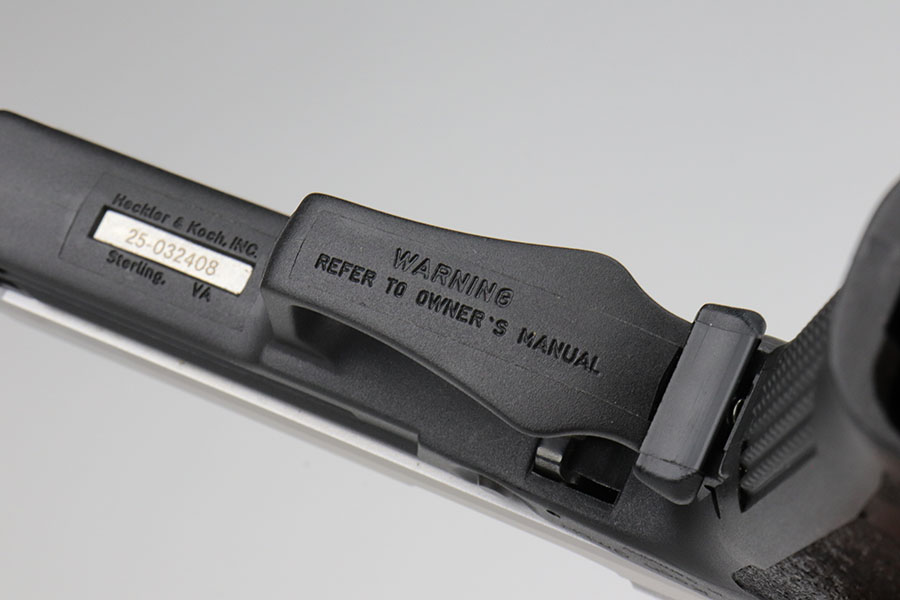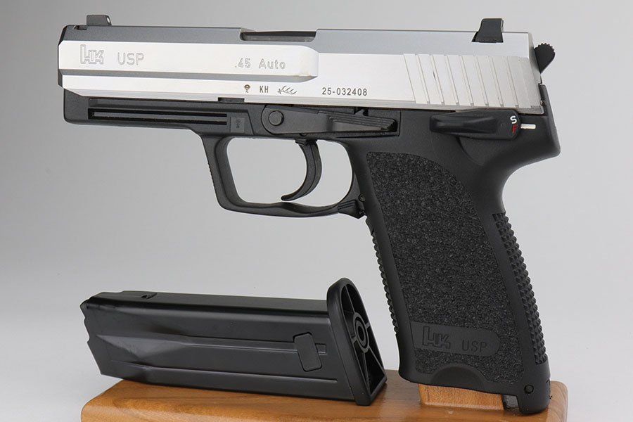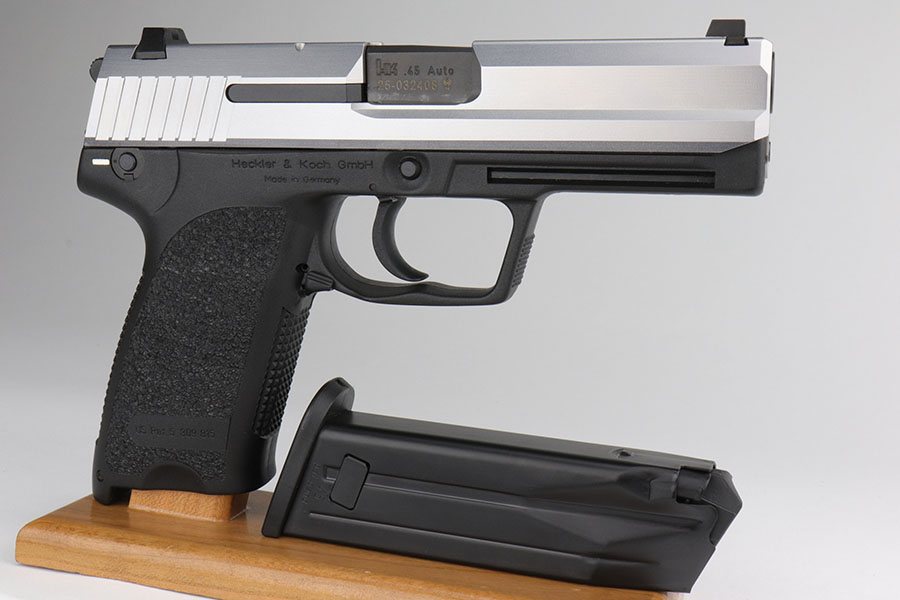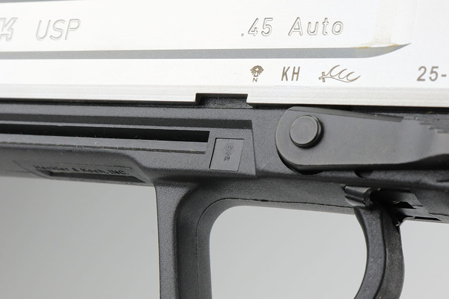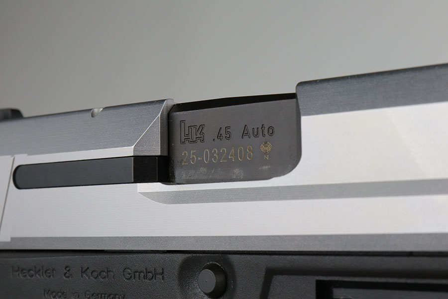 1/12/21 – This is a minty HK USP 45 in the original, matching box. It’s a stainless variation 2, as indicated on the label of the box. The pistol looks almost new, just a hint of wear on the barrel that’s visible through the ejection port. Date code on the pistol shows it was made in 1997, so FFL required. Box is numbered to the gun and includes an original manual. Stainless slide presents a nice visual contrast and were genuinely seen as more desirable to buyers/collectors.