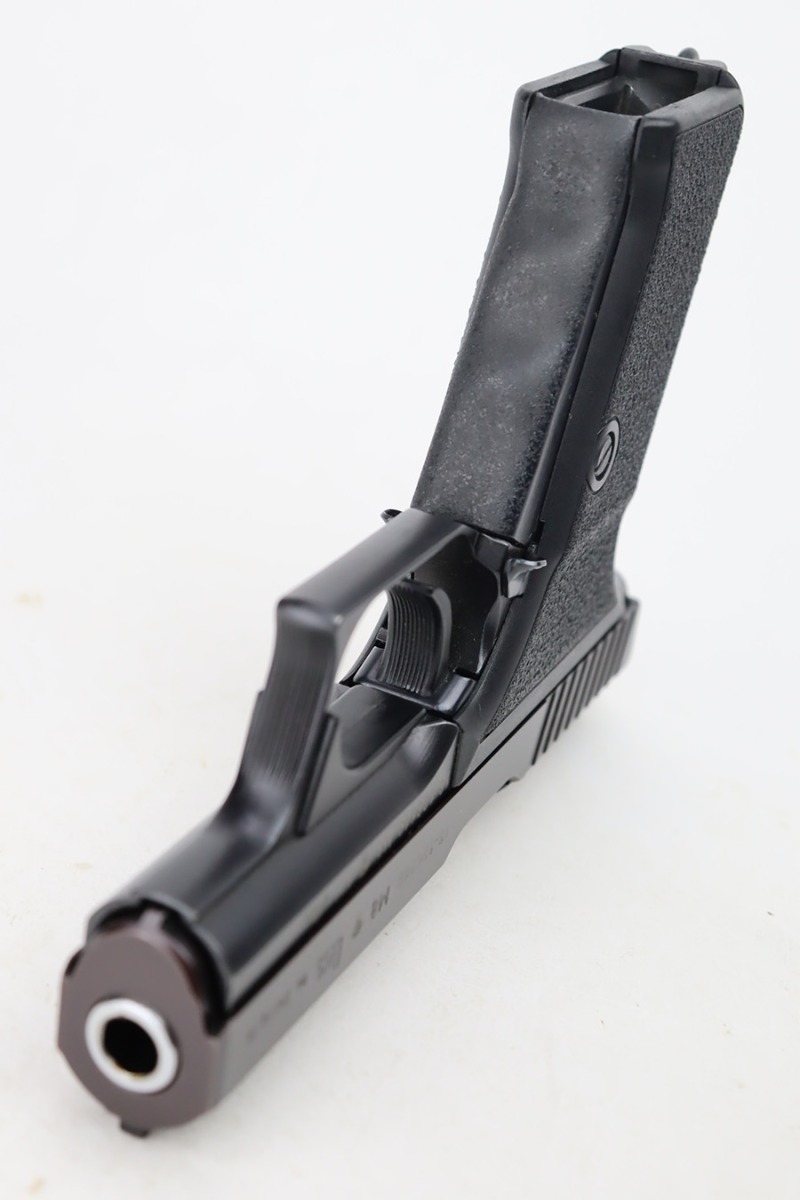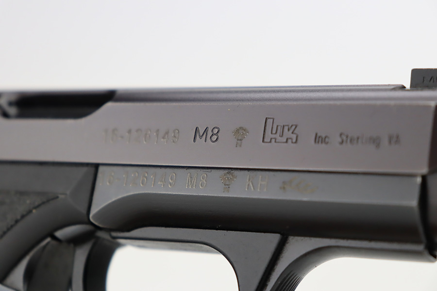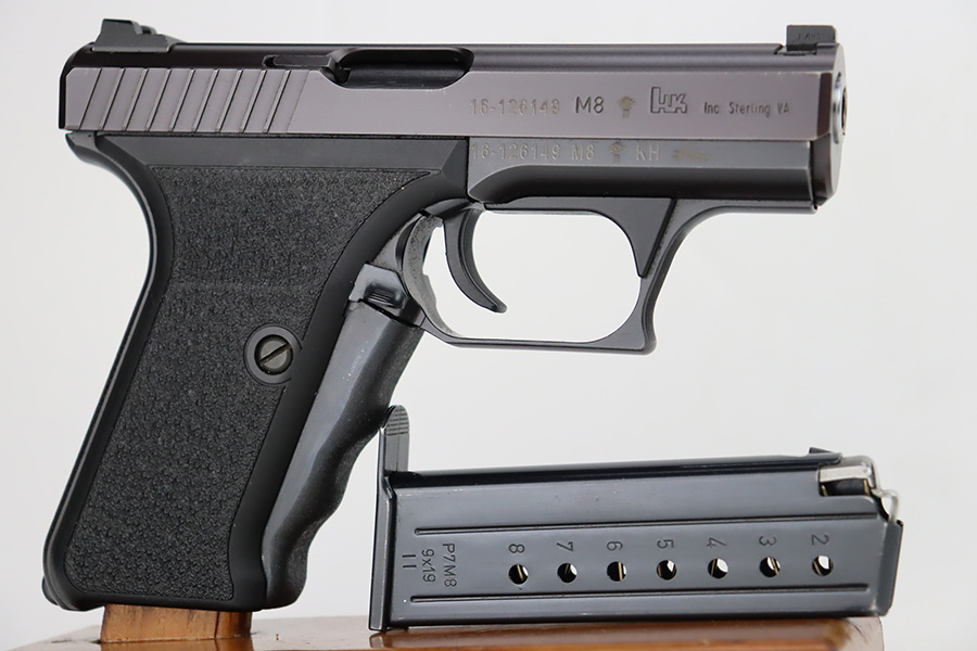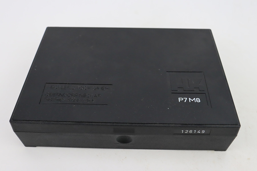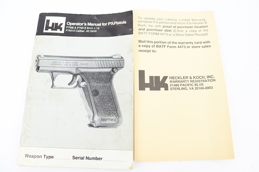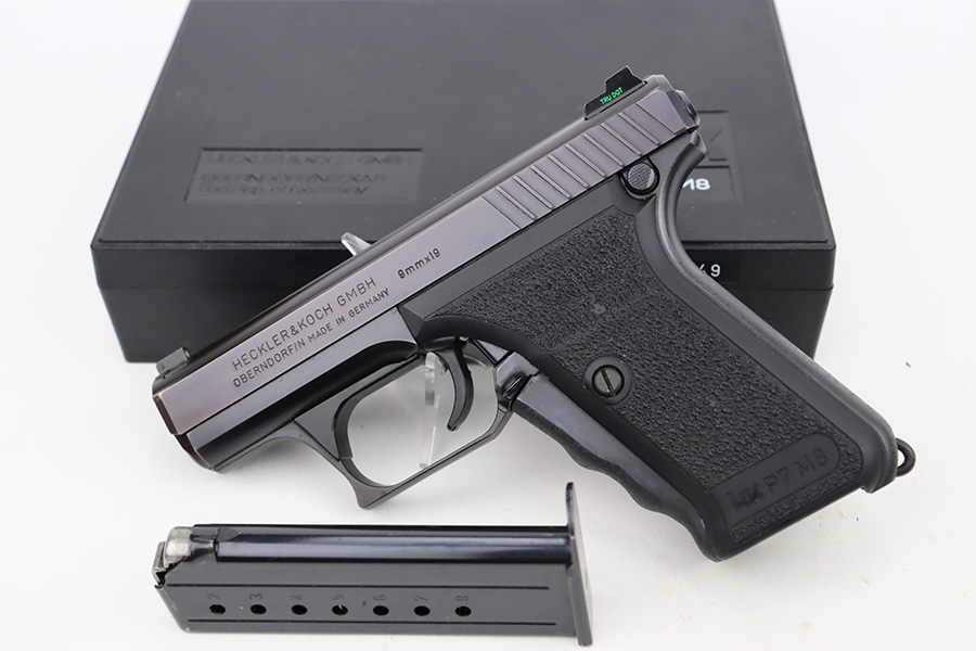 9/27/23 – This is a mint Heckler & Koch P7M8 in the original, matching box. The gun is in like-new condition with hardly any sign of use – just hints of wear around the muzzle and on the high edges. The factory hard case is numbered and matching to the gun and includes the original manual. Pistol is also date coded (HK) to 1997. Mint bore. FFL required. It is photographed with only one magazine, but it comes with two.