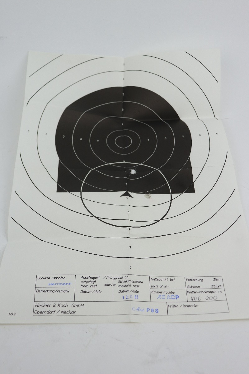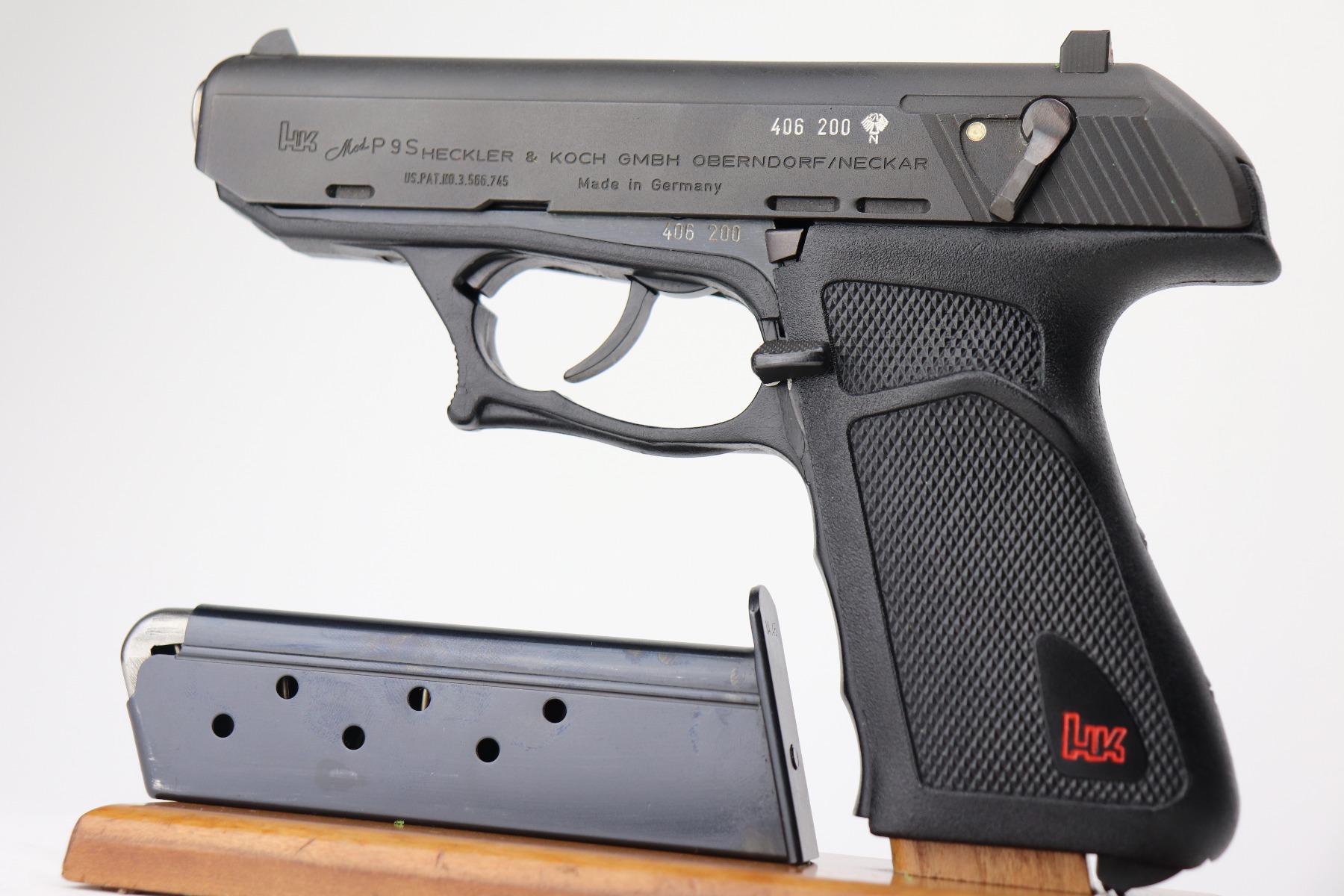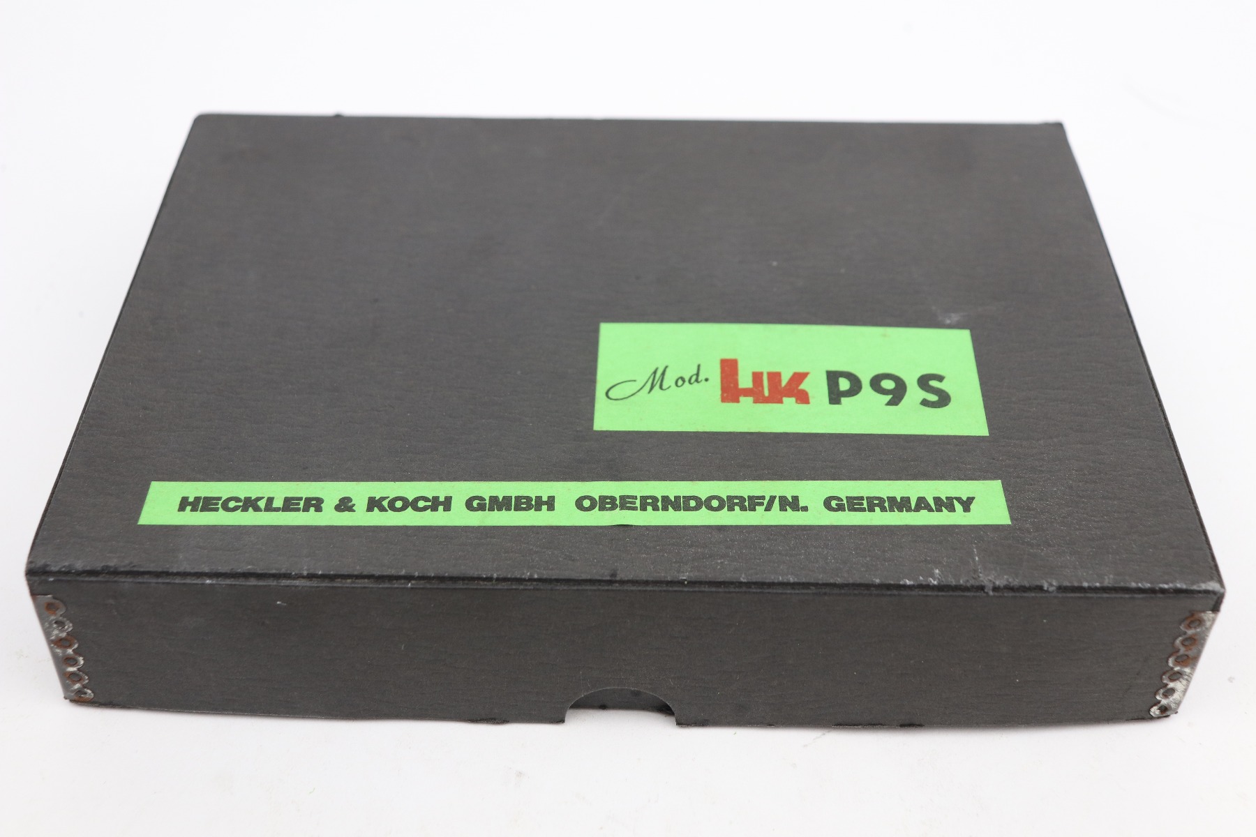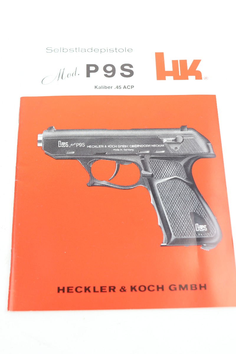 3/26/21 – This is a like-new example of an HK P9S semi auto pistol, chambered in .45. The .45acp examples are significantly less common than their 9mm production. It comes with an original box (hand-serialized to the gun), two magazines, an original owners manual, and original test target (serialized to the gun). The gun is all matching and is in like-new condition. The bore is stone-mint. Date code indicates this was made in 1982.