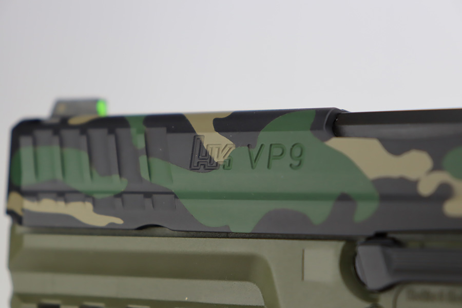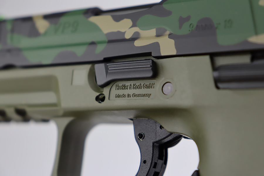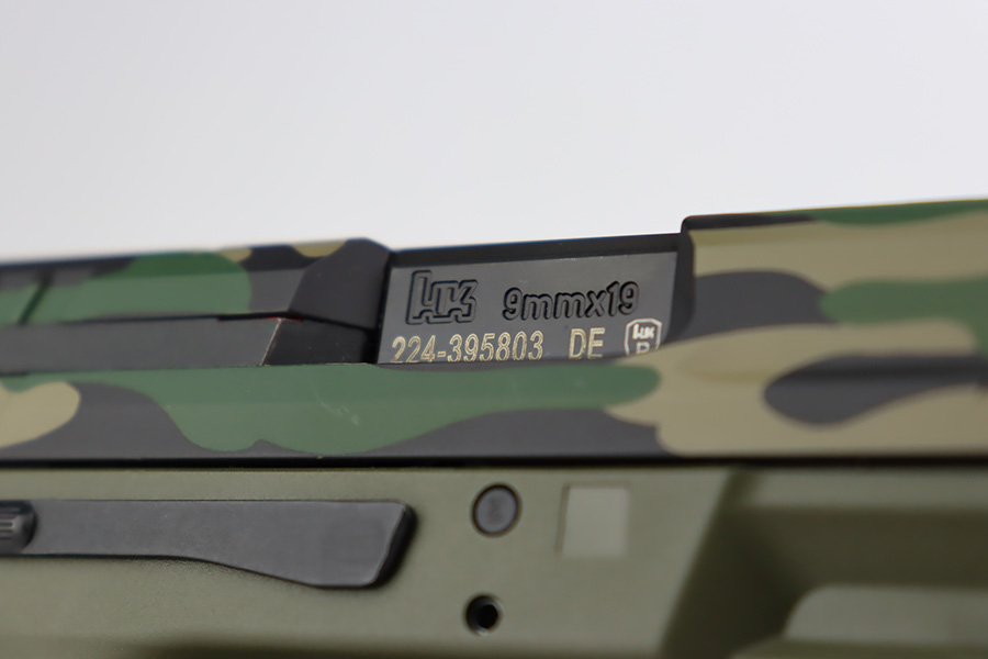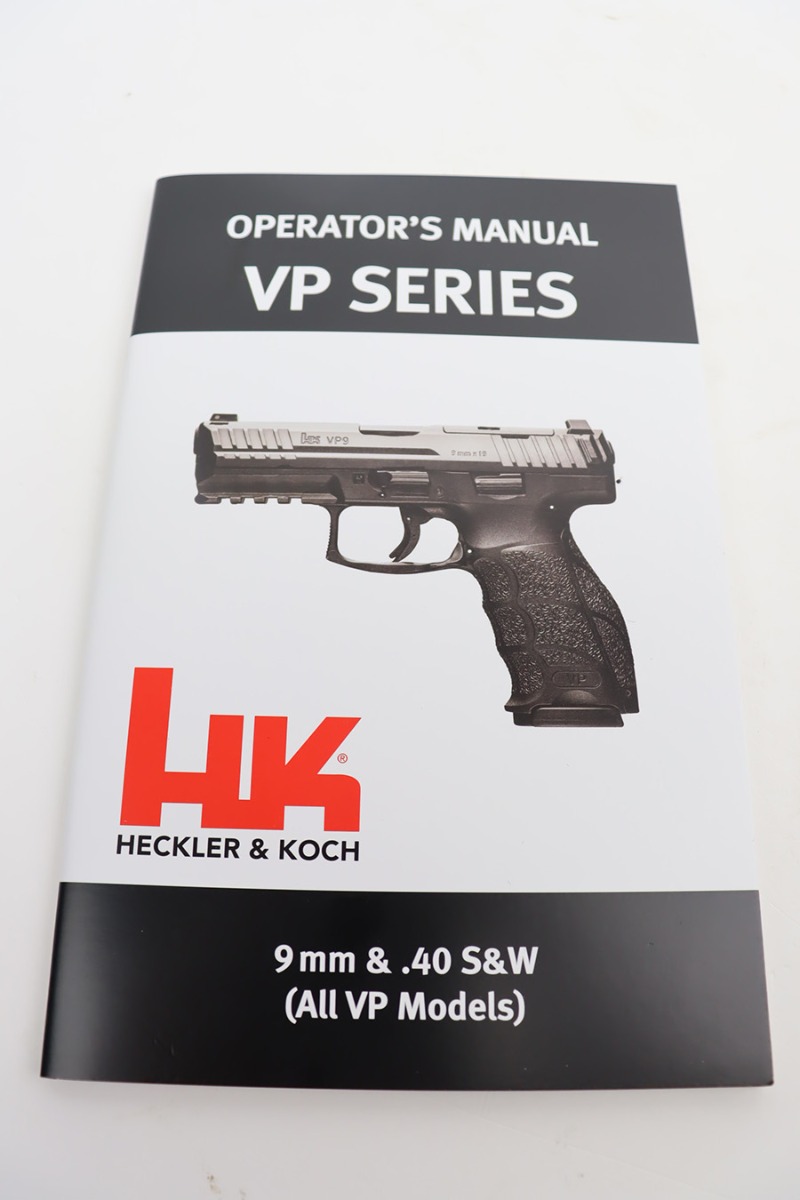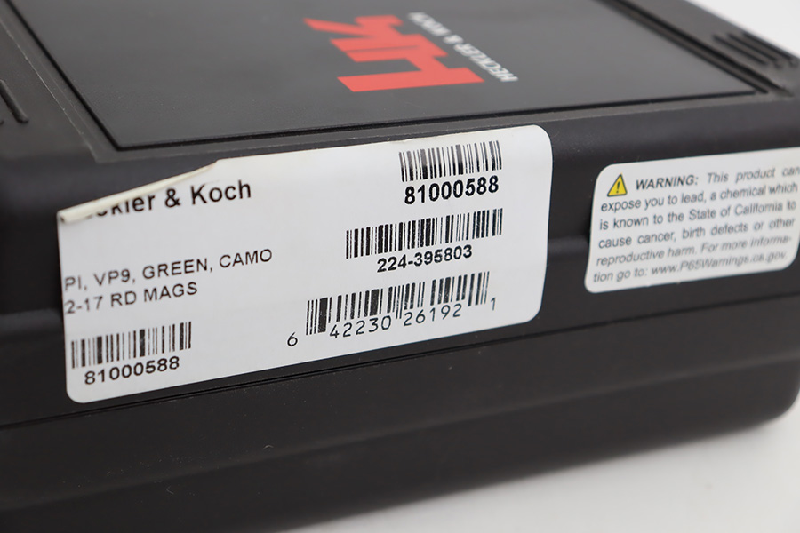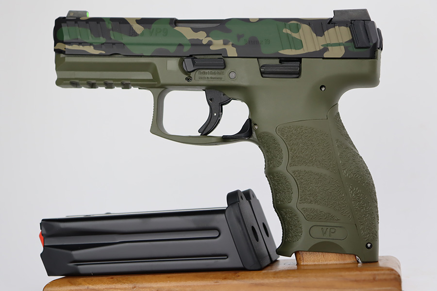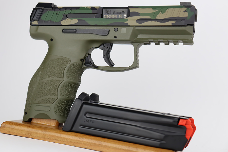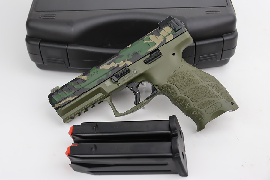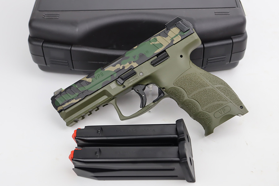 11/7/23 – This is a like-new H&K VP9 semi auto pistol, chambered in 9mm. Olive green frame with a camo-colored slide. It comes with its original matching-numbered hard case, owners manual, two magazines, spare grips, and a speed loading tool. No signs of wear or use. Mint bore.