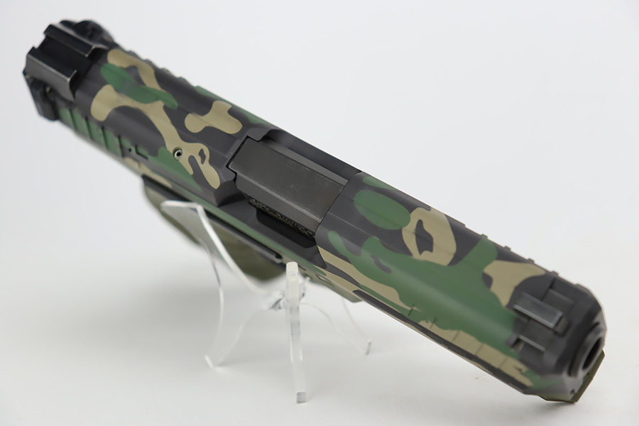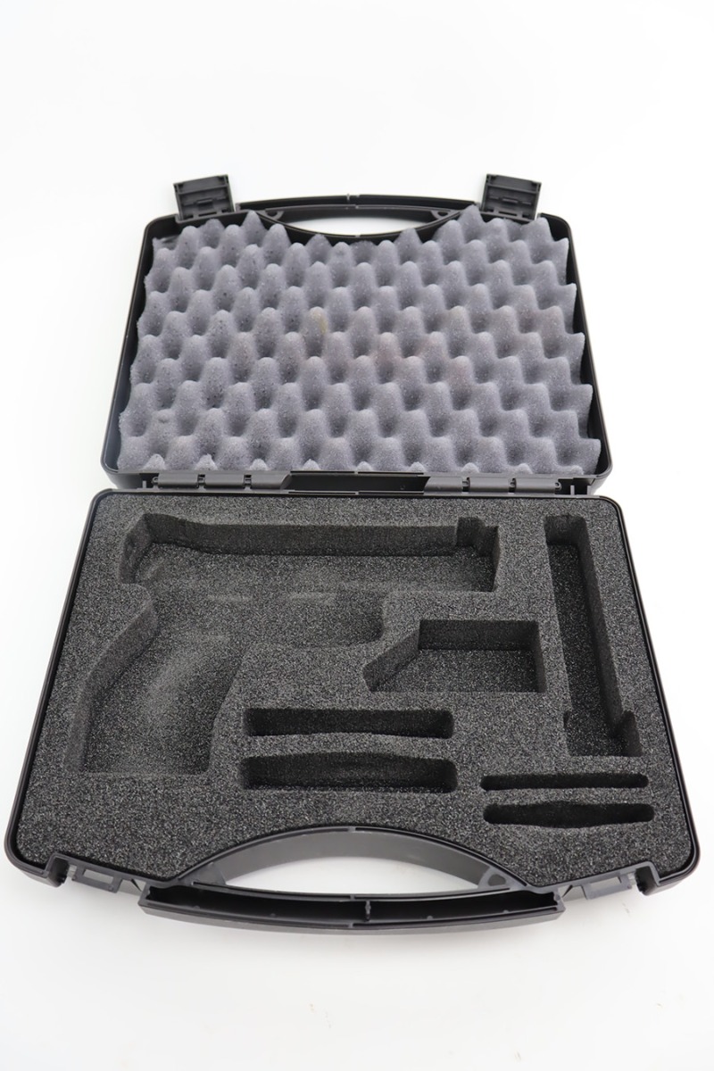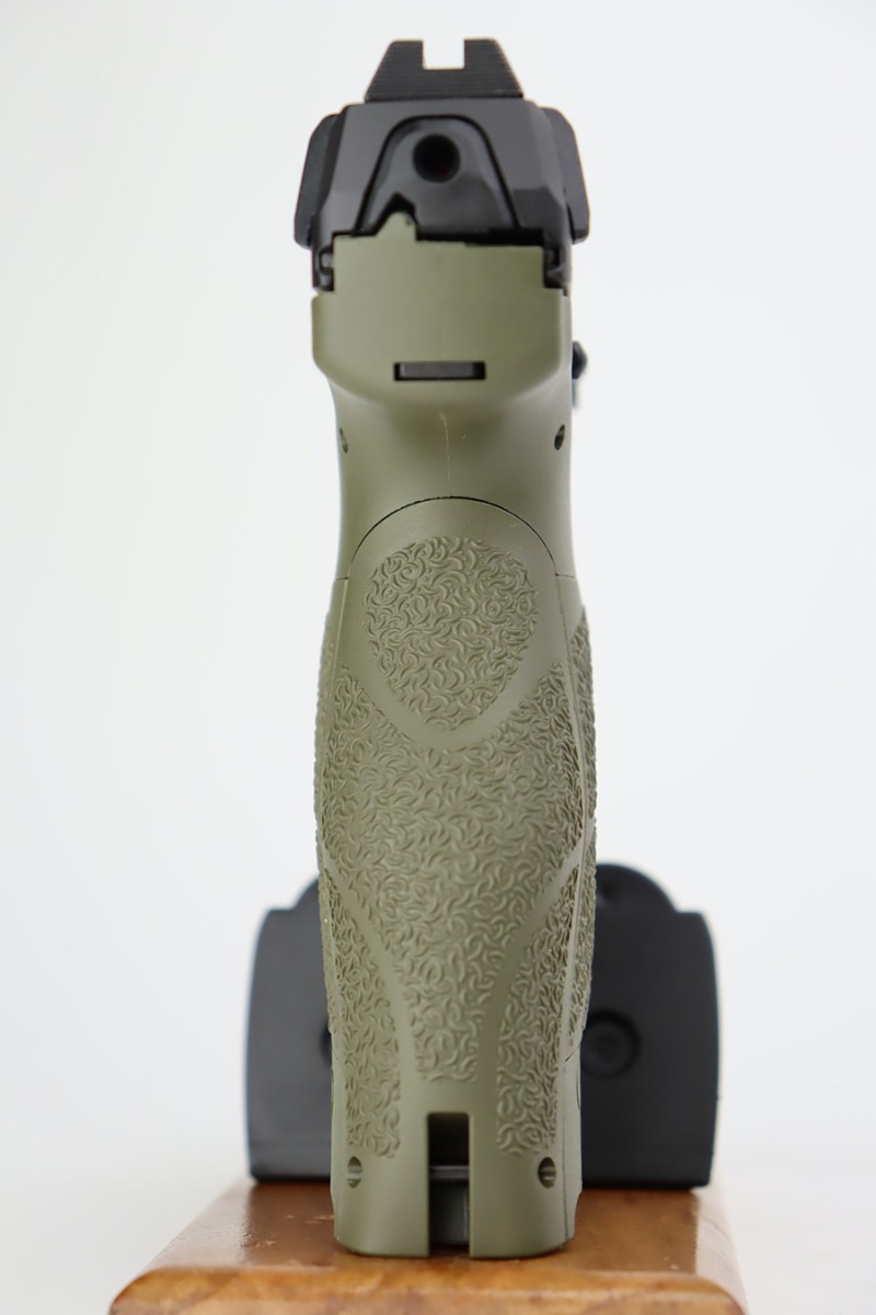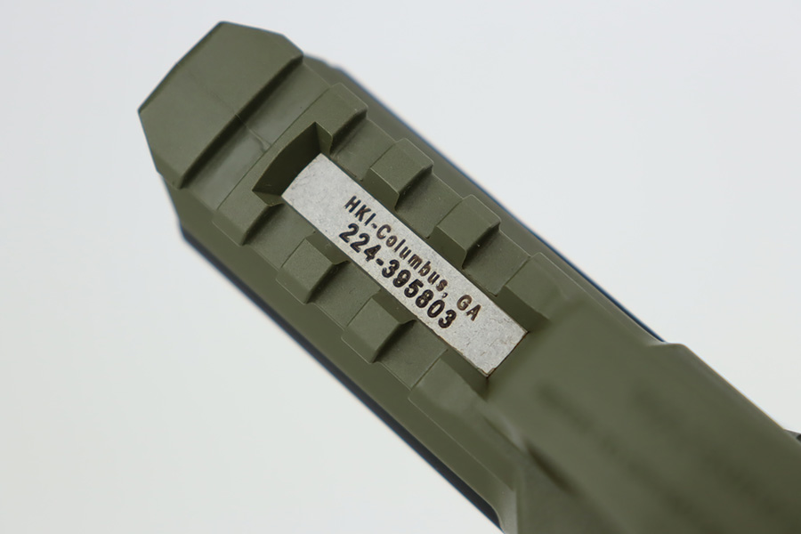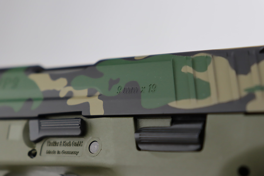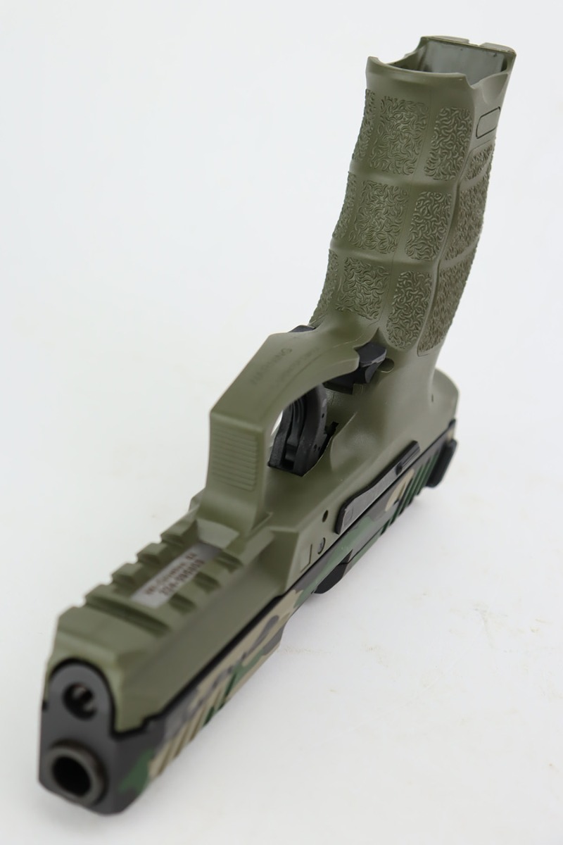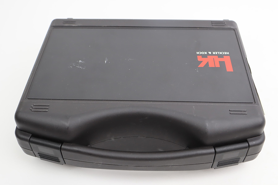11/7/23 – This is a like-new H&K VP9 semi auto pistol, chambered in 9mm. Olive green frame with a camo-colored slide. It comes with its original matching-numbered hard case, owners manual, two magazines, spare grips, and a speed loading tool. No signs of wear or use. Mint bore.