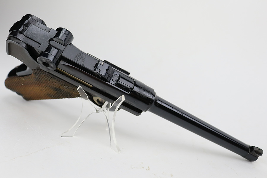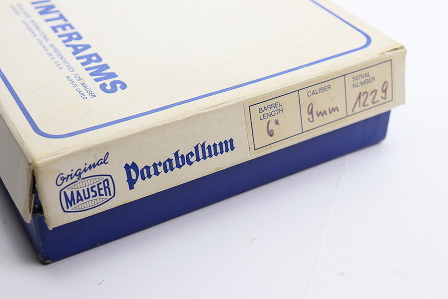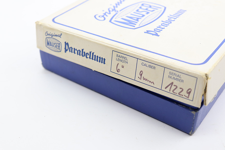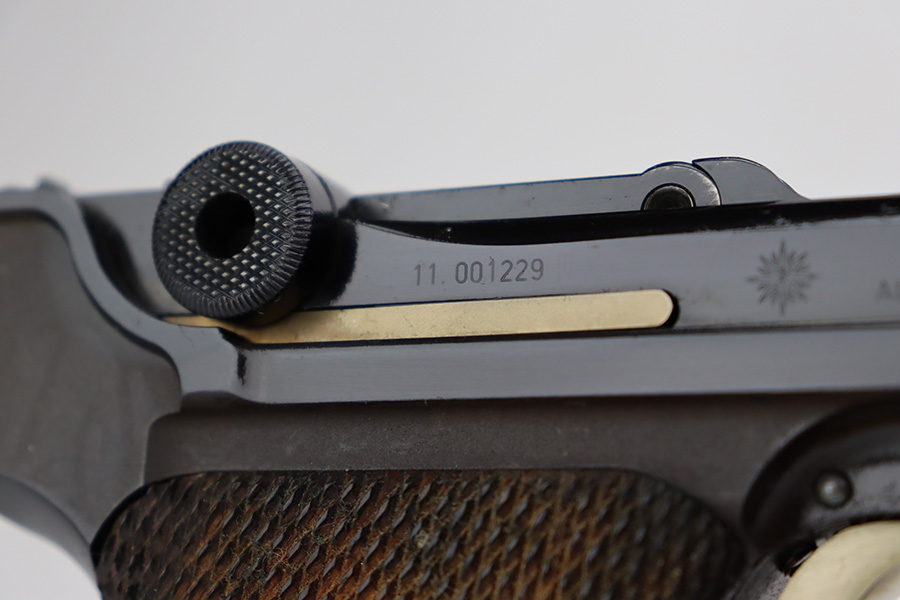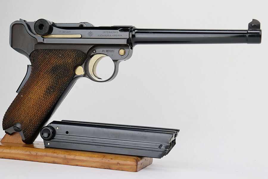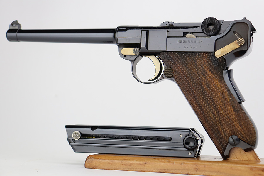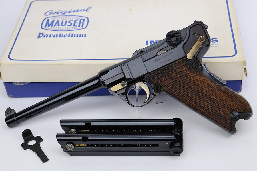 5/28/24 – This is a beautiful, unfired example of an “American Eagle” Luger made by Mauser/Interarms in 1971. It is in the Navy configuration, meaning a grip safety and a six inch barrel. It is all matching and features the American Eagle insignia on the chamber. It comes with the original matching-numbered cardboard box, matching-numbered test target, owners manual, Luger tool, cleaning rod, and two magazines. The gun is in like-new condition. Mint bore and wood grips.