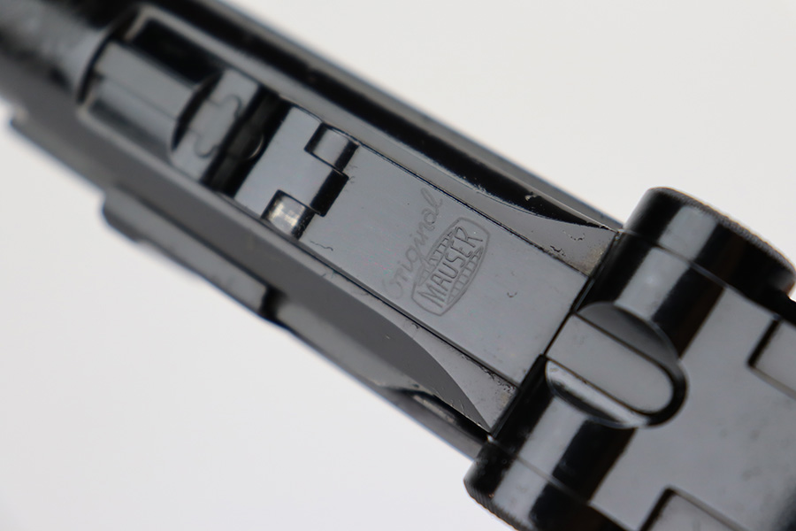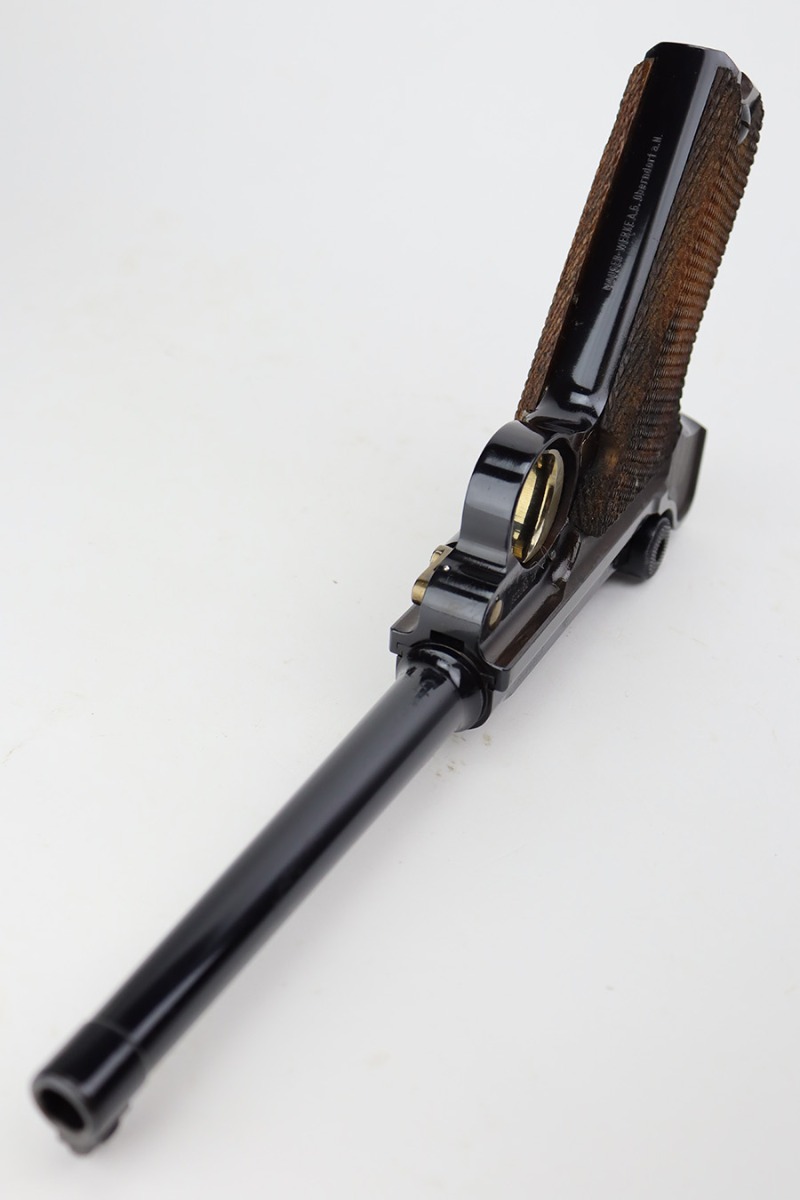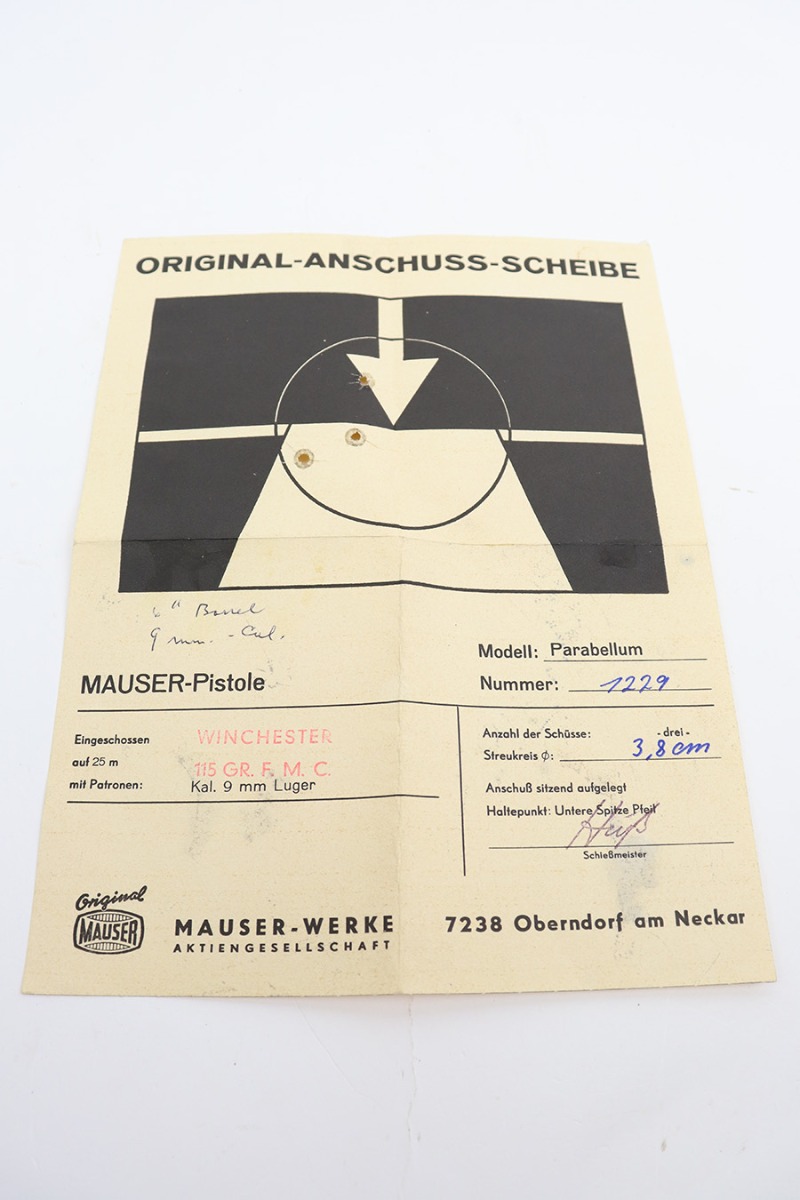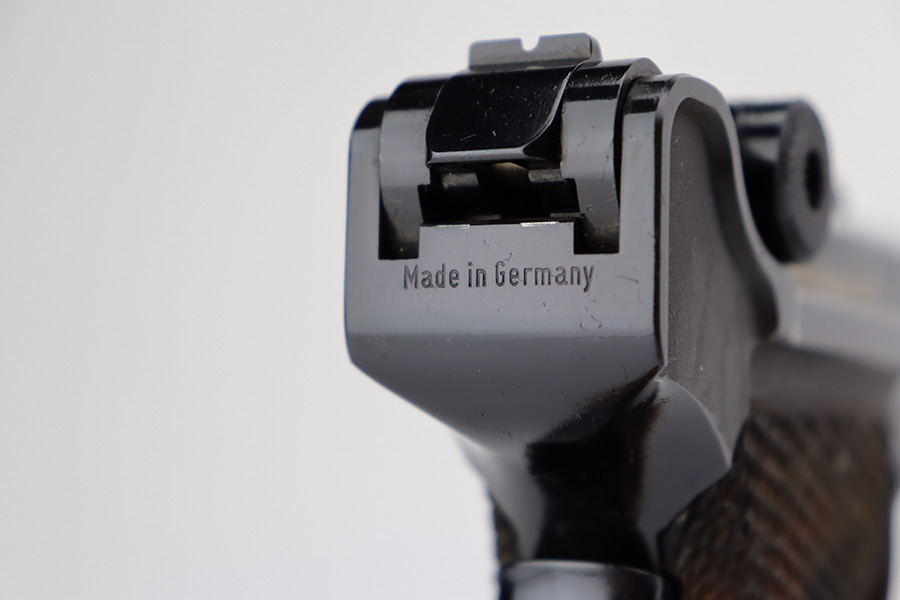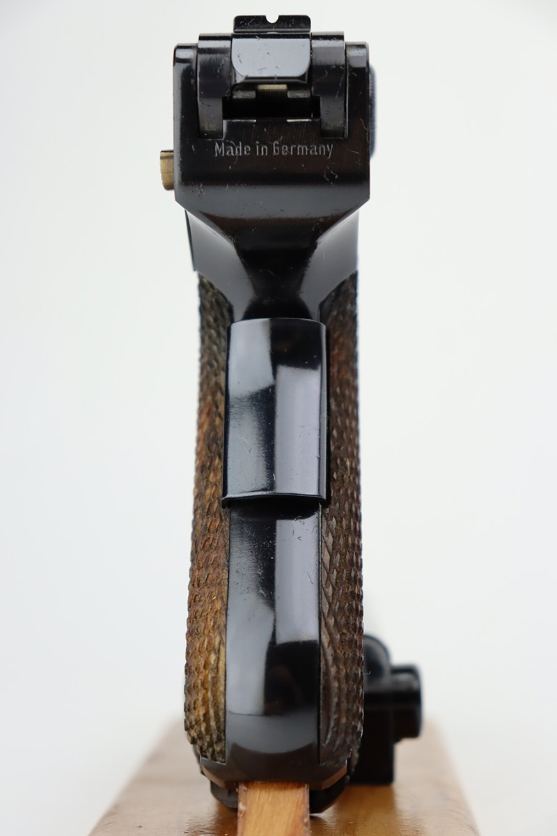5/28/24 – This is a beautiful, unfired example of an “American Eagle” Luger made by Mauser/Interarms in 1971. It is in the Navy configuration, meaning a grip safety and a six inch barrel. It is all matching and features the American Eagle insignia on the chamber. It comes with the original matching-numbered cardboard box, matching-numbered test target, owners manual, Luger tool, cleaning rod, and two magazines. The gun is in like-new condition. Mint bore and wood grips.