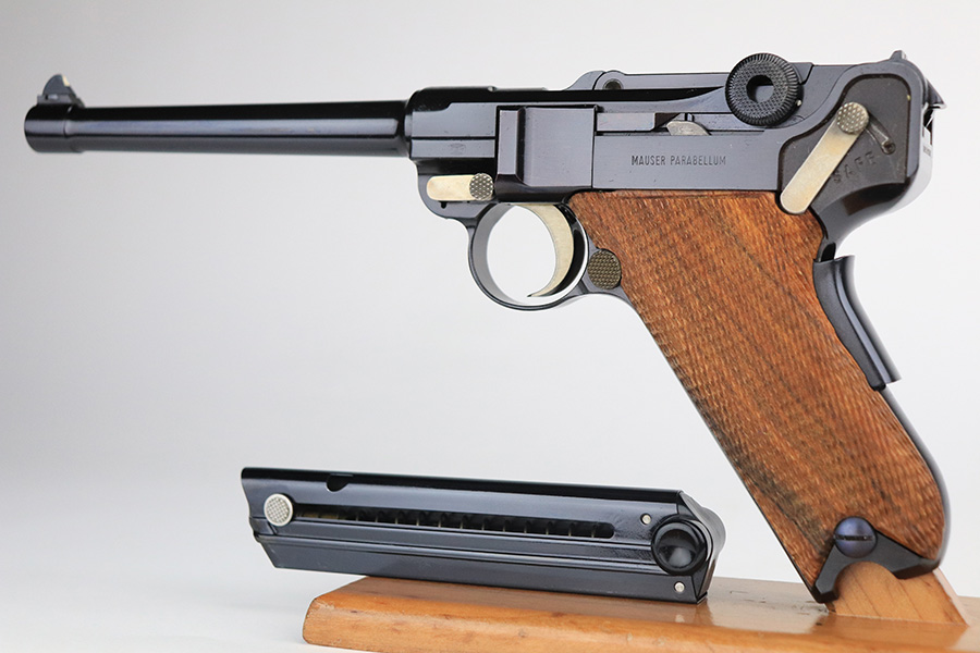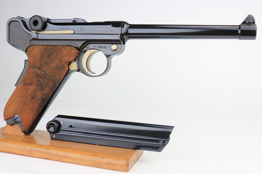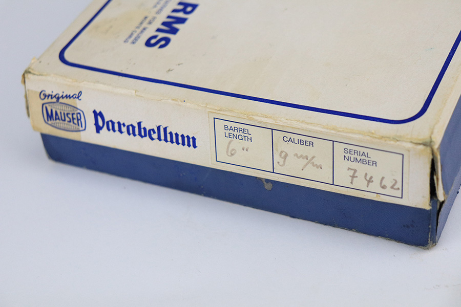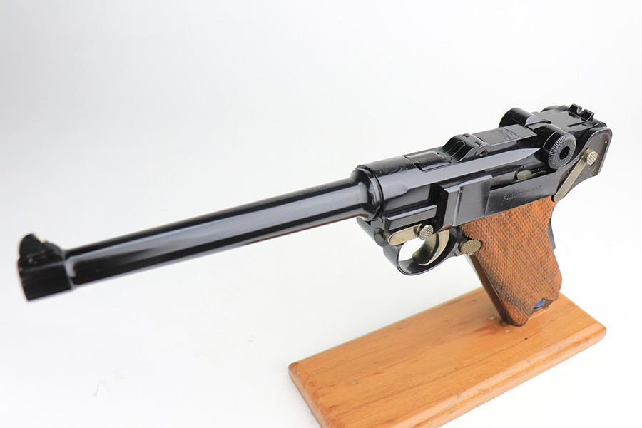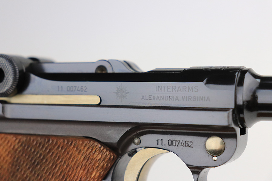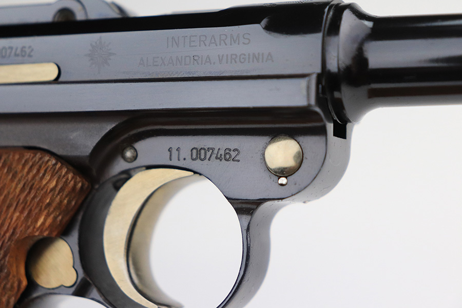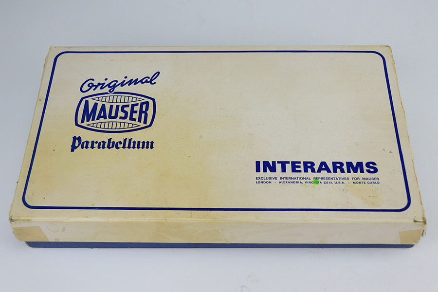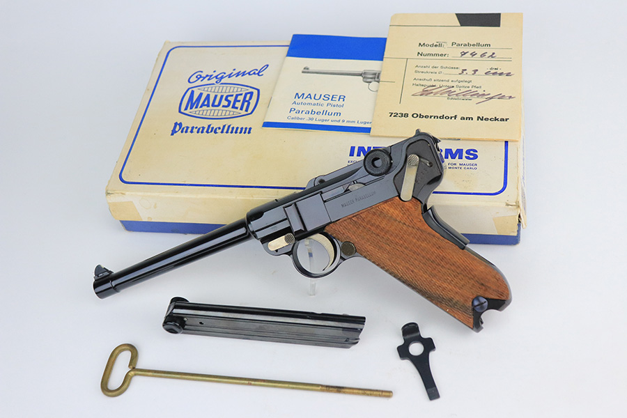 1/24/22 – This is a mint Interarms Mauser Luger from ~1972 in the original, matching box. These were part of a limited production run done by Mauser in conjunction with Interarms, and were manufactured in several variations. Most feature an American Eagle crest over the chamber, including this one. Fewer were produced with Navy-style configuration, meaning grip safety and 6in barrel. This gun appears to be in nearly unfired condition with a mint bore. It comes in the matching numbered box, and includes the original, matching test target. Box also includes a cleaning rod, takedown tool and manual. Appears this gun was made in 1972 so we will accept a C&R in relevant states.