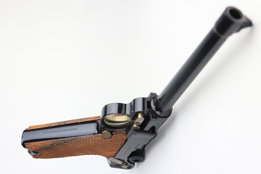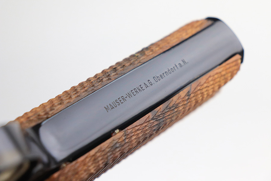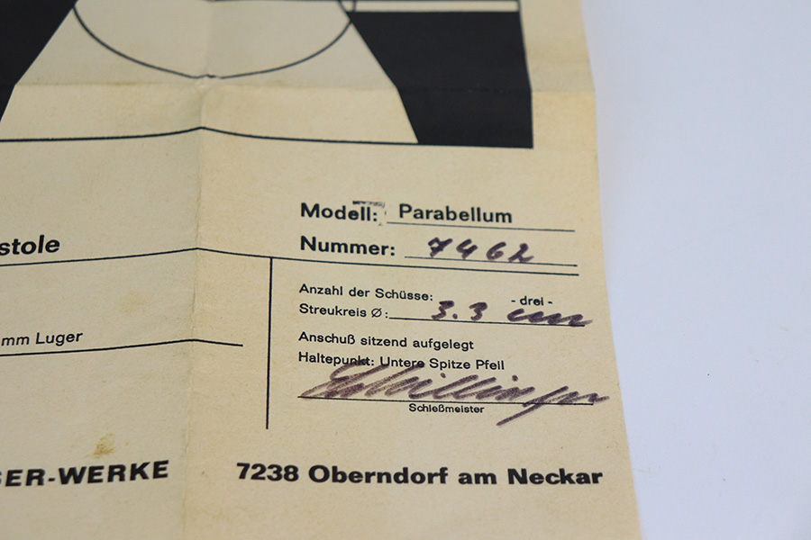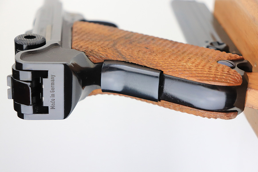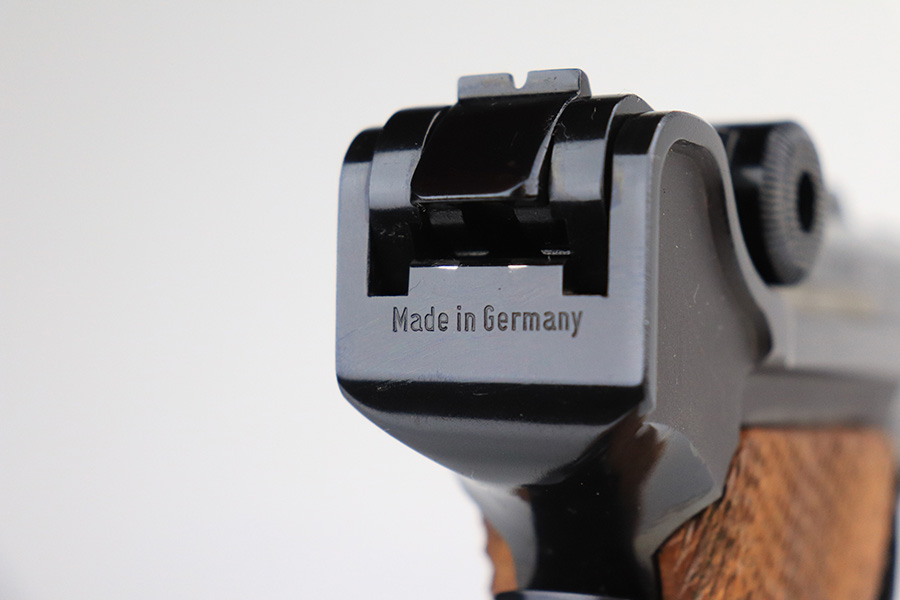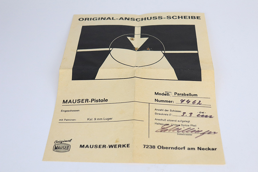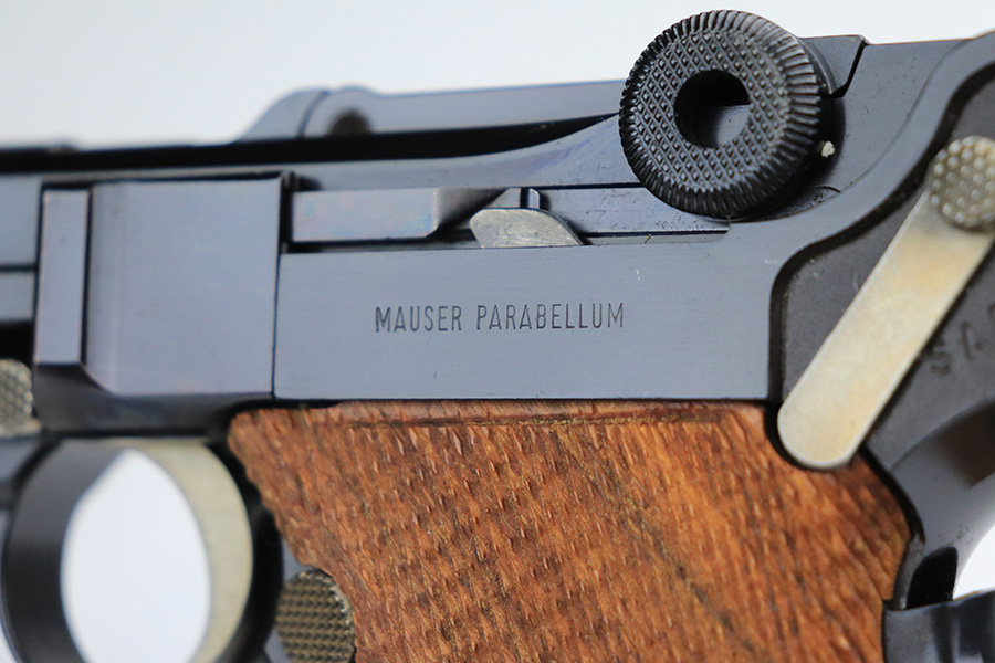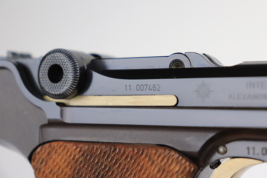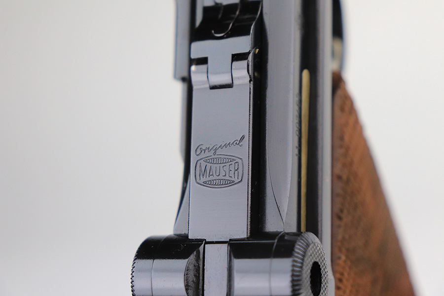 1/24/22 – This is a mint Interarms Mauser Luger from ~1972 in the original, matching box. These were part of a limited production run done by Mauser in conjunction with Interarms, and were manufactured in several variations. Most feature an American Eagle crest over the chamber, including this one. Fewer were produced with Navy-style configuration, meaning grip safety and 6in barrel. This gun appears to be in nearly unfired condition with a mint bore. It comes in the matching numbered box, and includes the original, matching test target. Box also includes a cleaning rod, takedown tool and manual. Appears this gun was made in 1972 so we will accept a C&R in relevant states.