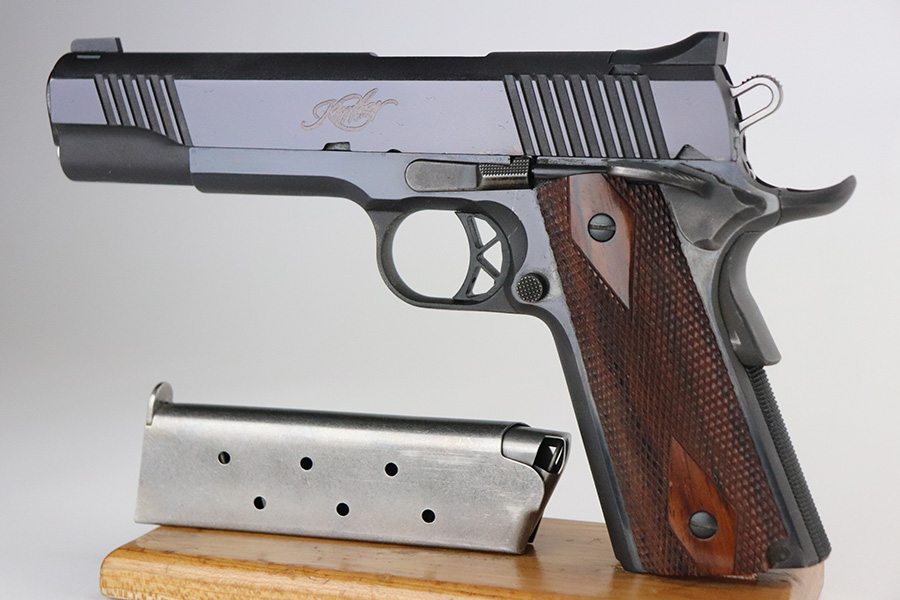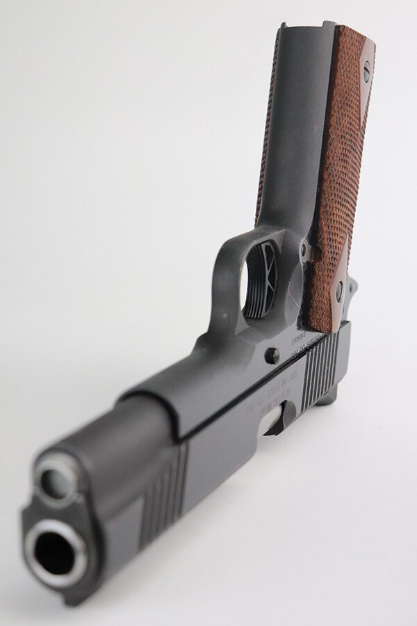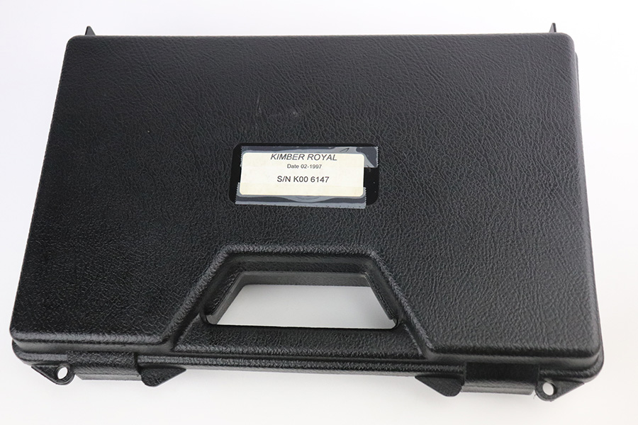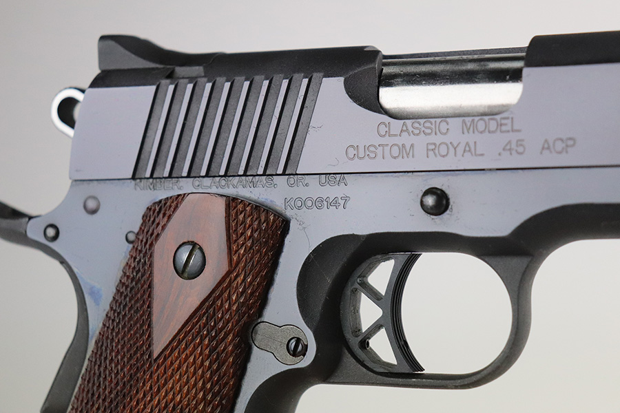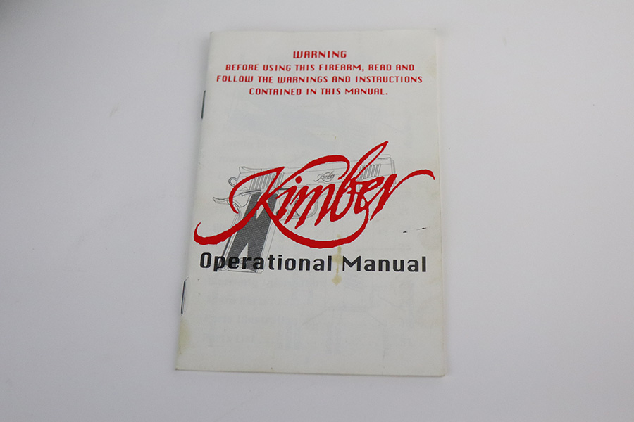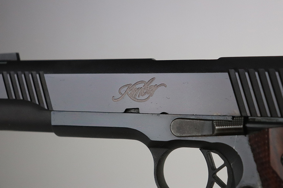 7/15/21 – This is a like-new example of a Kimber Classic Custom Model 1911. It comes with the original matching hard case, owners manual, cleaning rods, and two magazines. This pistol is rollmarked “Clackamas, Oregon” on the frame. Only the first 7,000 or so pistols had the Clackamas marking before it was changed to “Yonkers”. This one is in like-new condition with just a few very light surface scuffs here and there. A light scratch around the takedown lever. It has a a lightweight aluminum match grade trigger and excellent grips. Mint bore.