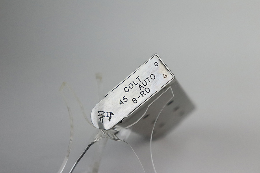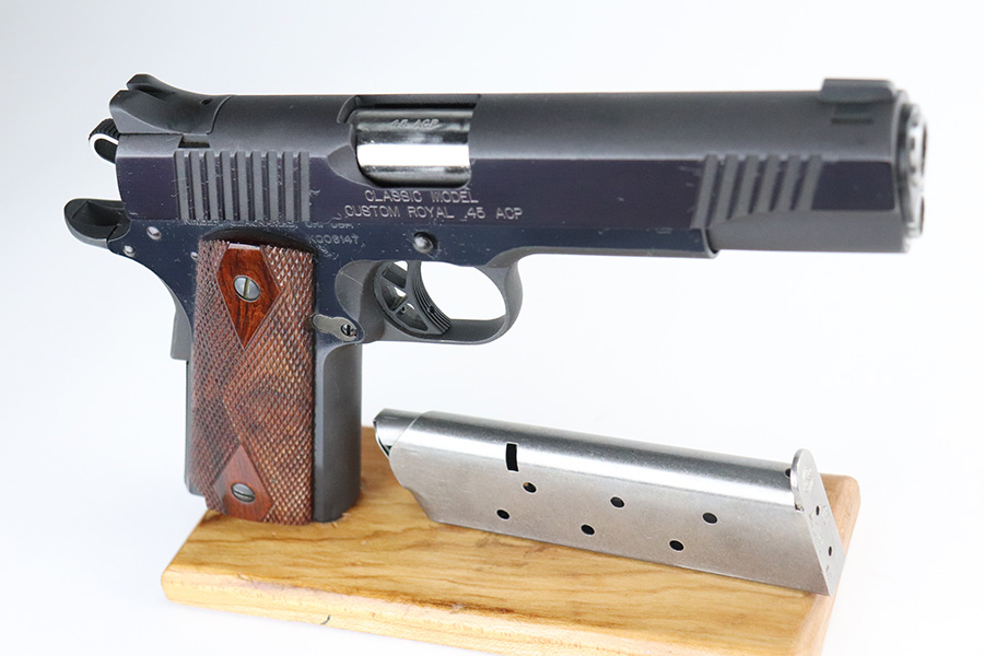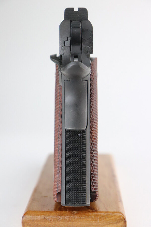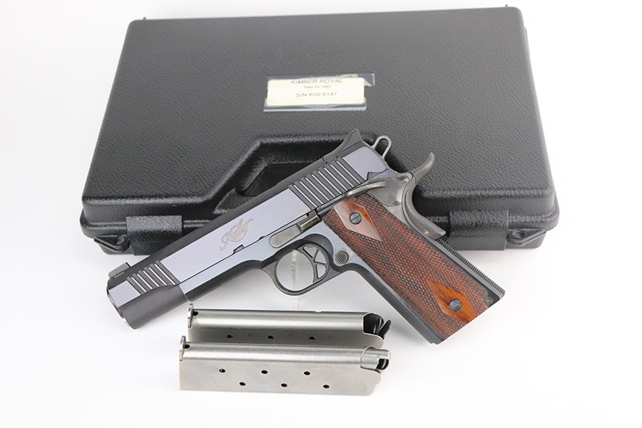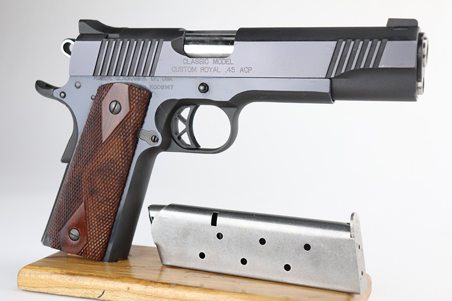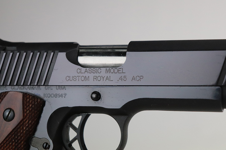 7/15/21 – This is a like-new example of a Kimber Classic Custom Model 1911. It comes with the original matching hard case, owners manual, cleaning rods, and two magazines. This pistol is rollmarked “Clackamas, Oregon” on the frame. Only the first 7,000 or so pistols had the Clackamas marking before it was changed to “Yonkers”. This one is in like-new condition with just a few very light surface scuffs here and there. A light scratch around the takedown lever. It has a a lightweight aluminum match grade trigger and excellent grips. Mint bore.