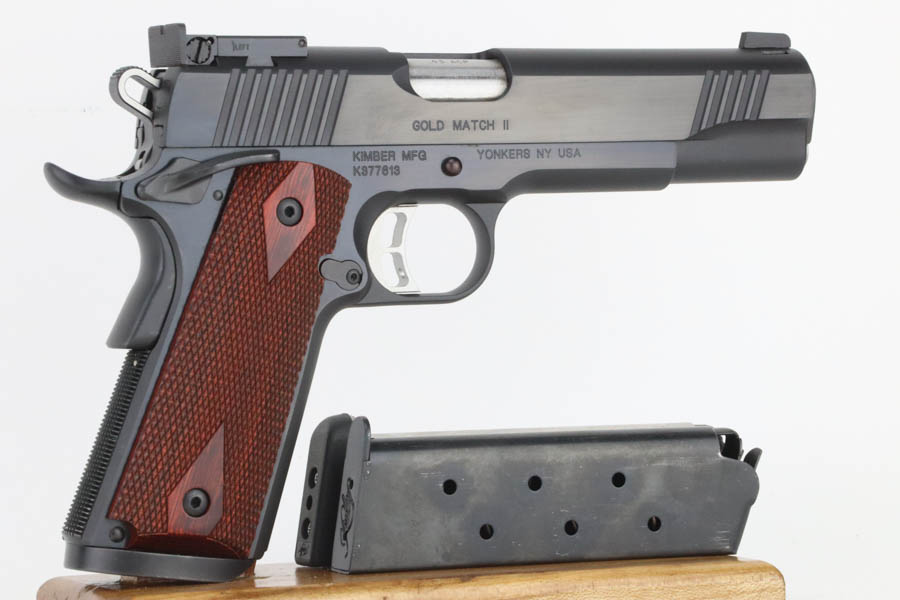 08/19/2024 – For sale is a Kimber 1911 Gold Match II with its original factory box. This pistol is in excellent condition and looks brand new. The pistol has a very nice polished blued finish with no wear. The wood grips are also just as excellent. The pistol has a bright bore with great rifling. The pistol comes with its original matching box, 2 spare grips, and a spare magazine.