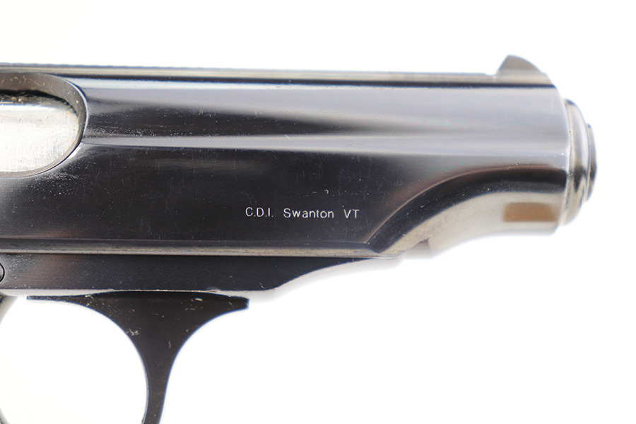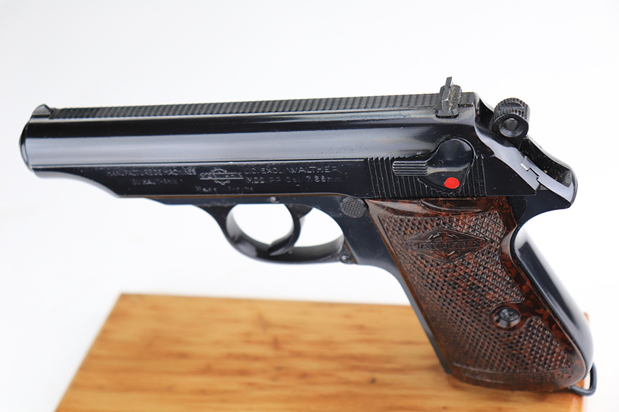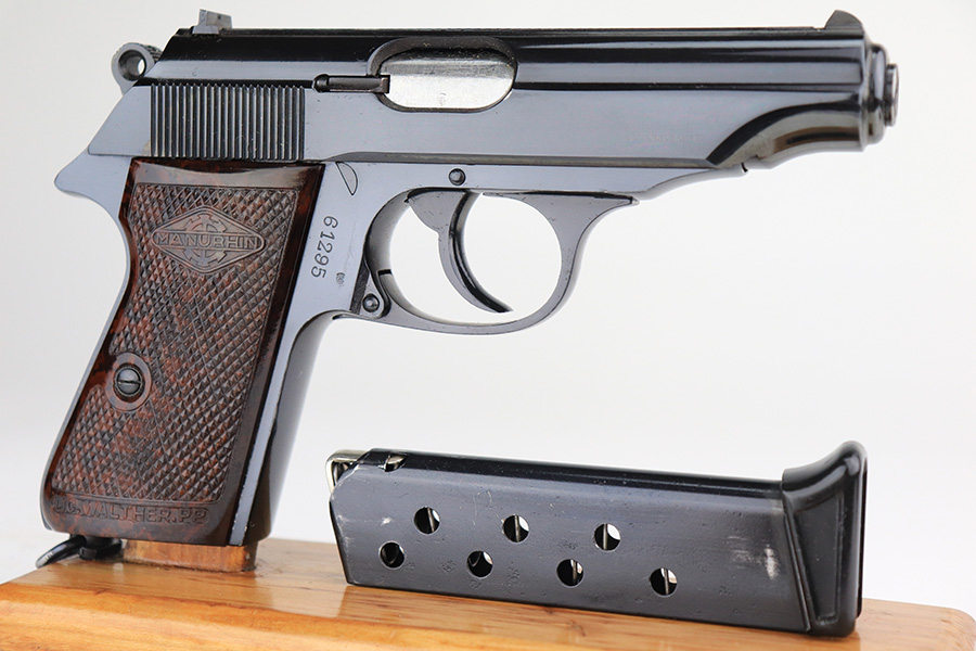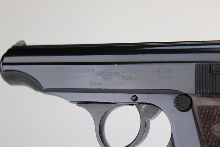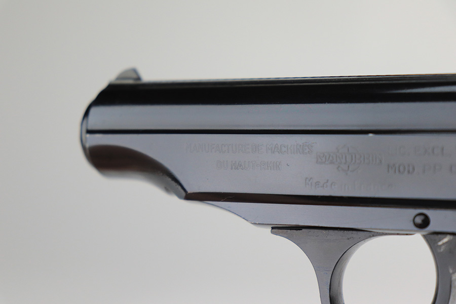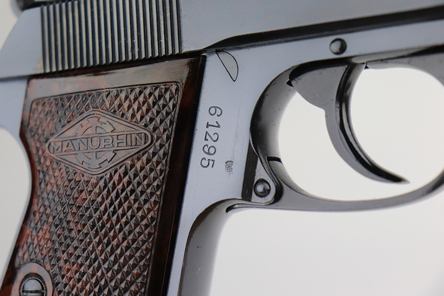 12/3/21 – This is a mint example of a French Manurhin Walther PP likely made in about the 1960’s. The gun is completely matching and has a rectangular lanyard loop on the base of the frame, indicating it was issued to the Danish police. Small import mark on the right side of the slide. It comes with a period-correct box (serial number is scratched off), an owners manual, cleaning rod, and two proper finger extension magazines. The gun has retained about 99% of its finish. There are a few tiny handling marks on the front strap, a light scratch on the right side of the frame, and very minor wear on the edges of the back strap. Comes with excellent reddish Manurhin grips. The bore is mint.