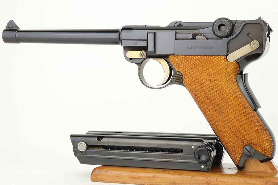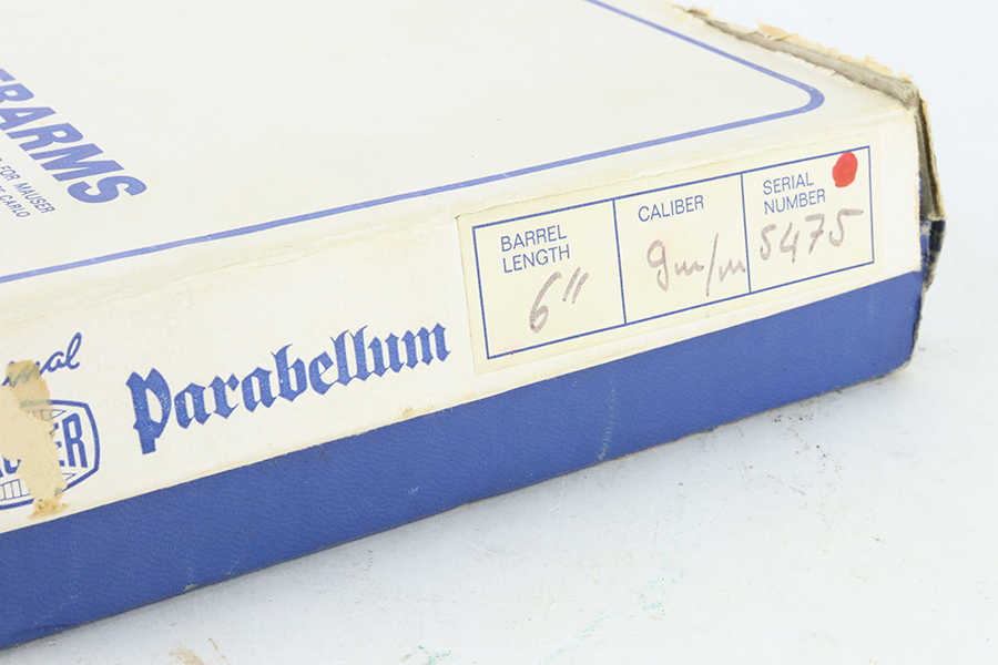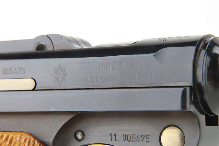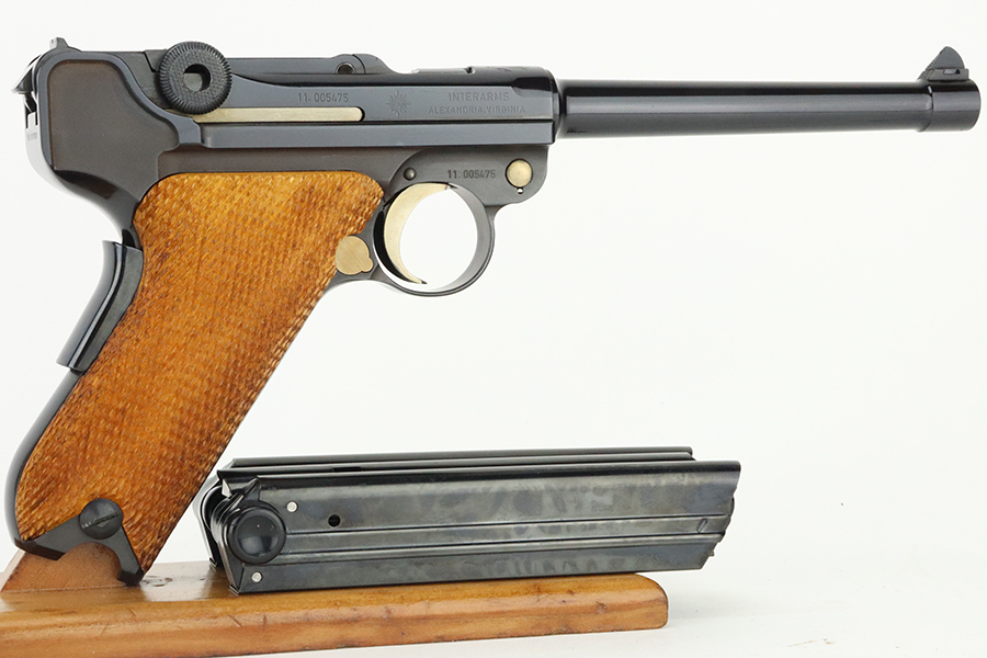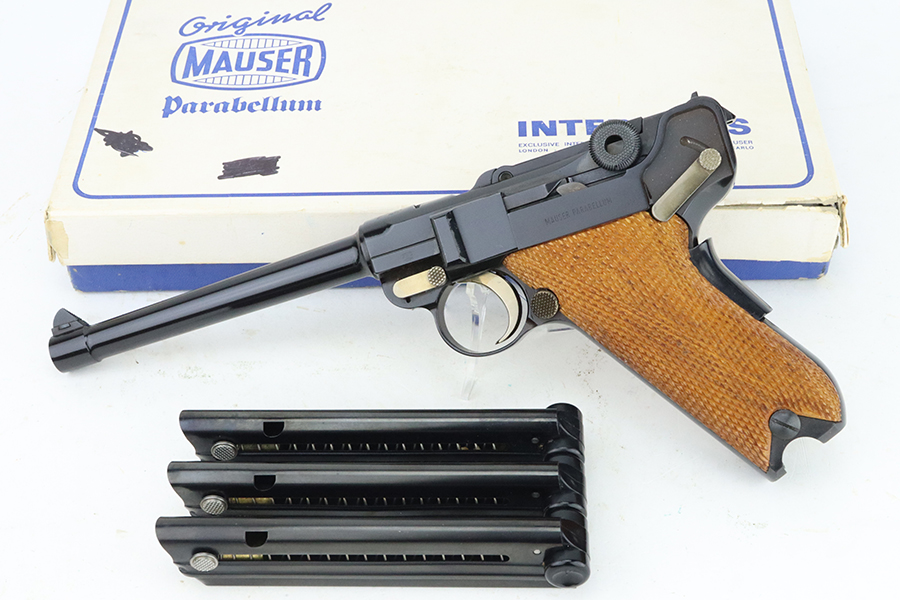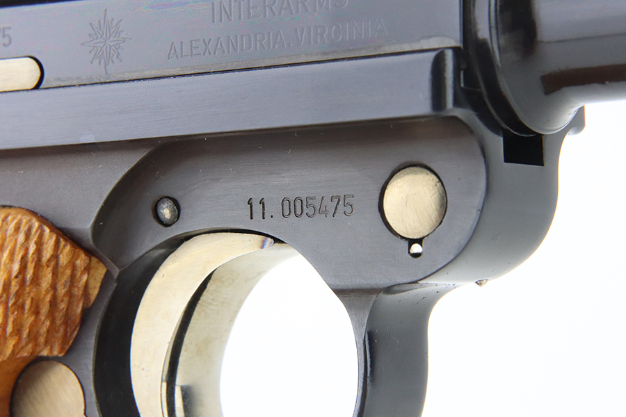 5/15/24 – This is a like-new example of a Mauser/Interarms Luger manufactured in the 1970’s and chambered in 9mm Luger. 5″ barrel. It is all matching, has the American Eagle seal on the chamber, and has an Interarms marking on the right side of the slide. It comes with its original matching box and three magazines. The gun is mint with no signs of wear or use. Fitted with mint wood grips. Mint bore.