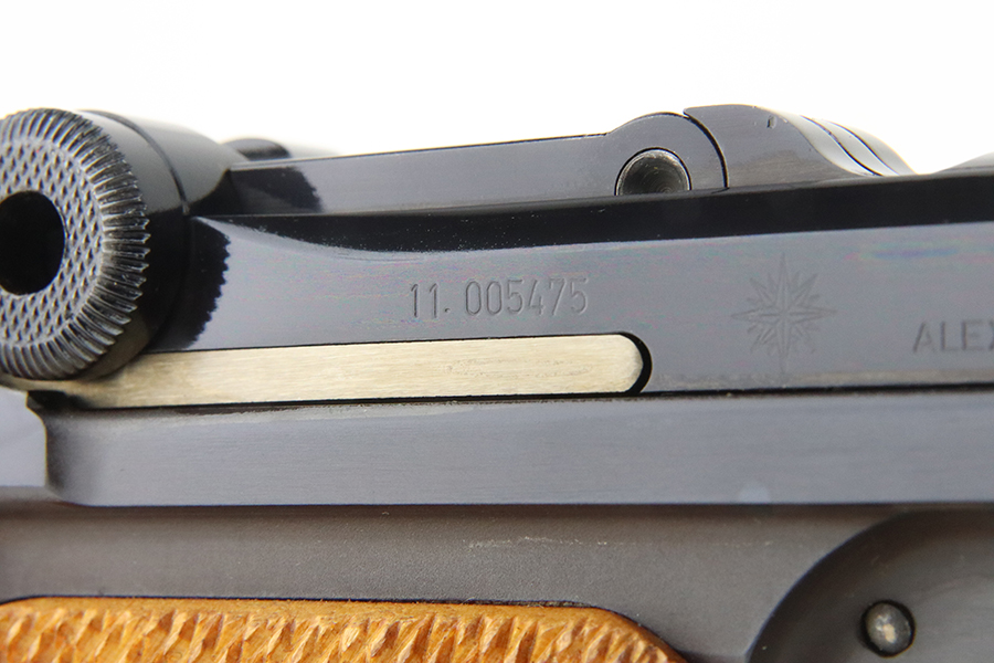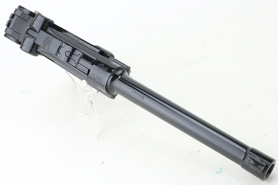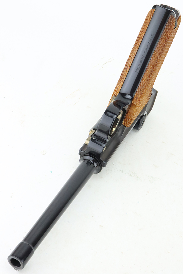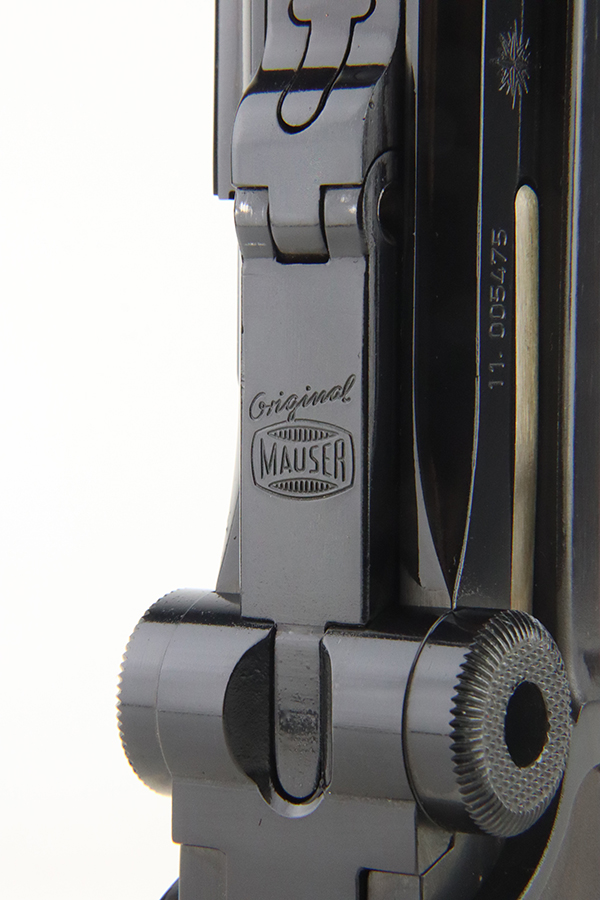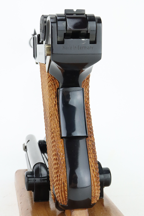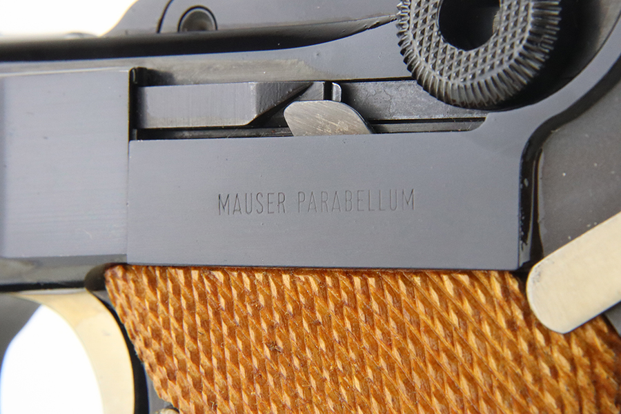 5/15/24 – This is a like-new example of a Mauser/Interarms Luger manufactured in the 1970’s and chambered in 9mm Luger. 5″ barrel. It is all matching, has the American Eagle seal on the chamber, and has an Interarms marking on the right side of the slide. It comes with its original matching box and three magazines. The gun is mint with no signs of wear or use. Fitted with mint wood grips. Mint bore.