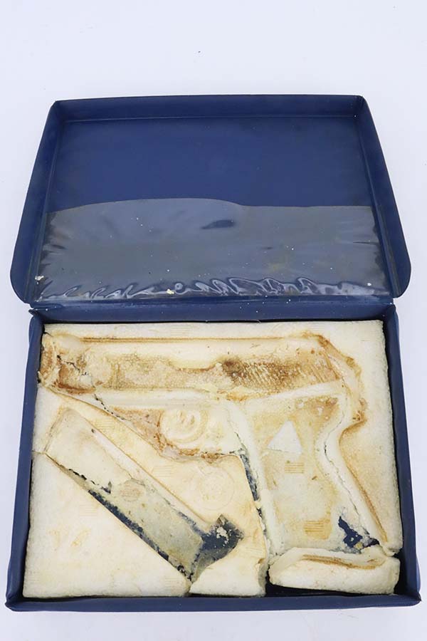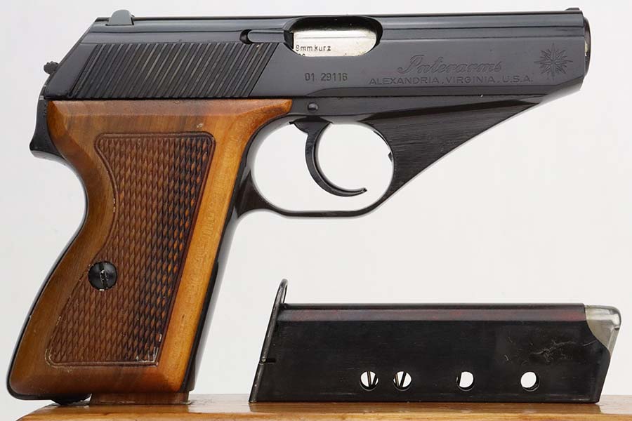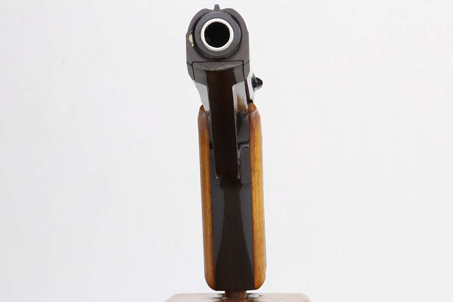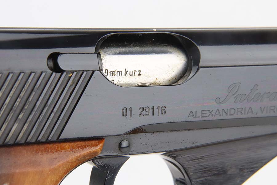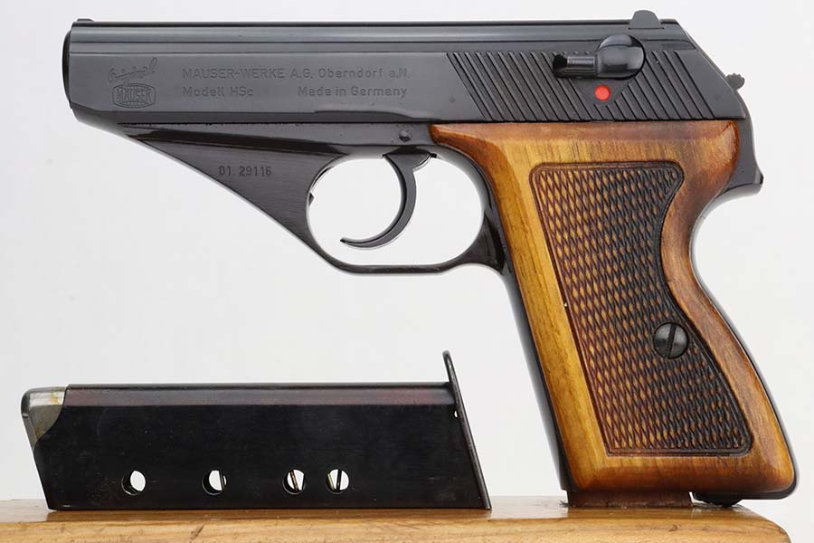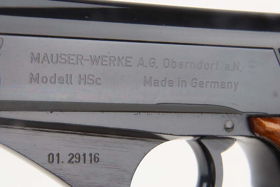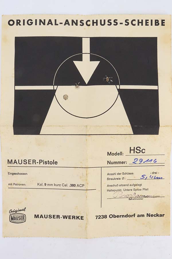 3/11/24 – This is a mint example of a Mauser / Interarms HSC, manufactured in the 1970’s and chambered in 9mm Kurz or .380 ACP. It is all matching and comes with its original box (not numbered, no sleeve), matching test target, one magazine, and owners manual. It has retained essentially all of its original high polish finish with no signs of wear. Fitted with minty blonde wood grips. Mint bore.