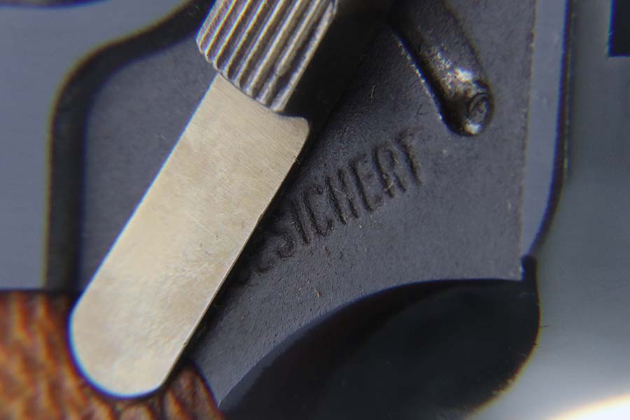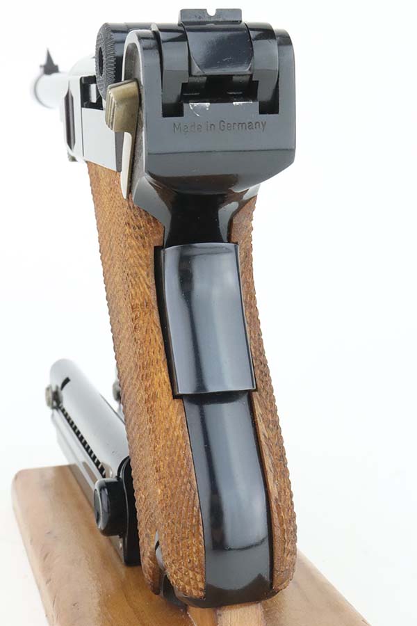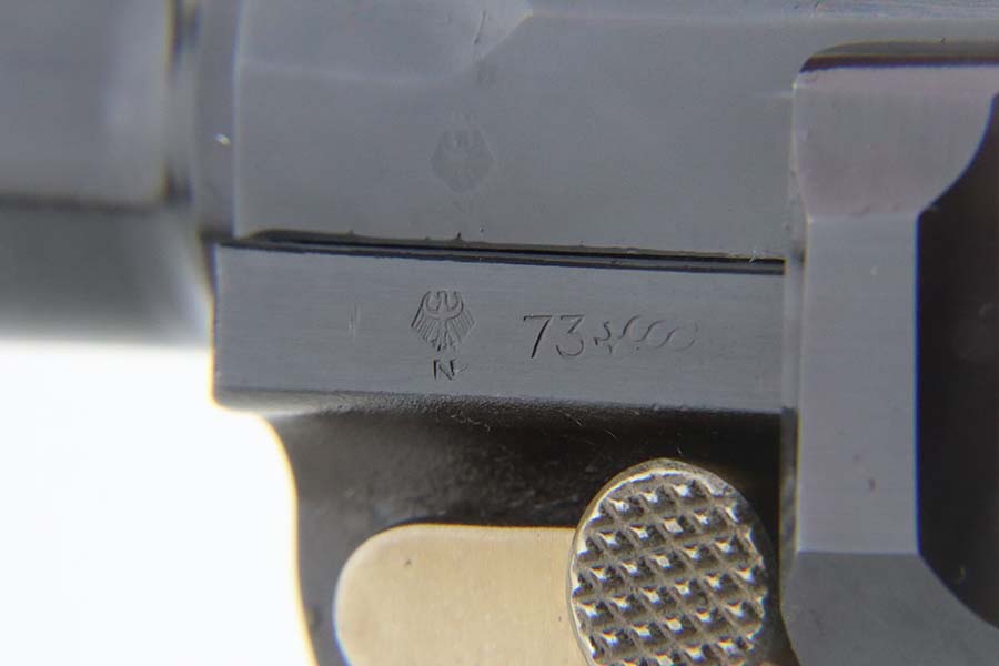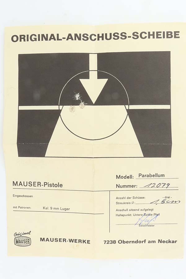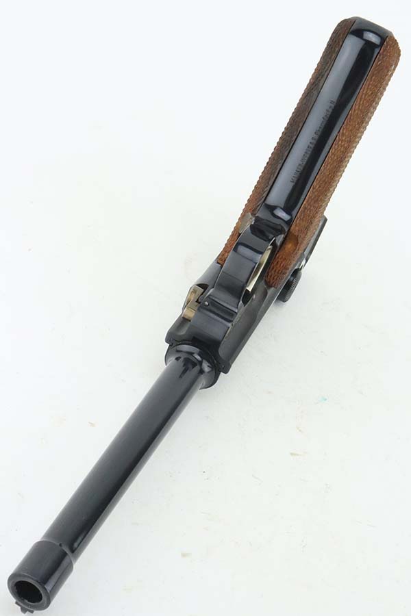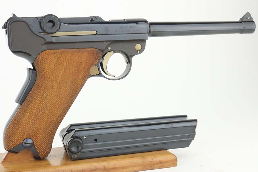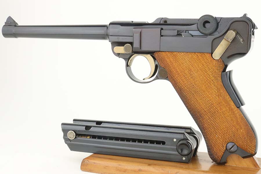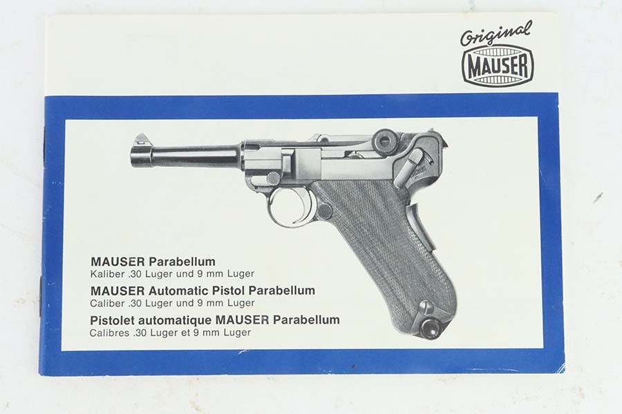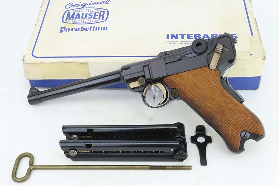 3/26/24 – This is a like-new example of a Mauser 06/73 Luger, manufactured in 1973 and chambered in 9mm. 5 inch barrel with an American Eagle seal on the chamber. These are scarce, as only about 2,700 were made in 9mm. It comes with its original matching-numbered box, matching-numbered test target, owners manual, two magazines, cleaning rod, and tool. The gun is like-new with no signs of wear or use. Fitted with mint P.08 style wood grips. Mint bore.