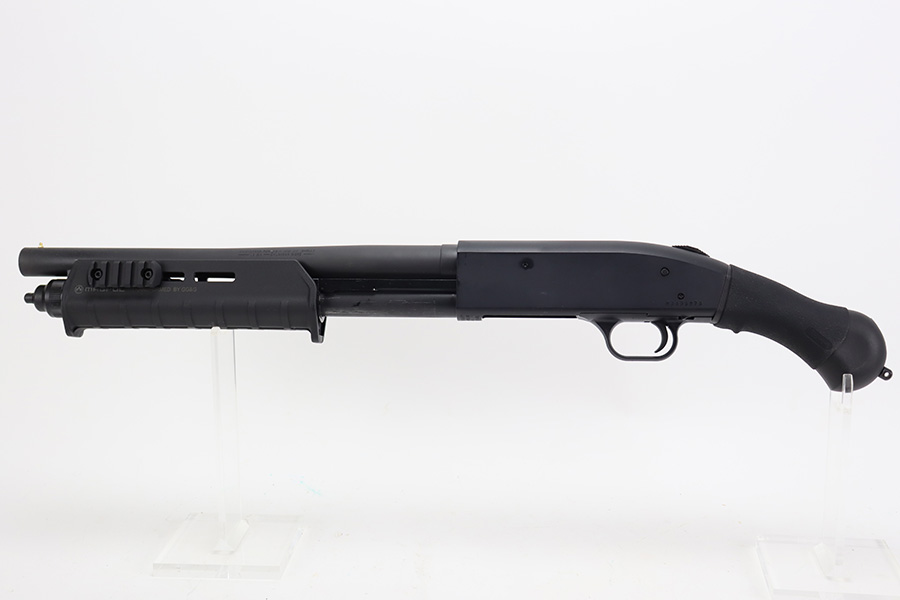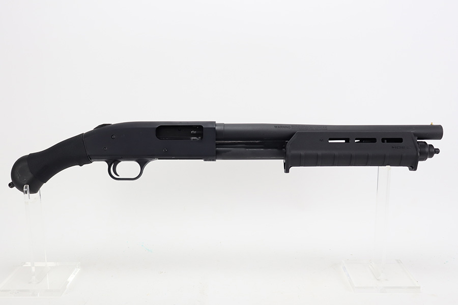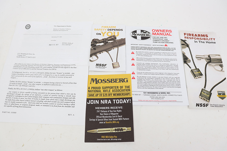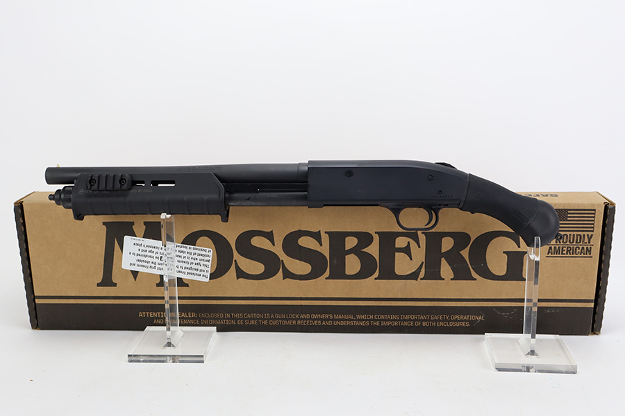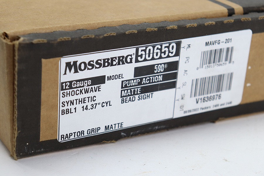7/18/23 – This is in ANIB Mossberg 590 Shockwave 12 gauge shotgun. The only visible wear is some very minor racking lines. Mint bore. Features the Shockwave signature bird’s-head grip, uniquely shaped to minimize felt recoil, ambidextrous safety, dual extractors, positive steel-to-steel lockup, twin action bars, and a smooth operating anti-jam elevator. 14.5″ Barrel and Magpul MOE Shotgun Forend for improved racking functionality. Comes with original serialized box, lock, and manual.