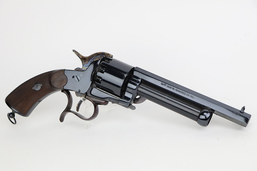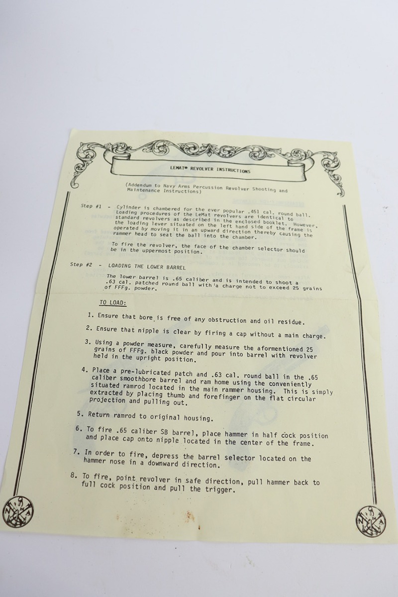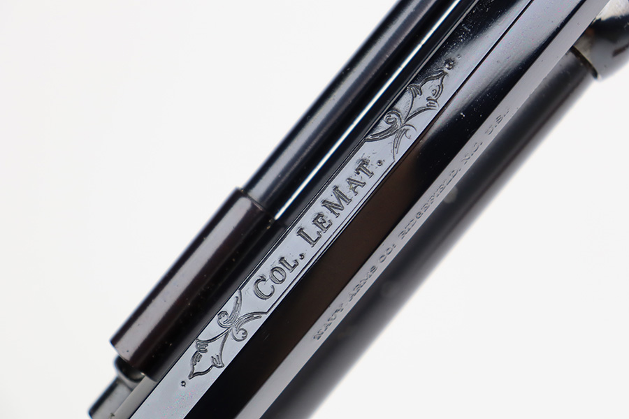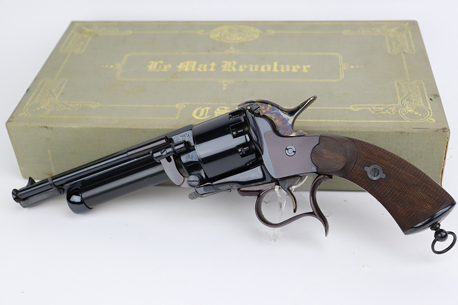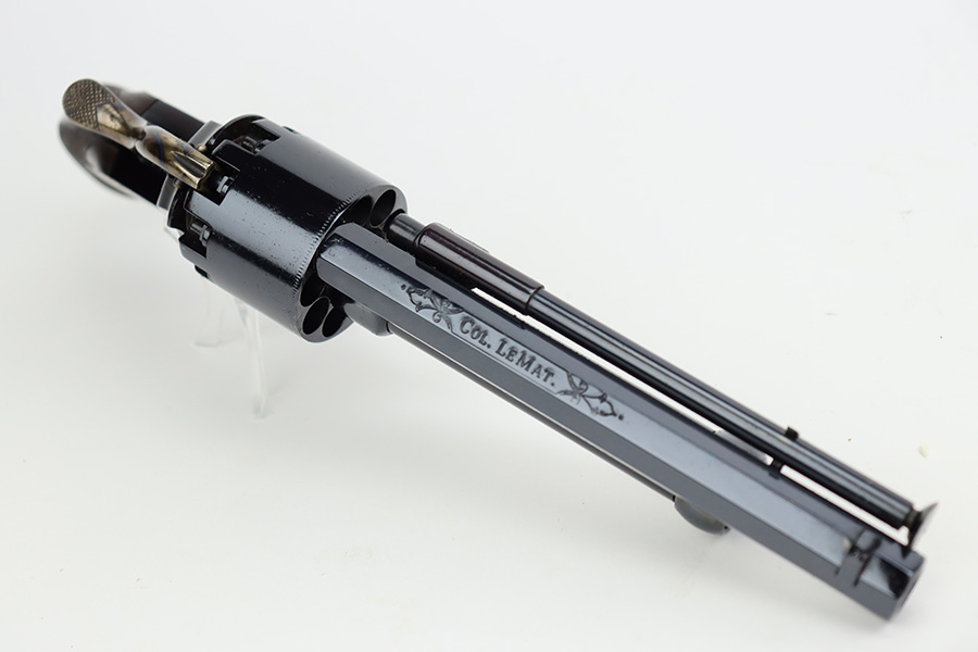 8/3/23 – This unusual sidearm was also known as the “Grape Shot Revolver.” Developed in New Orleans in 1856 by Dr. Jean LeMat and backed by Pierre G.T. Beauregard, who was to become a general with the Confederacy. Roughly 2,900 were produced. This is an accurate Navy Arms Company, Italian made, reproduction of the First Model LeMat, Cavalry Model which has a nine-shot, .451 caliber cylinder and rifled 6-3/4″ barrel. What sets it apart from other revolver designs is the 20-gauge, .65 inch diameter 5-7/8″ smoothbore barrel, originally intended for firing buckshot. Both are fired by a pivoting striker on the hammer. This one is in like-new condition with no signs of wear or use. Mint bores. It comes with its original box – the foam on the inside is starting to deteriorate.