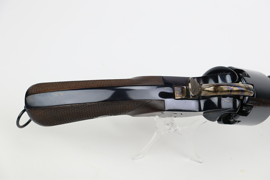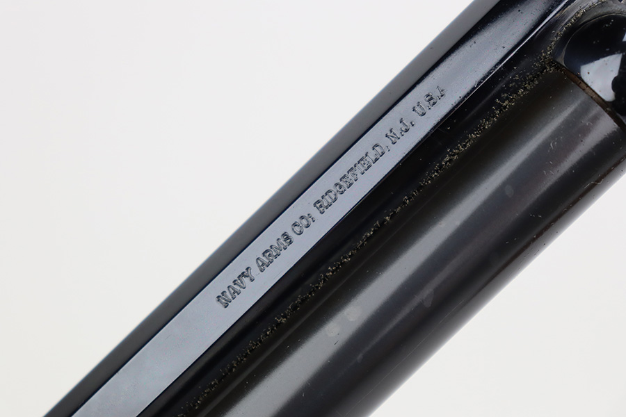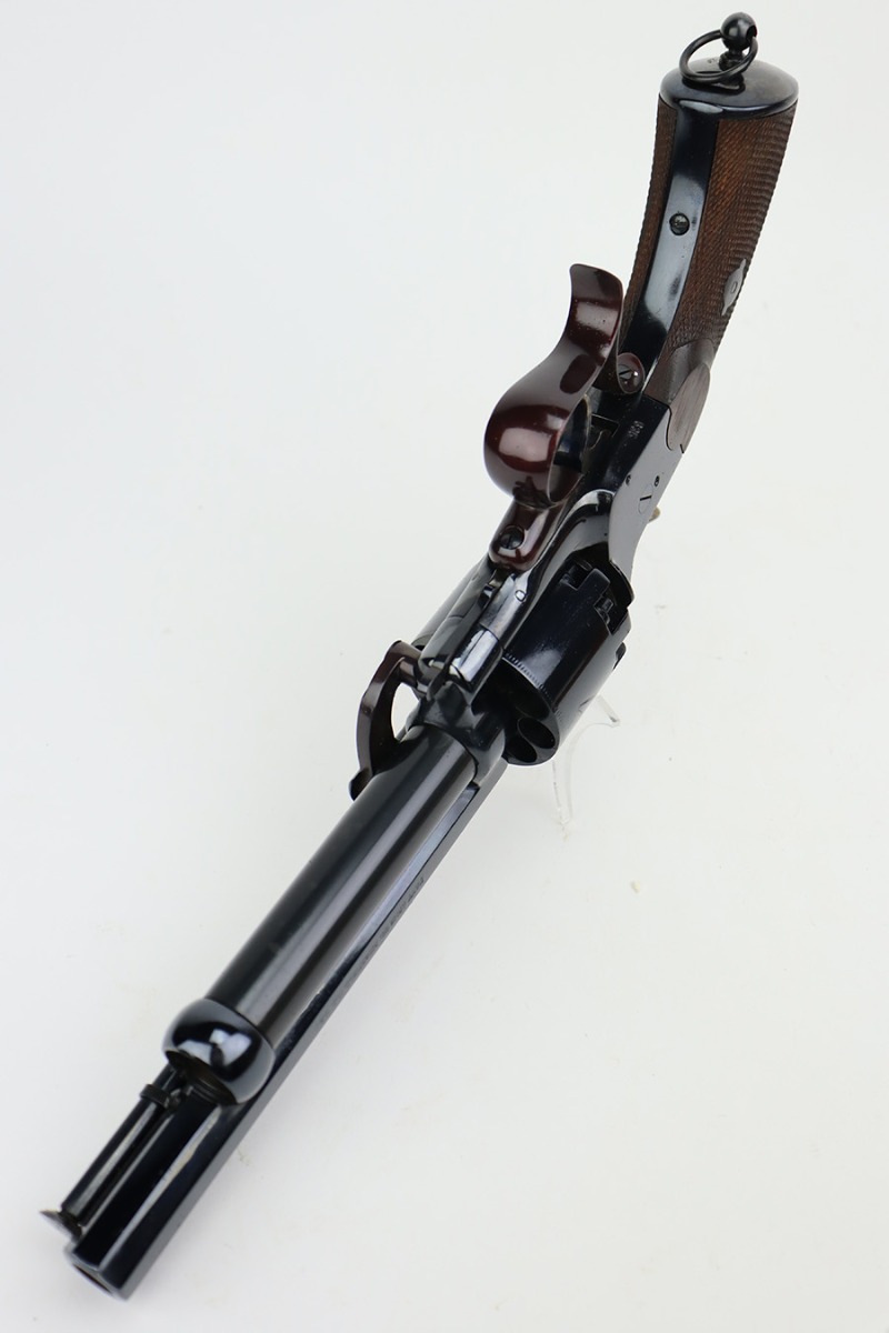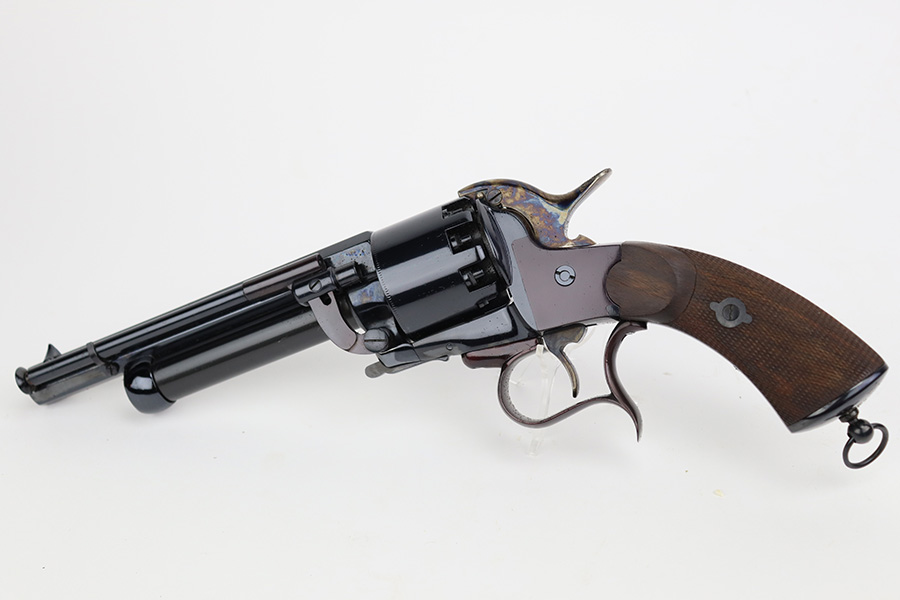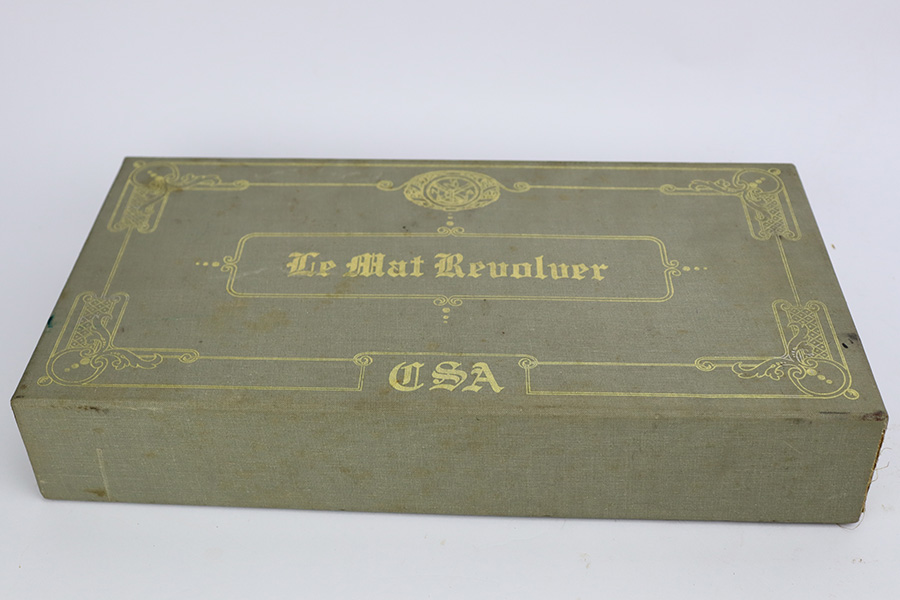 8/3/23 – This unusual sidearm was also known as the “Grape Shot Revolver.” Developed in New Orleans in 1856 by Dr. Jean LeMat and backed by Pierre G.T. Beauregard, who was to become a general with the Confederacy. Roughly 2,900 were produced. This is an accurate Navy Arms Company, Italian made, reproduction of the First Model LeMat, Cavalry Model which has a nine-shot, .451 caliber cylinder and rifled 6-3/4″ barrel. What sets it apart from other revolver designs is the 20-gauge, .65 inch diameter 5-7/8″ smoothbore barrel, originally intended for firing buckshot. Both are fired by a pivoting striker on the hammer. This one is in like-new condition with no signs of wear or use. Mint bores. It comes with its original box – the foam on the inside is starting to deteriorate.