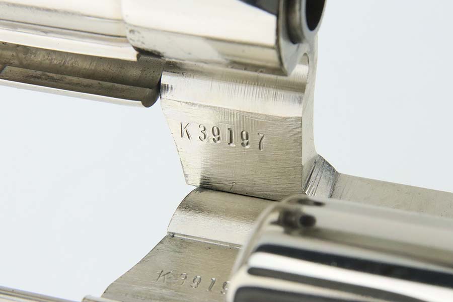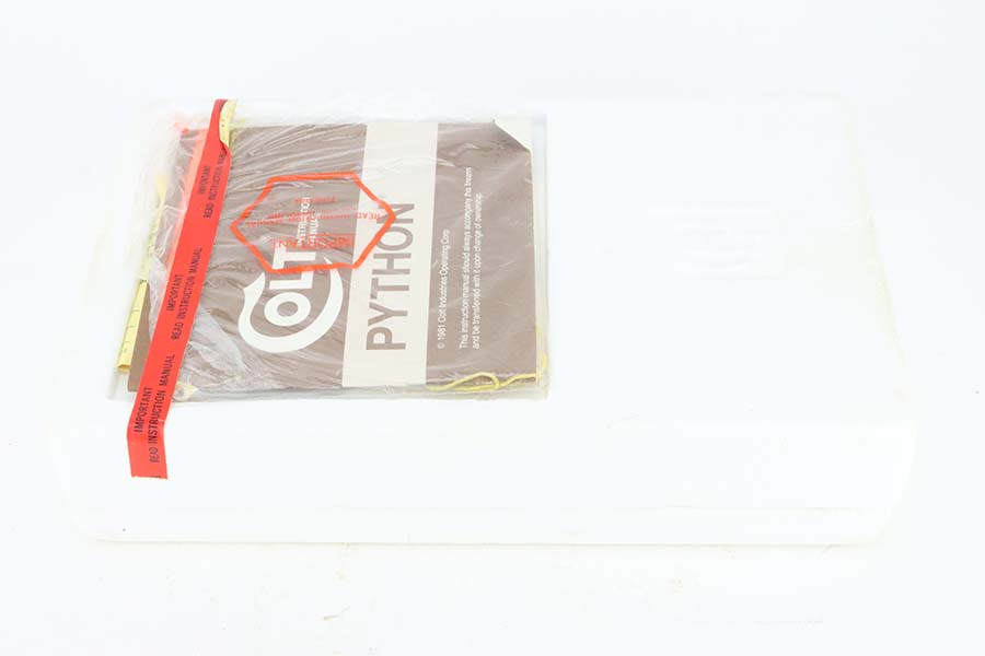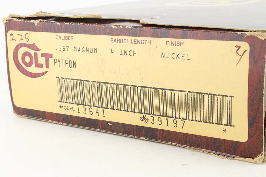 3/22/24 – This is a like-new example of a Colt Python revolver from 1981. Chambered in .357 Magnum with a 4 inch barrel. It has a beautiful nickel finish and shows virtually no signs of wear or use – just an extremely light roll mark on the cylinder. Fitted with mint checkered wood grips. Mint bore. Comes with its original matching-numbered box and owners manual.