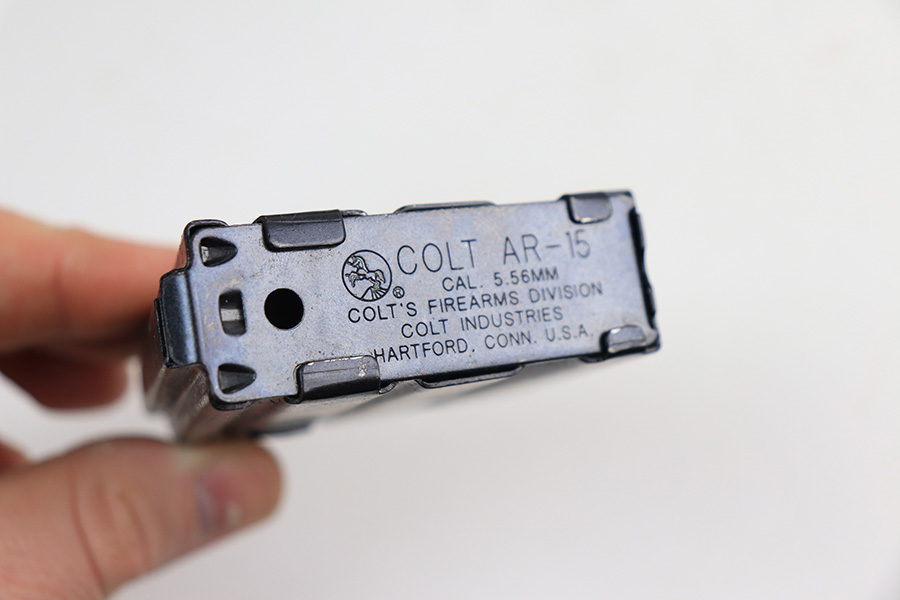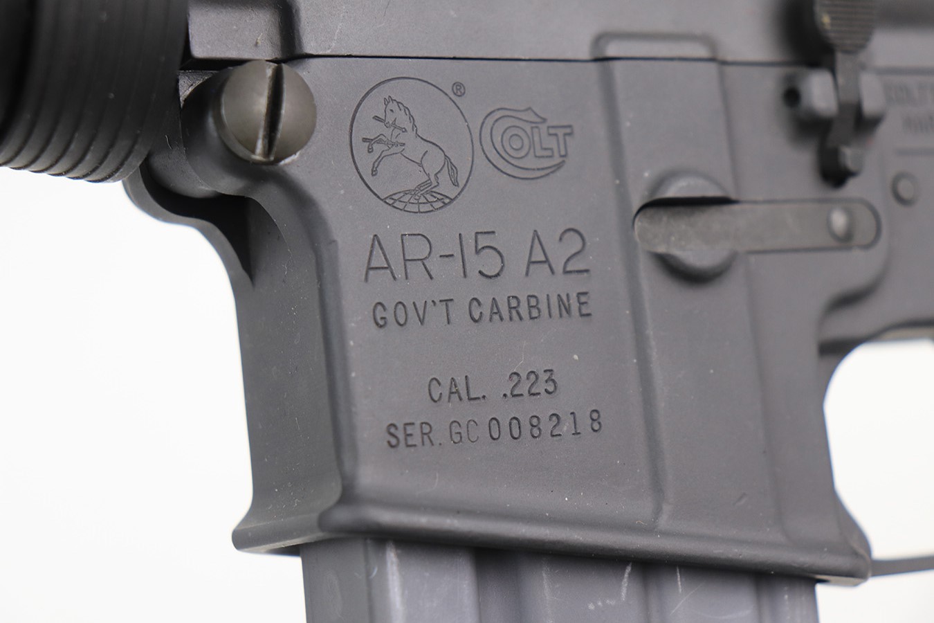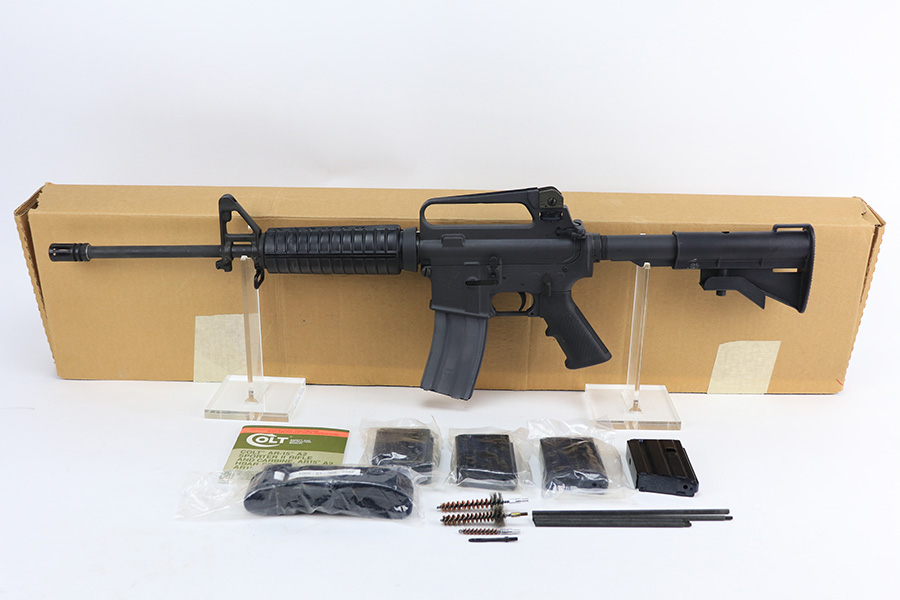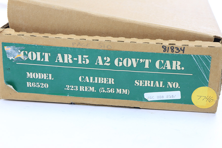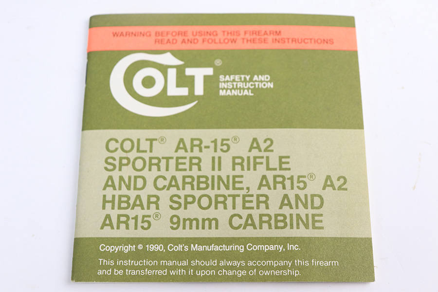 2/8/22 – This is a like-new example of a Colt AR-15 A2 Government Carbine. It was manufactured in about 1989 (Pre-Ban). It comes with the original matching box, plastic wrapping (has a matching serial number on it), three un-wrapped 10-rd magazines, one un-wrapped 10-rd magazine, one 25-rd magazine, owners manual, cleaning kit, and black canvas sling. The gun is in like-new condition with no major signs of wear. There are just some very light surface scuffs here and there. There is a small area of dried adhesive on the left side of the butt stock visible in the photos. We were able to get this off, so it is no longer there. The bore is mint.