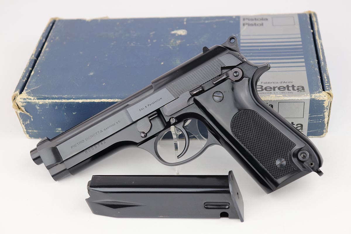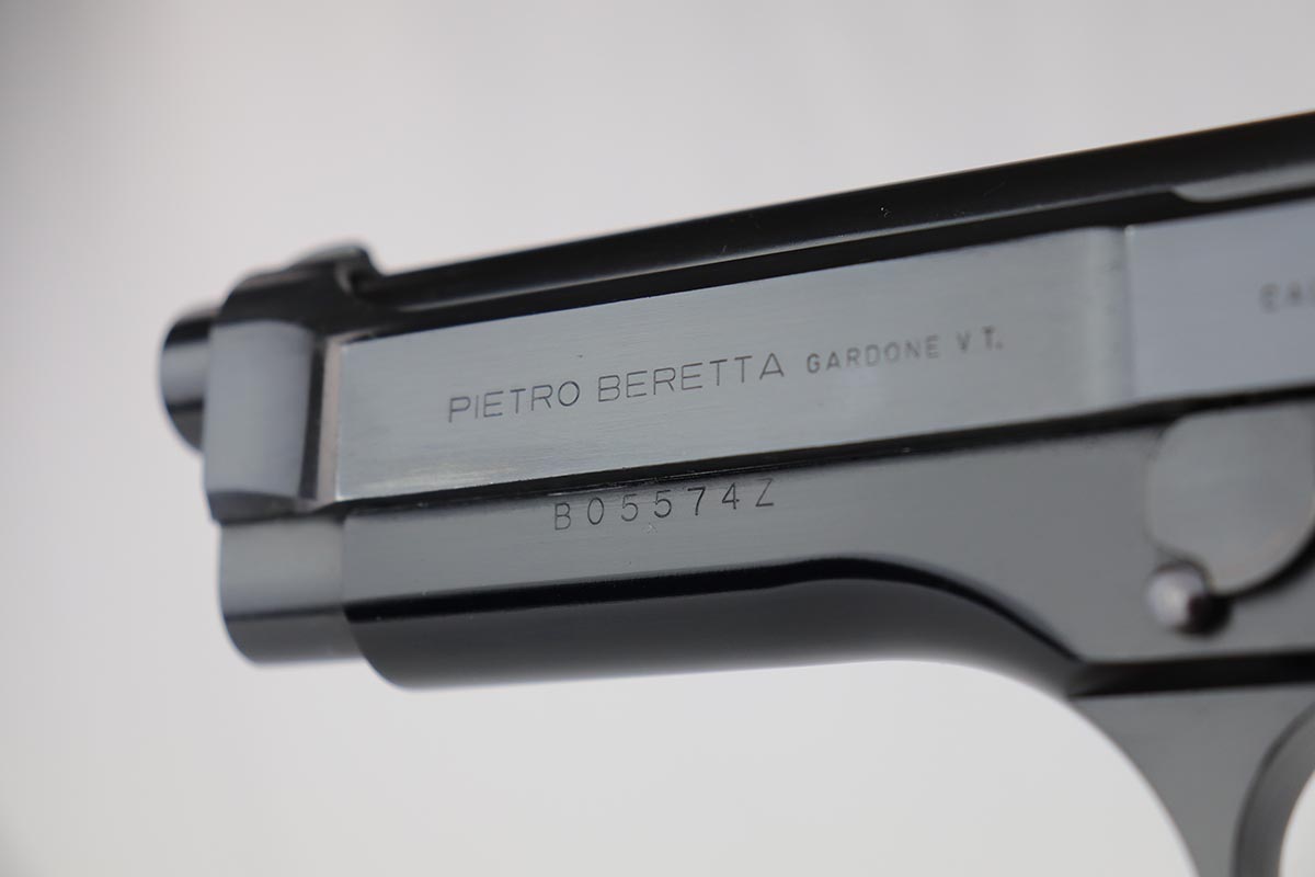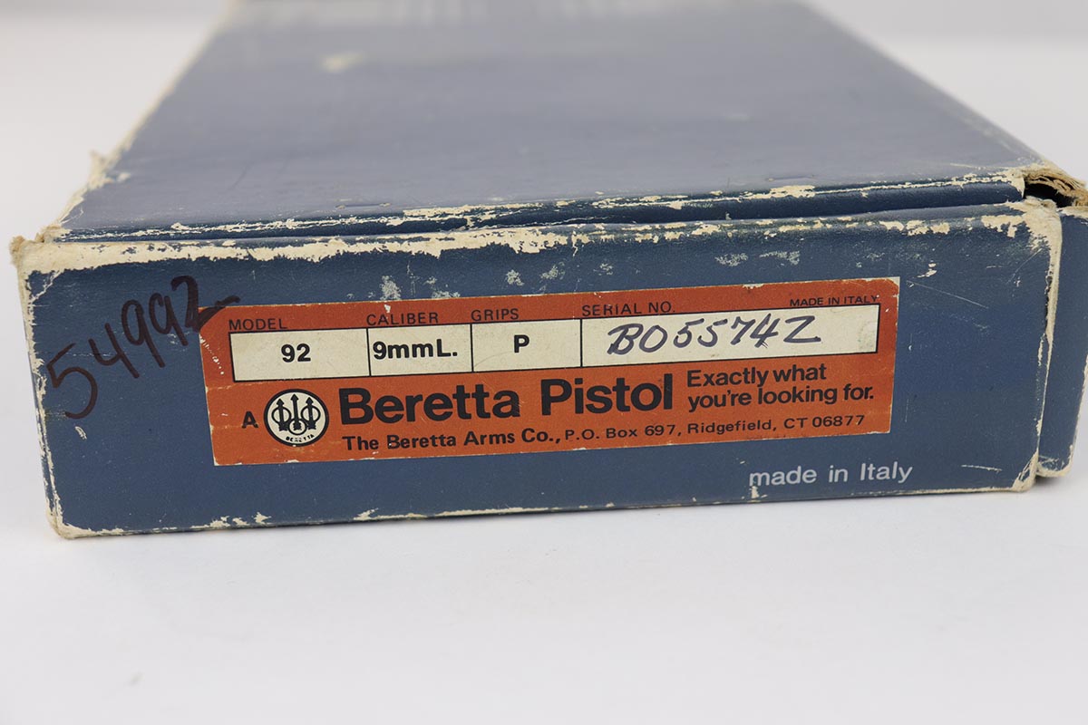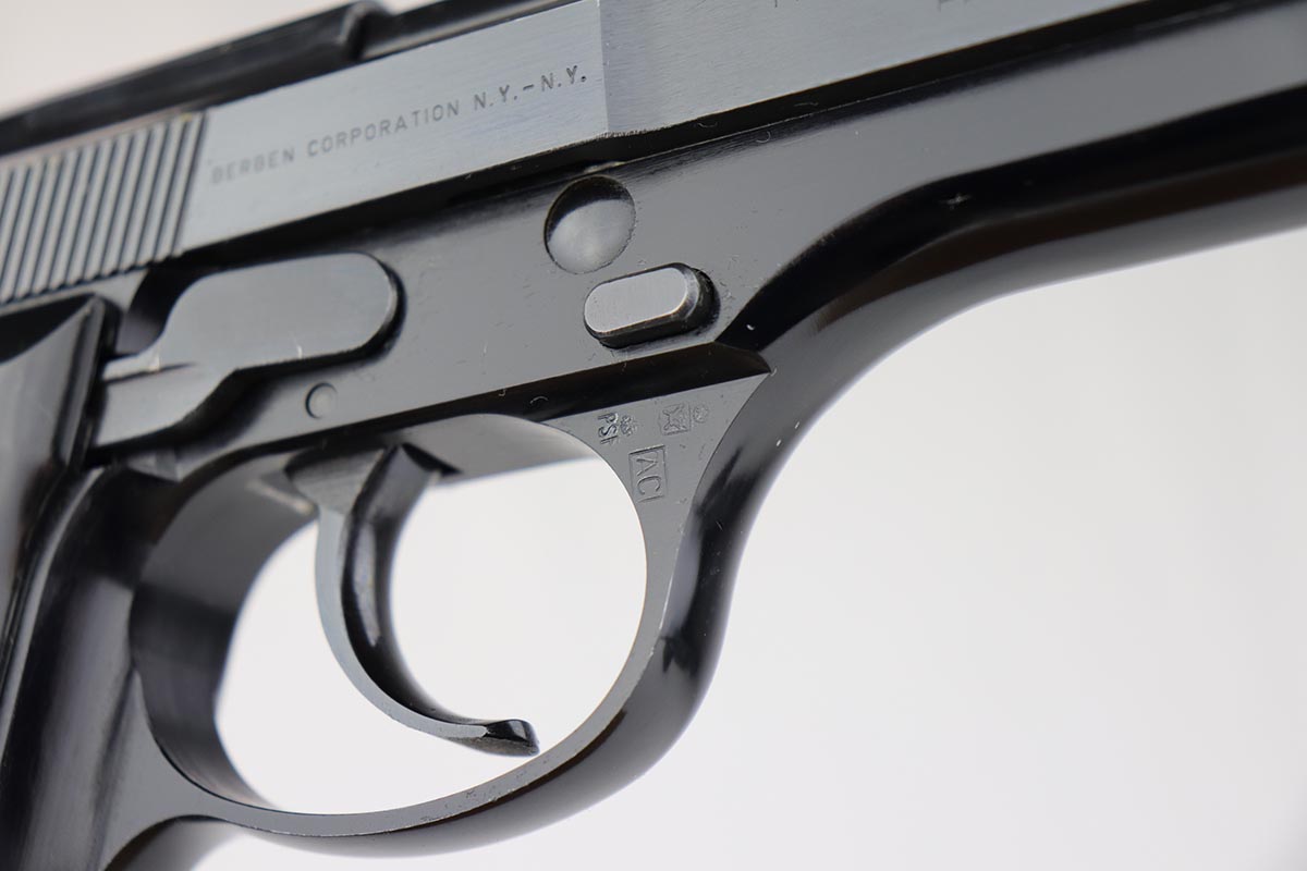 8/22/19 – By far the rarest variation of all Beretta 92 series guns, this is an early “step slide” Beretta 92, with date code AC(1977) on the right trigger guard. This spectacular gun appears new and unfired and is a complete set, that comes with its original early manual, a spare magazine and a serial numbered original box. Different from the subsequent variations, the first issue Beretta 92 had a “stepped slide’, a frame mounted safety and a mag release on the bottom of the grip frame. Only about 5,000 of these collectible guns were made from 1975-1977, with only a fraction being imported into the US by the Berben corporation – a Beretta subsidiary. This particular gun appears new with just a hint of wear on the forward edges of the slide, a dural high gloss frame and a high polished slide. Impossible to upgrade!