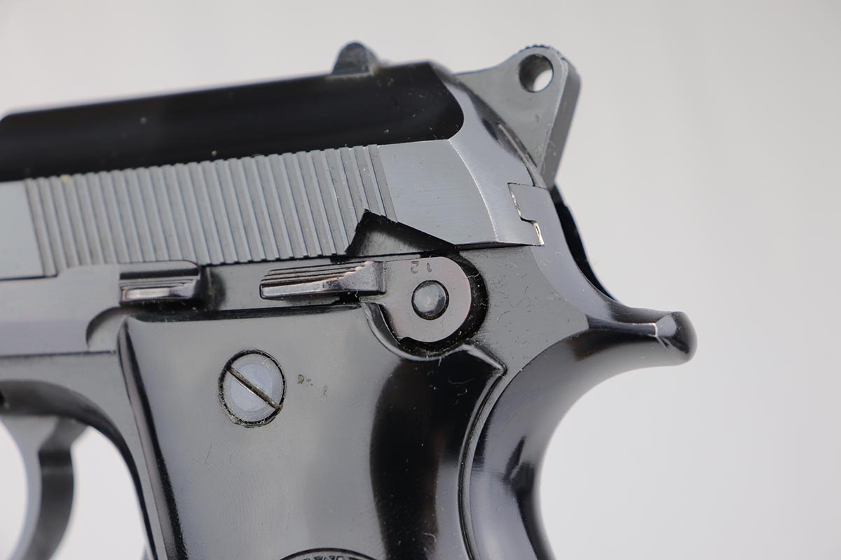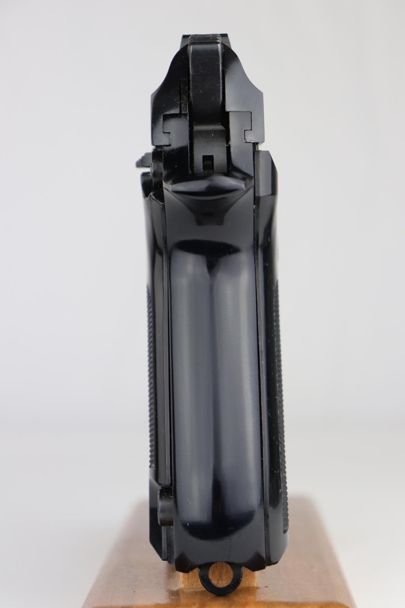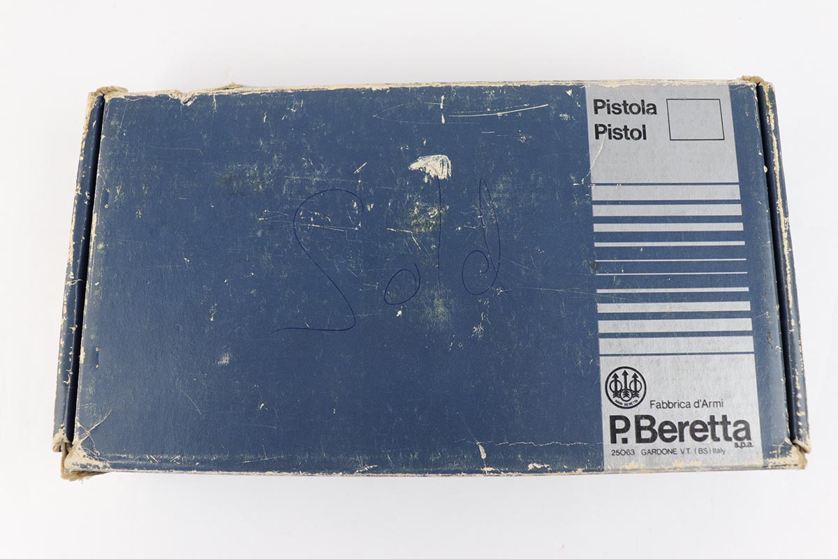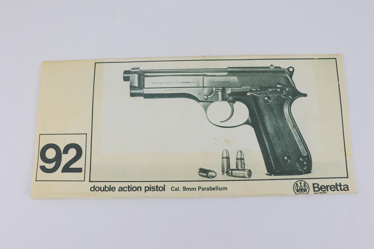 8/22/19 – By far the rarest variation of all Beretta 92 series guns, this is an early “step slide” Beretta 92, with date code AC(1977) on the right trigger guard. This spectacular gun appears new and unfired and is a complete set, that comes with its original early manual, a spare magazine and a serial numbered original box. Different from the subsequent variations, the first issue Beretta 92 had a “stepped slide’, a frame mounted safety and a mag release on the bottom of the grip frame. Only about 5,000 of these collectible guns were made from 1975-1977, with only a fraction being imported into the US by the Berben corporation – a Beretta subsidiary. This particular gun appears new with just a hint of wear on the forward edges of the slide, a dural high gloss frame and a high polished slide. Impossible to upgrade!