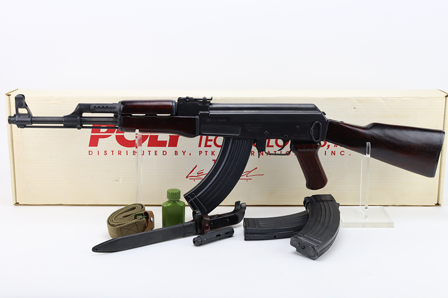 2/19/24 – This is a rare Poly-Tech AK-47/S Legend series rifle in the original box. It’s in near-mint condition with just minor “box wear” and a minty bore. The wood furniture is in excellent condition with little to no handling wear. Box includes the original Styrofoam insert, as well as the manual, sling, three aftermarket mags and bayonet. This box is not serialized.