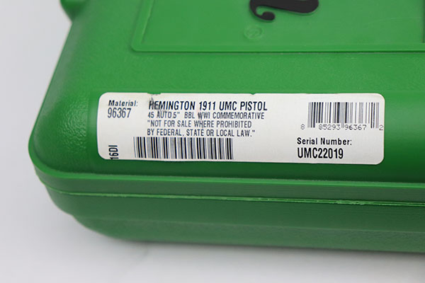 2/27/23 – The WWI UMC Commemorative 1911 is a joint venture between Remington Arms and Turnbull Mfg. Co. to reintroduce a historically accurate Remington-UMC 1911 and honor the 100 year anniversary of WW1 – one of only 1,000 made. This 1911 comes with all the appropriate markings including an eagle’s head on the slide/receiver and the proof mark on the barrel. It one is in like-new condition with no signs of wear or use. It comes with its original matching hard case and one magazine. The bore is like-new.