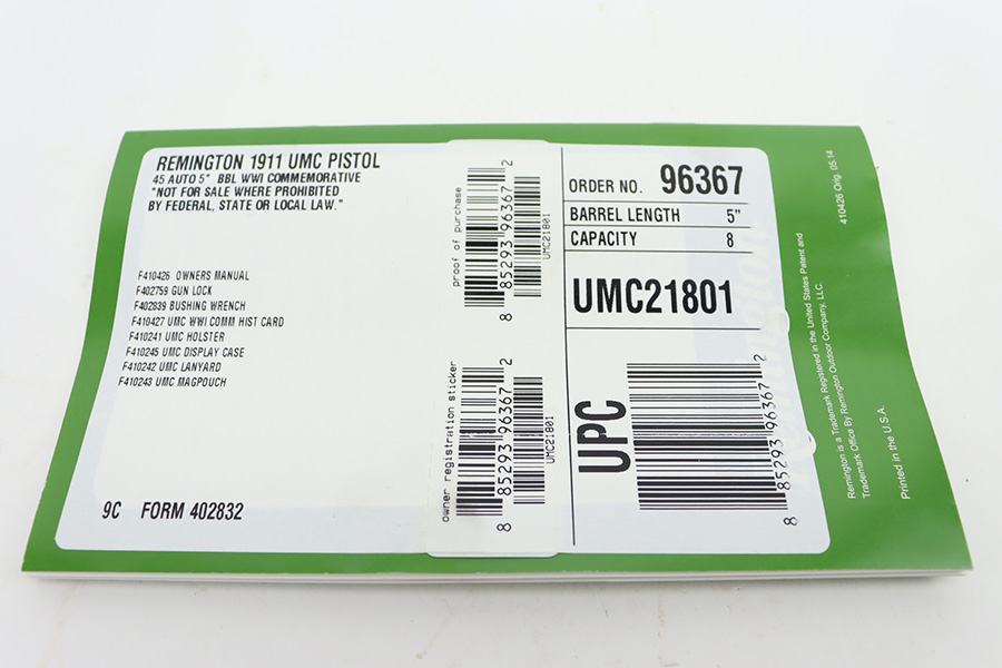 12/6/23 – The WWI UMC Commemorative 1911 is a joint venture between Remington Arms and Turnbull Mfg. Co. to reintroduce a historically accurate Remington-UMC 1911 and honor the 100 year anniversary of WW1 – one of only 1,000 made. This 1911 comes with all the appropriate markings including an eagle’s head on the slide/receiver and the proof mark on the barrel. It one is in like-new condition with no signs of wear or use. It comes with its original matching hard case, owners manual, gun lock, and two magazines. Mint bore.