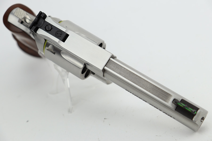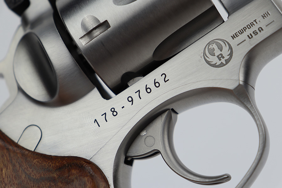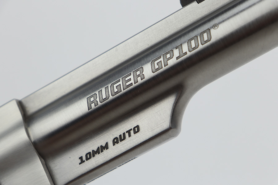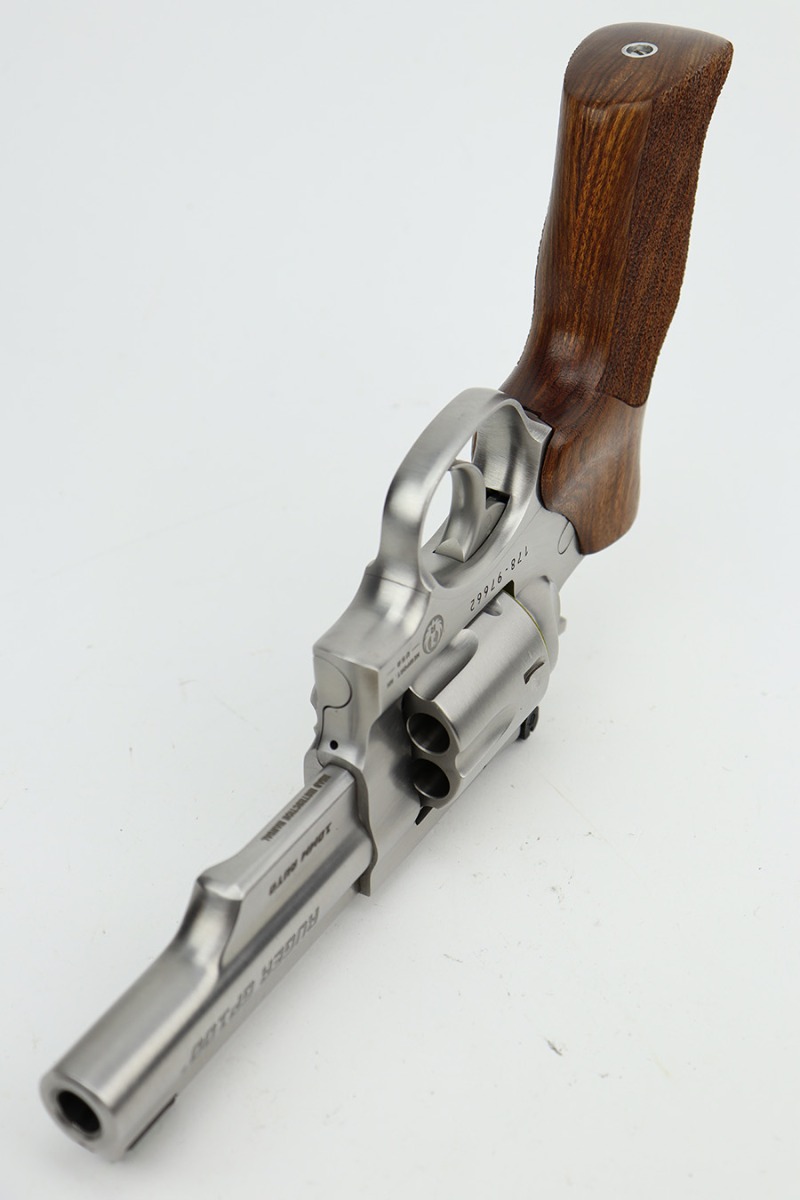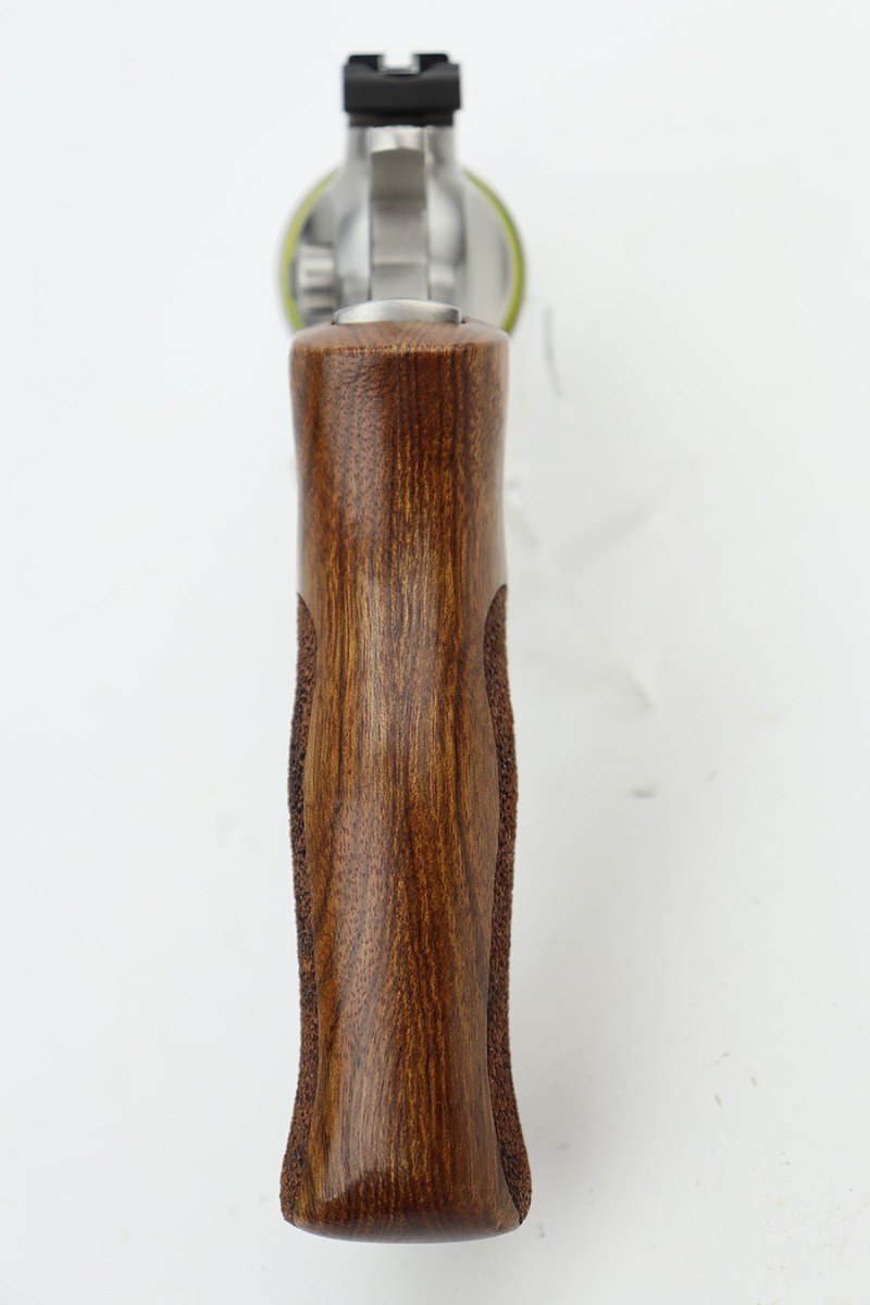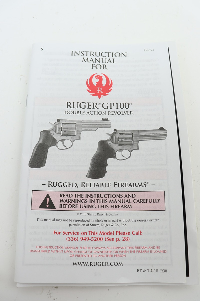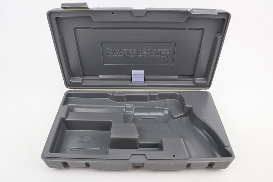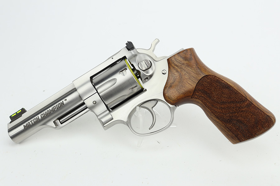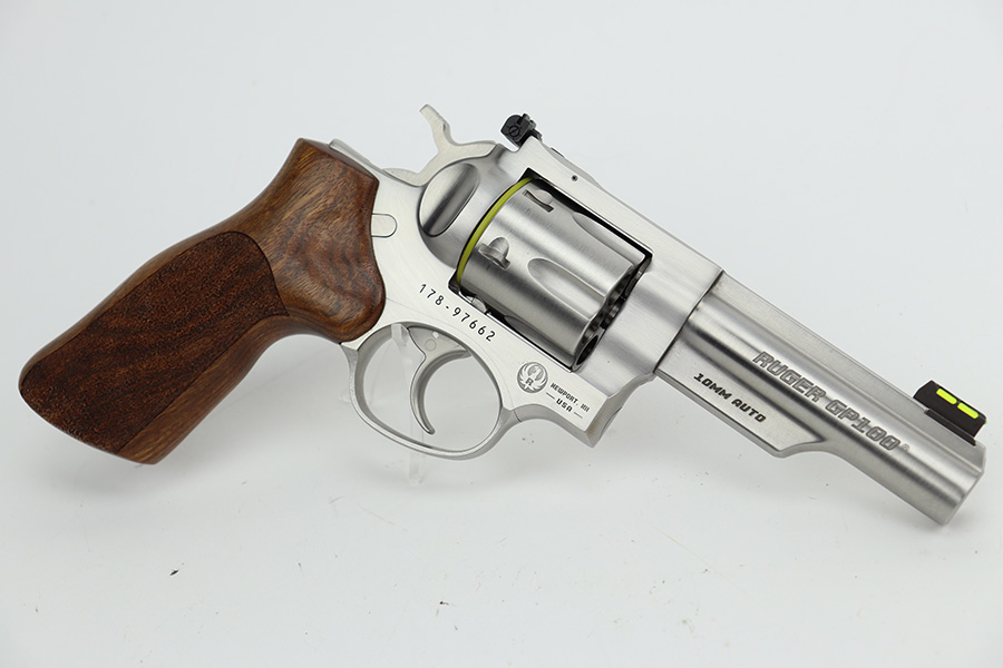 8/2/23 – This is a like-new example of a Ruger GP100 Match Champion revolver, chambered in 10mm Auto. It comes with its original matching-numbered hard case, owners manual, sales papers, and gun lock. The gun has a really nice brushed-stainless finish and shows no signs of wear or use. There is barely even a hint of a roll mark on the cylinder. Fitted with beautiful stippled blonde wood grips. The bore is factory-new.