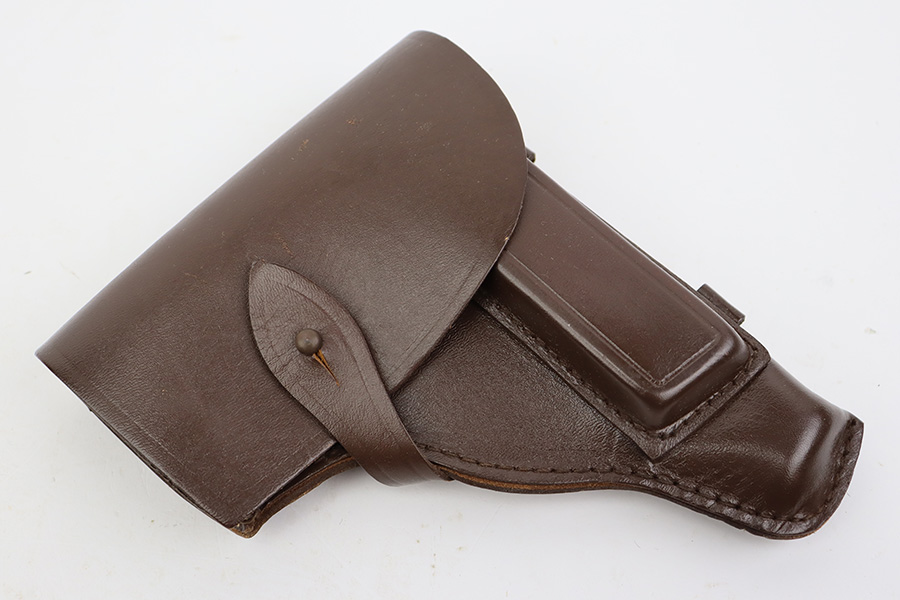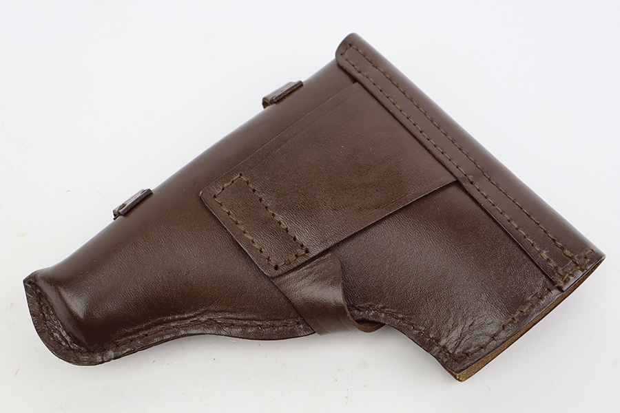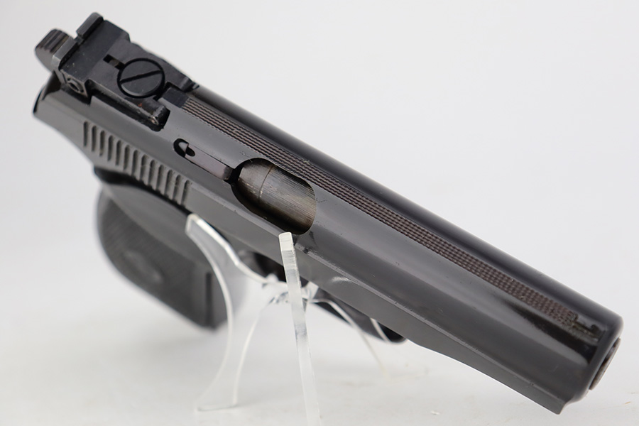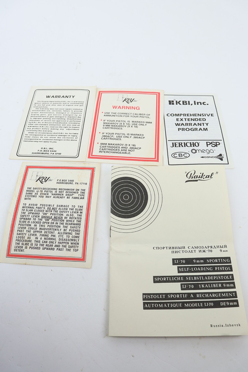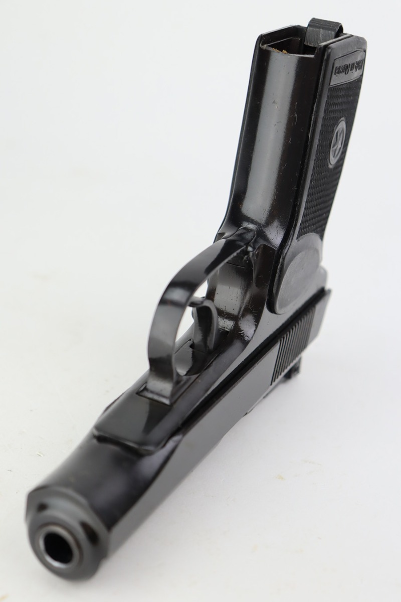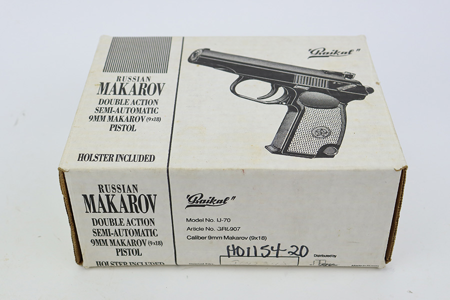 6/27/23 – This is a like-new example of a Russian Makarov IJ-70 manufactured in the 1990’s. All matching with an import mark on the left side of the slide. Comes with its original matching-numbered box, inner box, owners manual, sales papers, a mint holster (dated 1993), leather shoulder strap, a cleaning rod, multitool and two magazines. The gun itself has retained essentially all of its finish. There is just one very light surface scratches and a couple of small spots of discoloration on the right side of the gun. Fitted with excellent correct black plastic grips. Like-new bore.