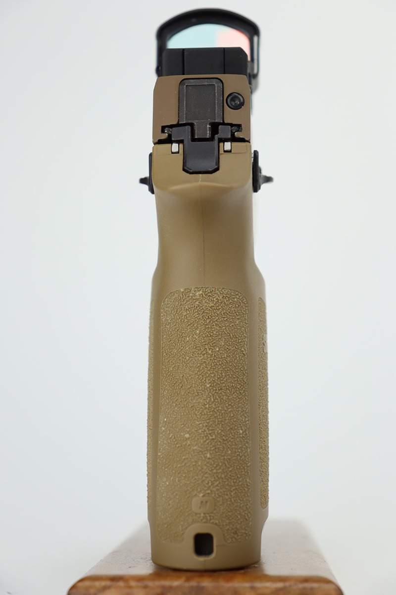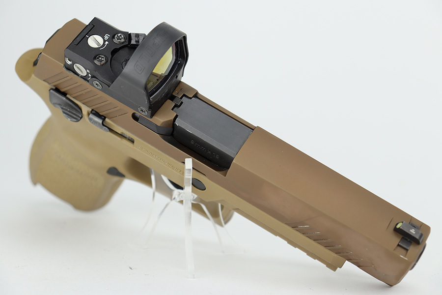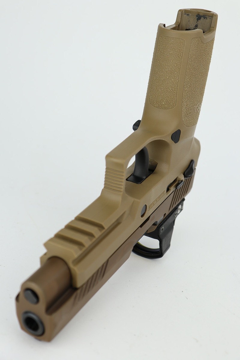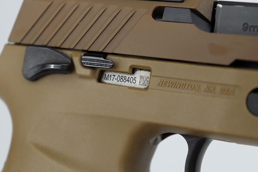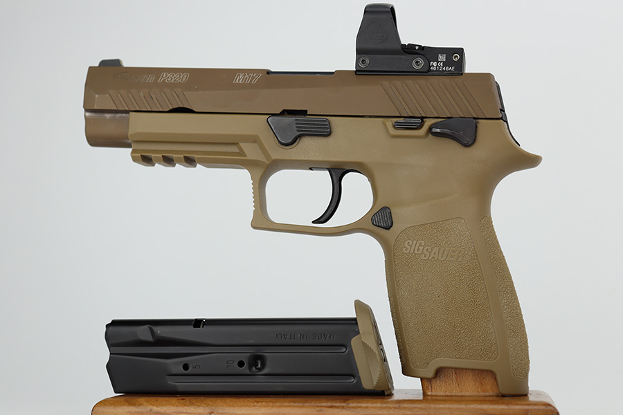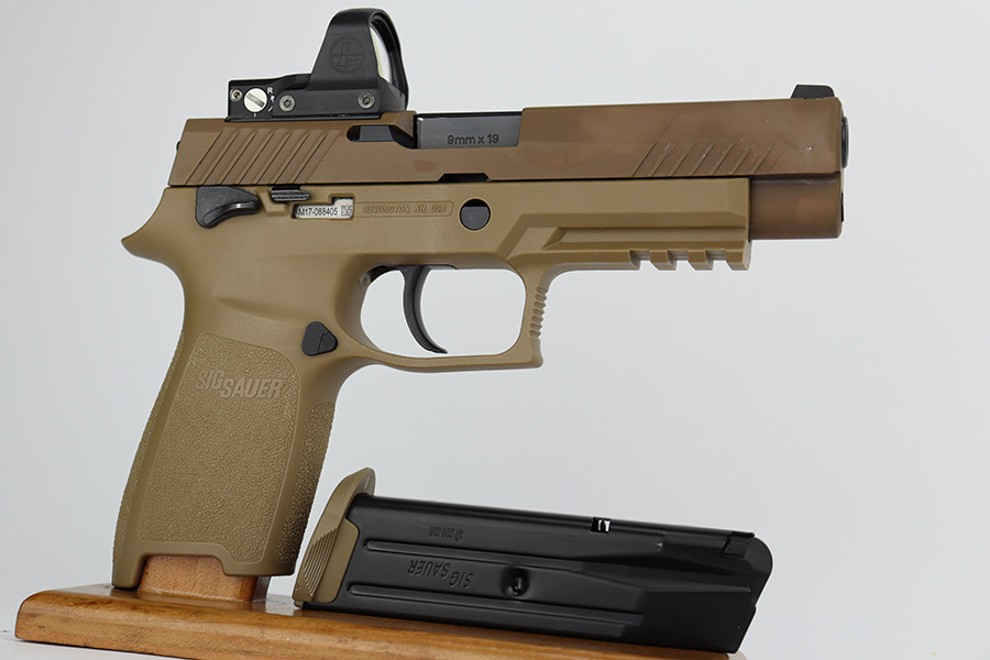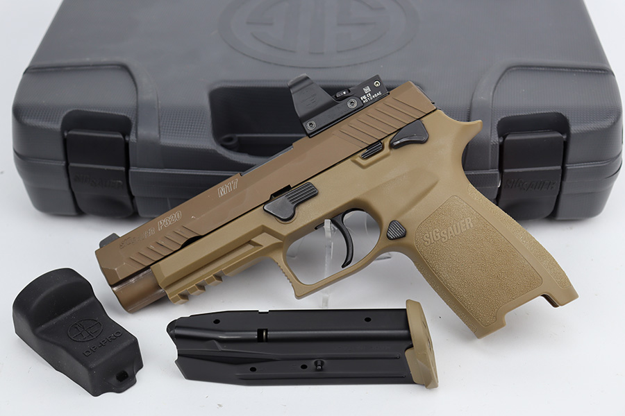 7/14/23 – This is a like-new example of a Sig Sauer M17, chambered in 9mm Luger. It has a really nice desert tan finish and comes equipped with an excellent Leupold DP-Pro red dot sight (fully functional). No obvious signs of wear on the gun. It comes with its original matching-numbered hard case, original hang tag, owners manual, and one magazine. Near-mint bore.