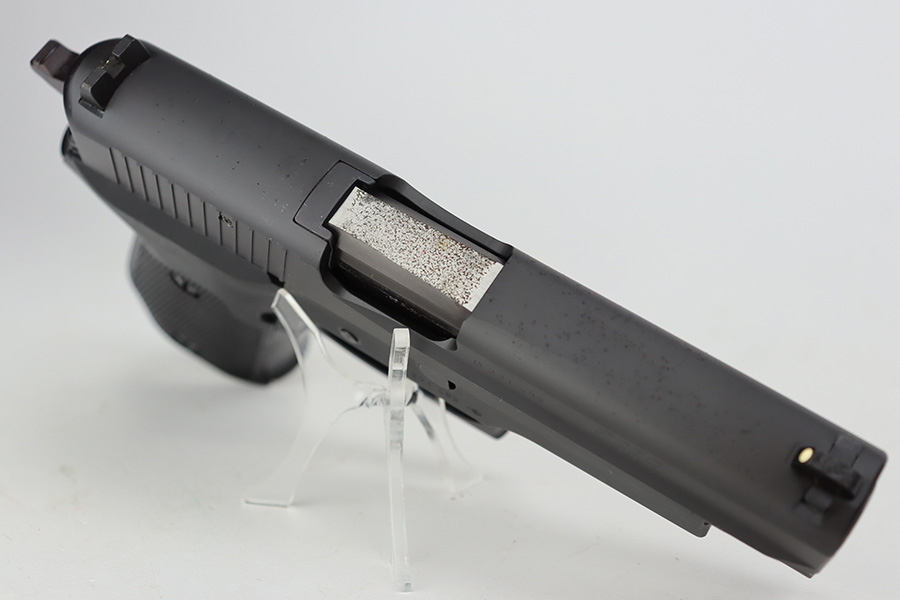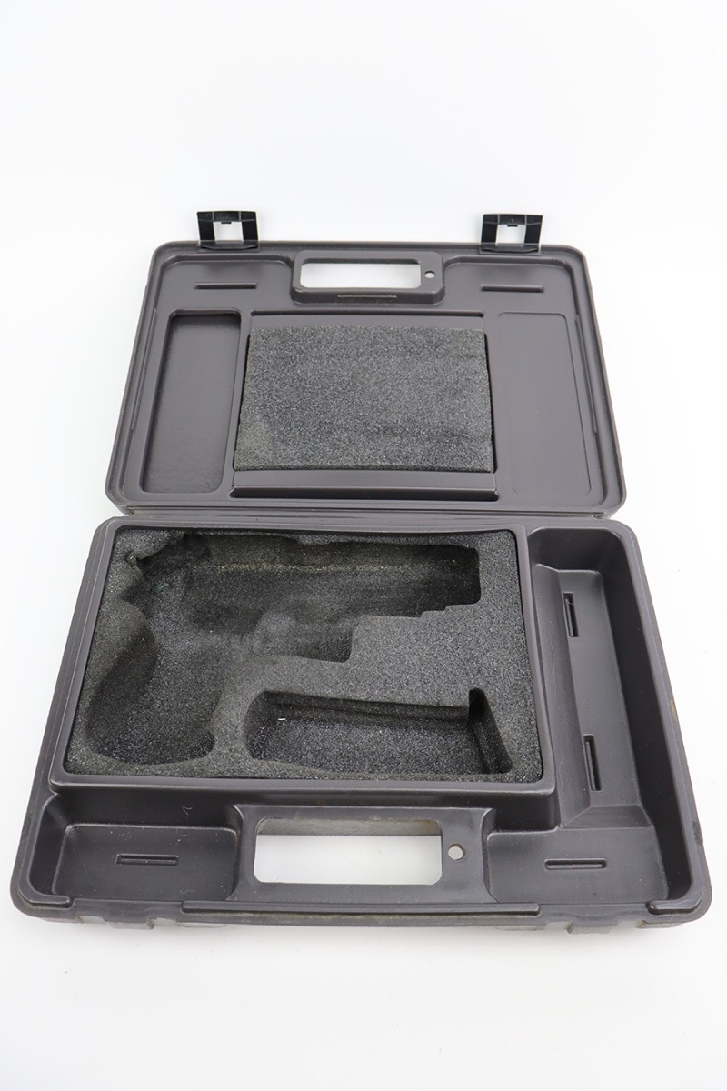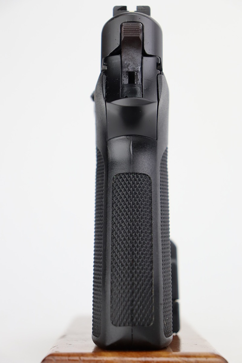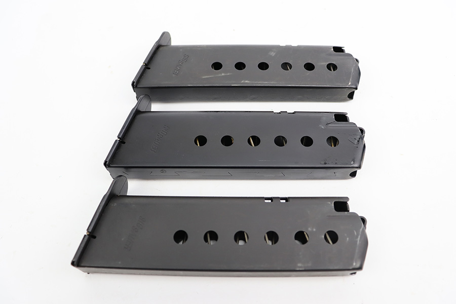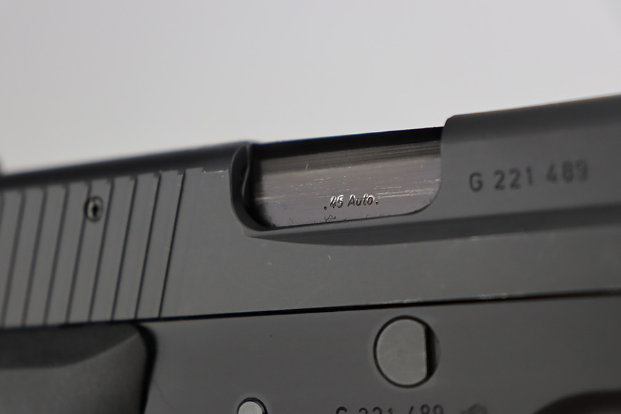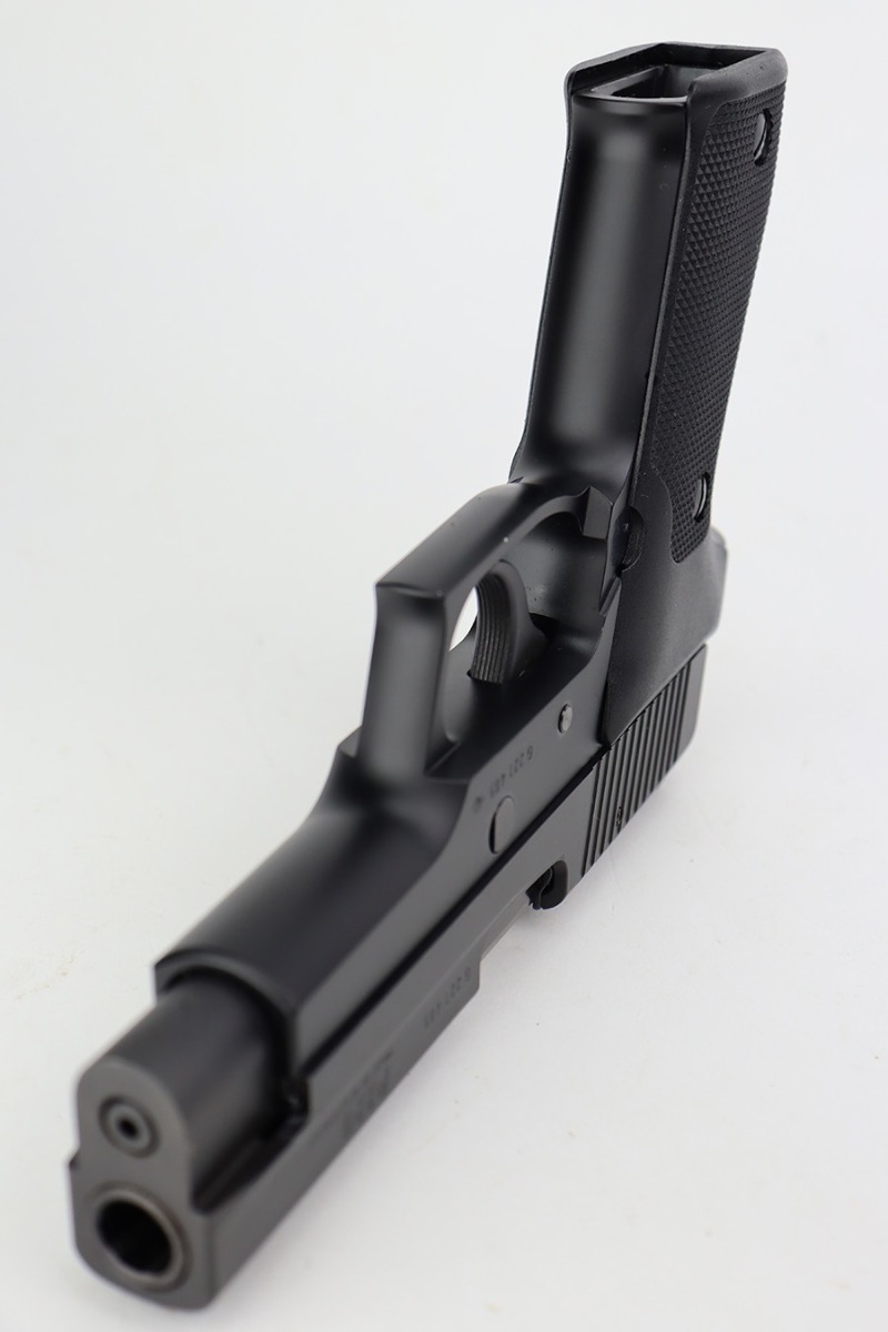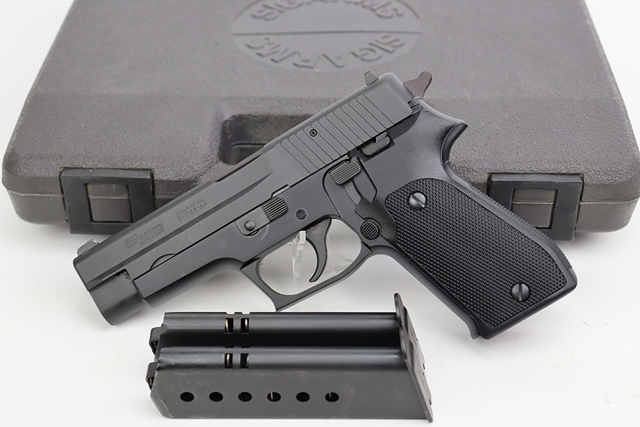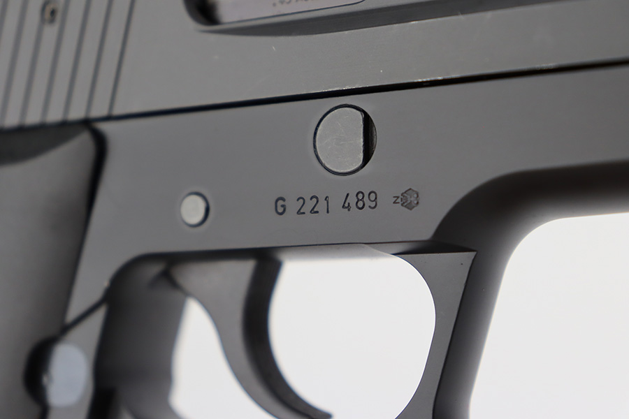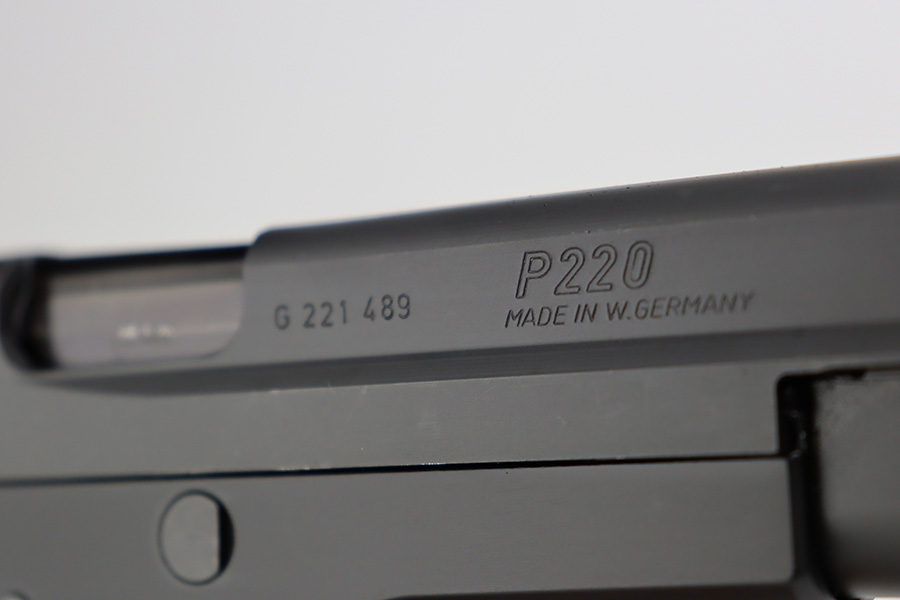 7/11/23 – This is a like-new example of a Sig Sauer Model P220, chambered in .45 ACP. All matching with the proper West German proofs. Comes with its factory hard case (not numbered) and three magazines. The gun itself shows almost no signs of wear except for some very light spotty oxidation in the ejection port. Fitted with excellent black plastic grips. Mint bore.