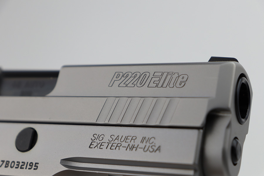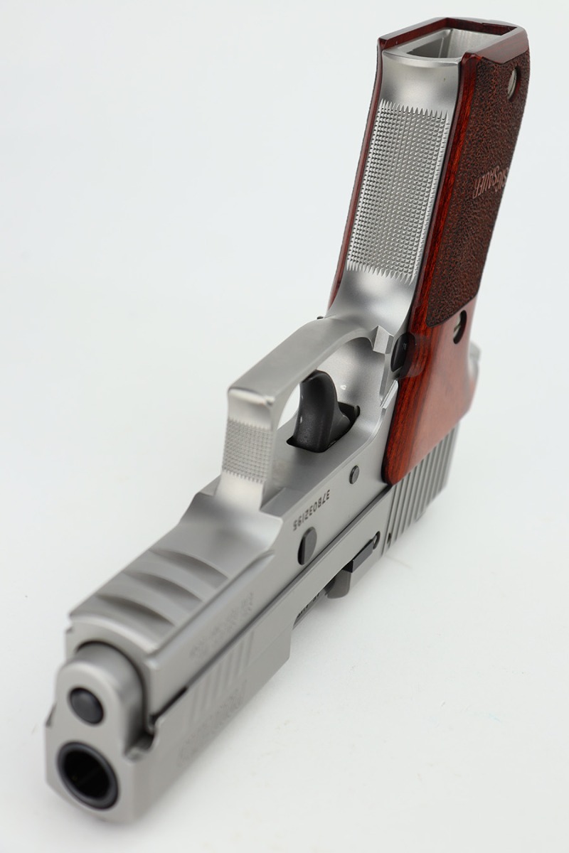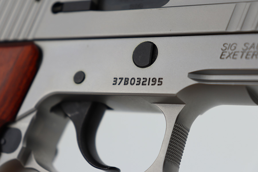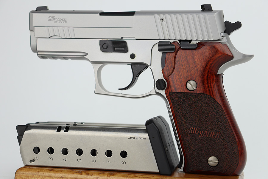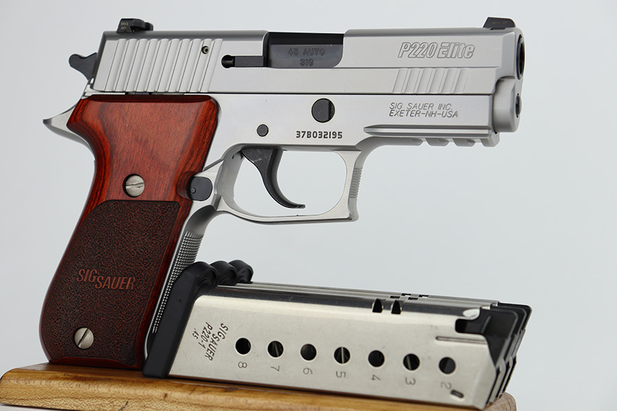 12/15/23 – This is a like-new Sig Sauer P220 Elite, chambered in .45 ACP. It has a really nice matte stainless finish and is fitted with beautiful cherry-colored wood grips. No sign of wear or use. Mint bore. It comes with its original matching-numbered hard case, owners manual, three magazines, and gun lock.