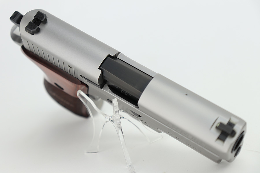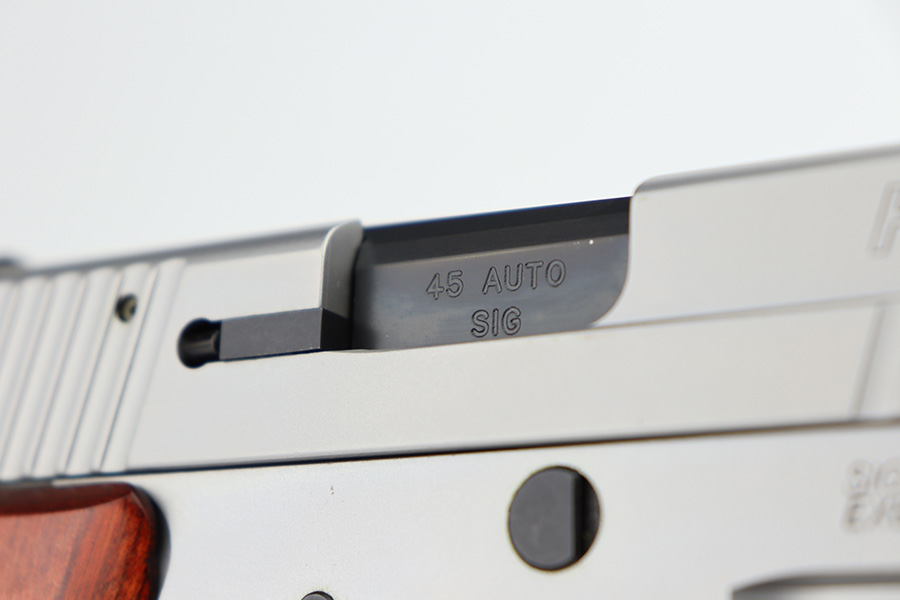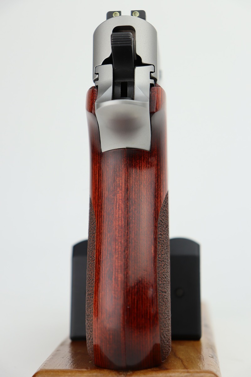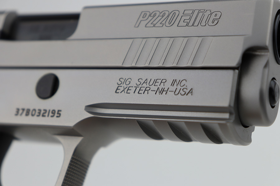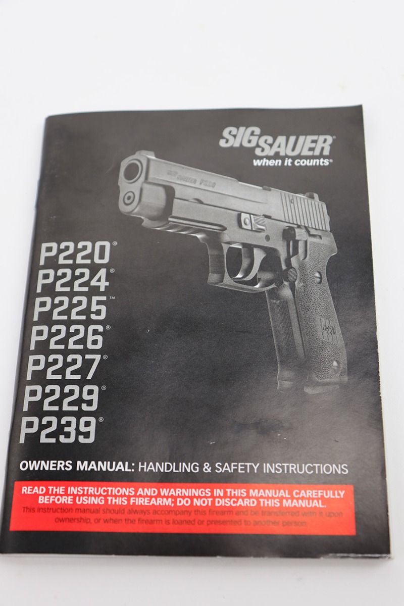 12/15/23 – This is a like-new Sig Sauer P220 Elite, chambered in .45 ACP. It has a really nice matte stainless finish and is fitted with beautiful cherry-colored wood grips. No sign of wear or use. Mint bore. It comes with its original matching-numbered hard case, owners manual, three magazines, and gun lock.