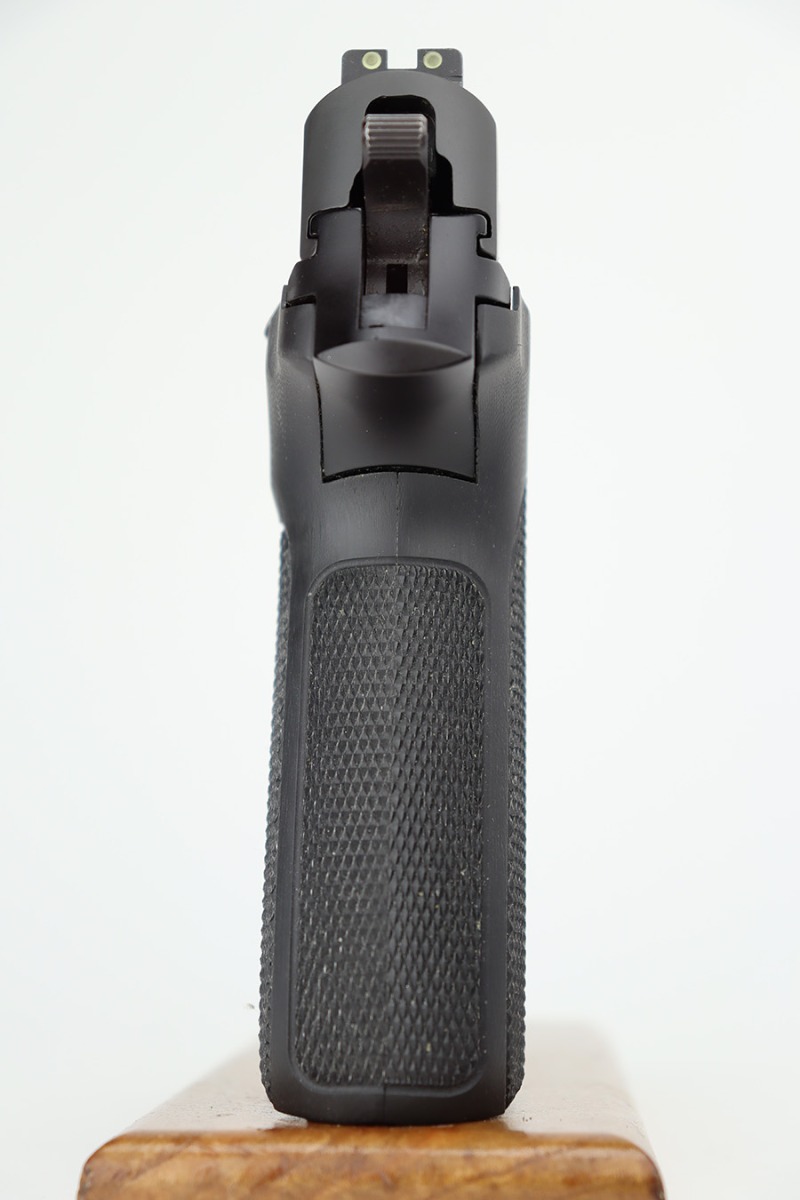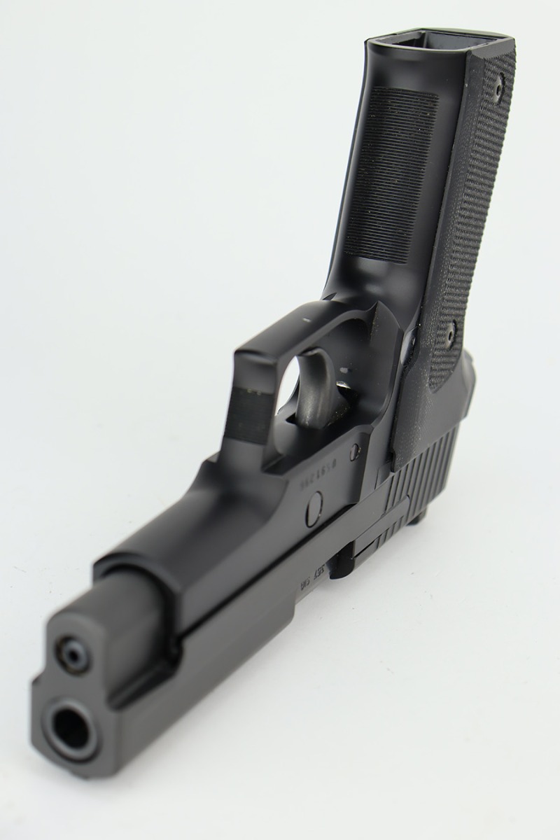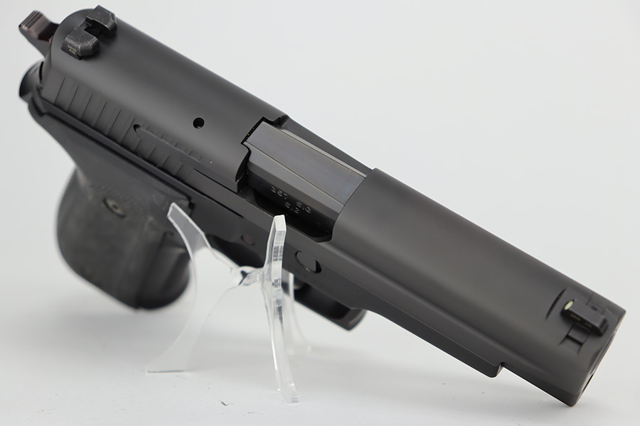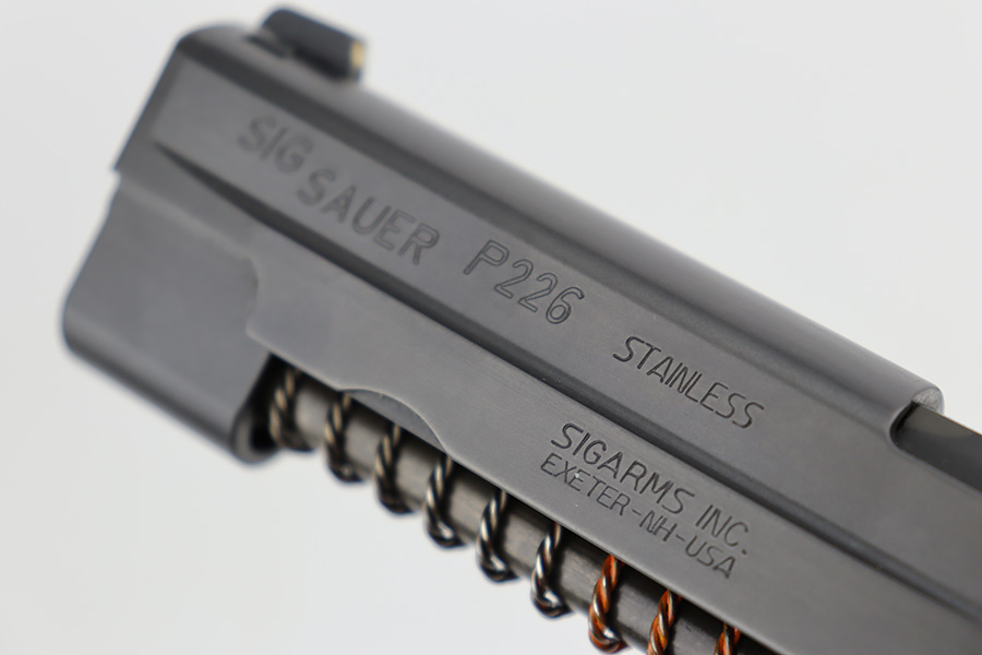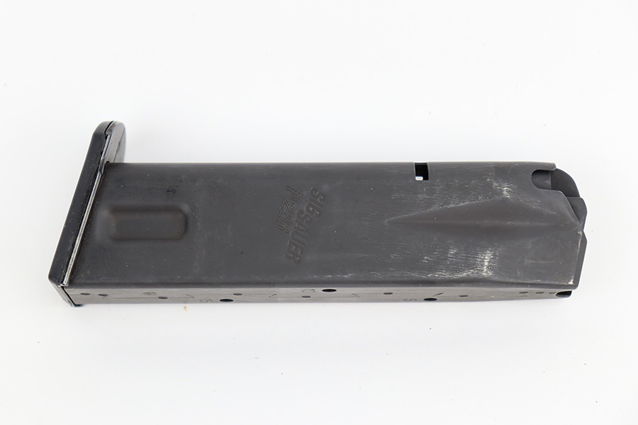 6/26/23 – This is an ANIB Sig Sauer P226 in the original, matching box. Made in 1997, this one also comes with a .357 Magnum conversion kit. The pistol was photographed with the .357 slide in place but the box as labeled is for a 9mm example. The 9mm slide has no wear but the ejection port shows minor use. Both barrels have mint bores, and the .357 slide appears unfired/like new. Total of two magazines, one for each caliber. Manuals included.