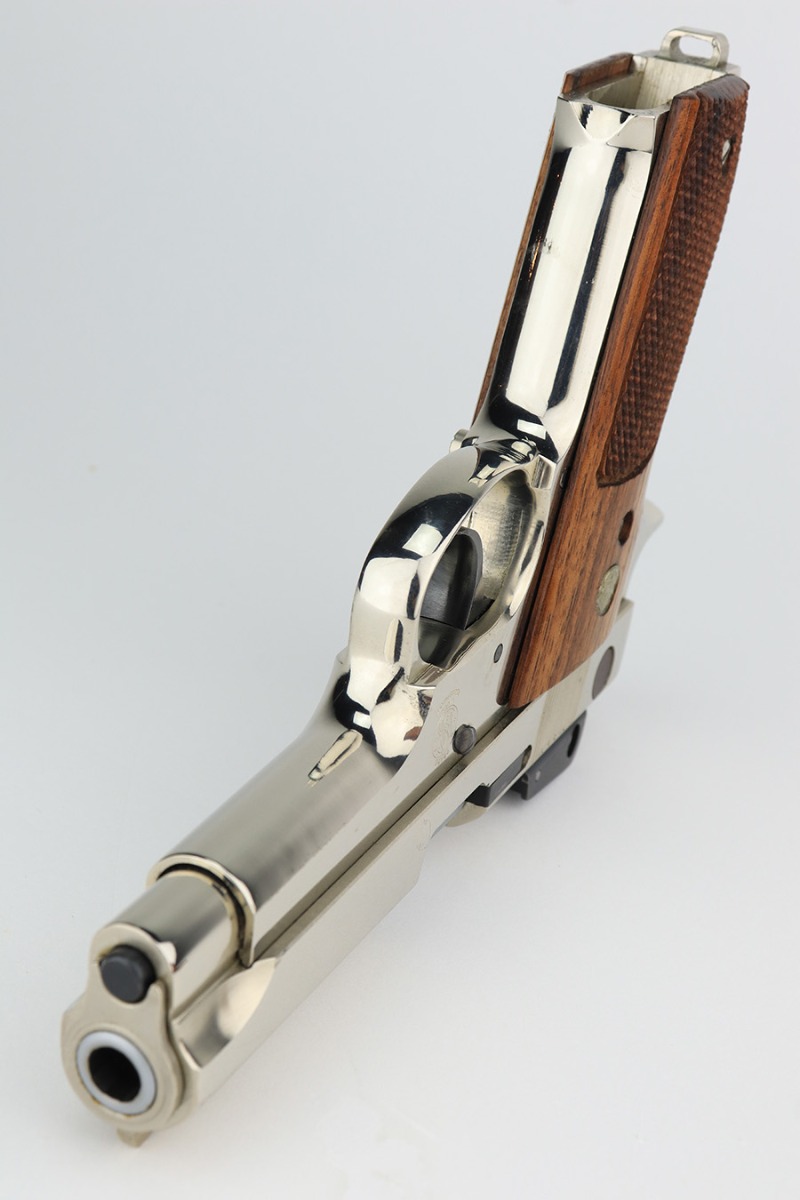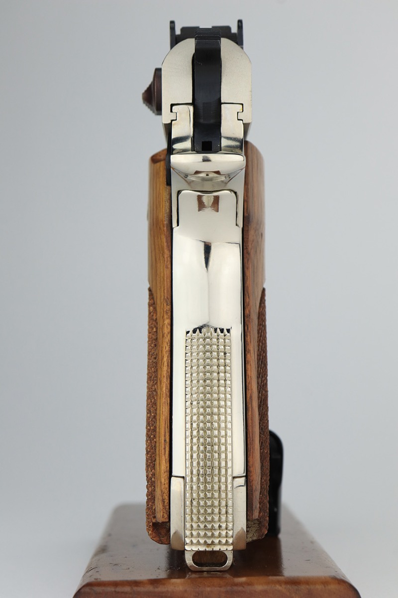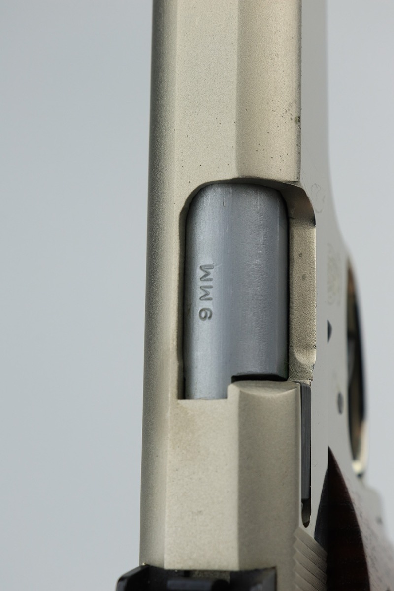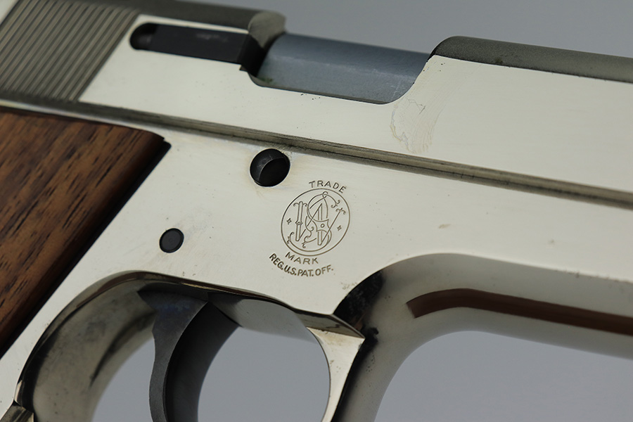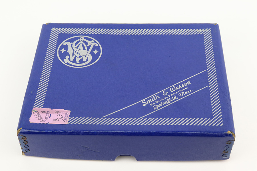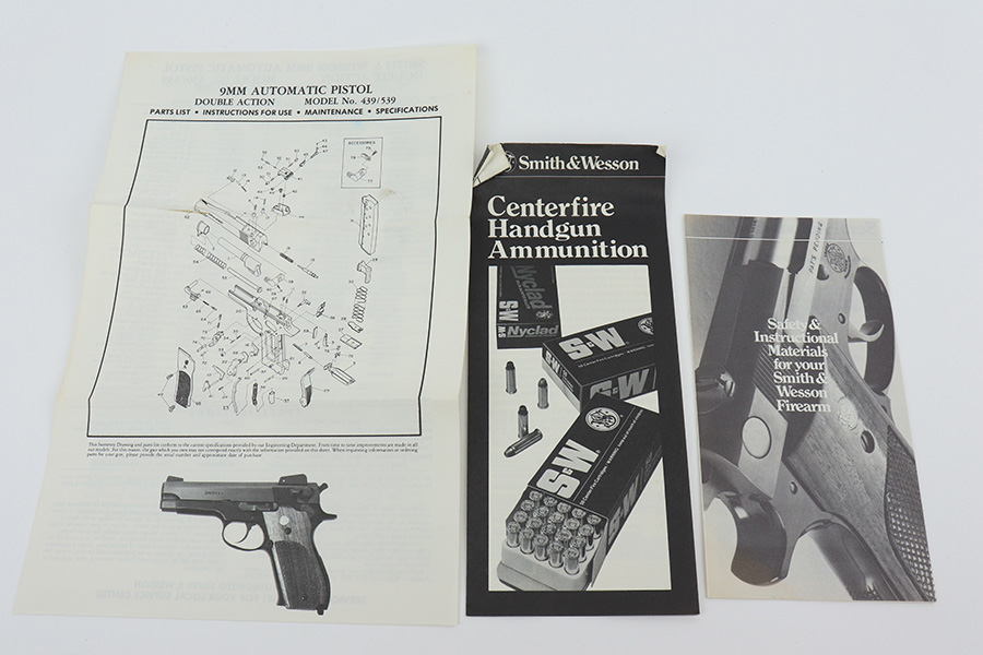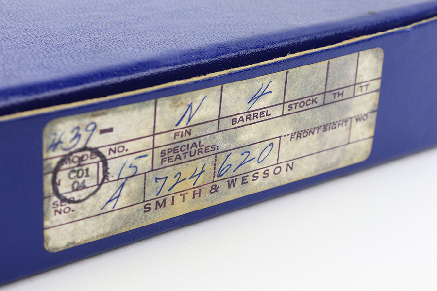 2/1/23 – This is a near-mint Smith & Wesson 439 in its original, matching box. It’s a more scarce example with factory nickel finish. It has just a few tiny spots of handling wear and a very minor scratch on the front strap. Minty bore and grips. These were all made with a 4in barrel from 1981-88. The box has a spare magazine and the S&W extras. This one also has the adjustable sight upgrade.