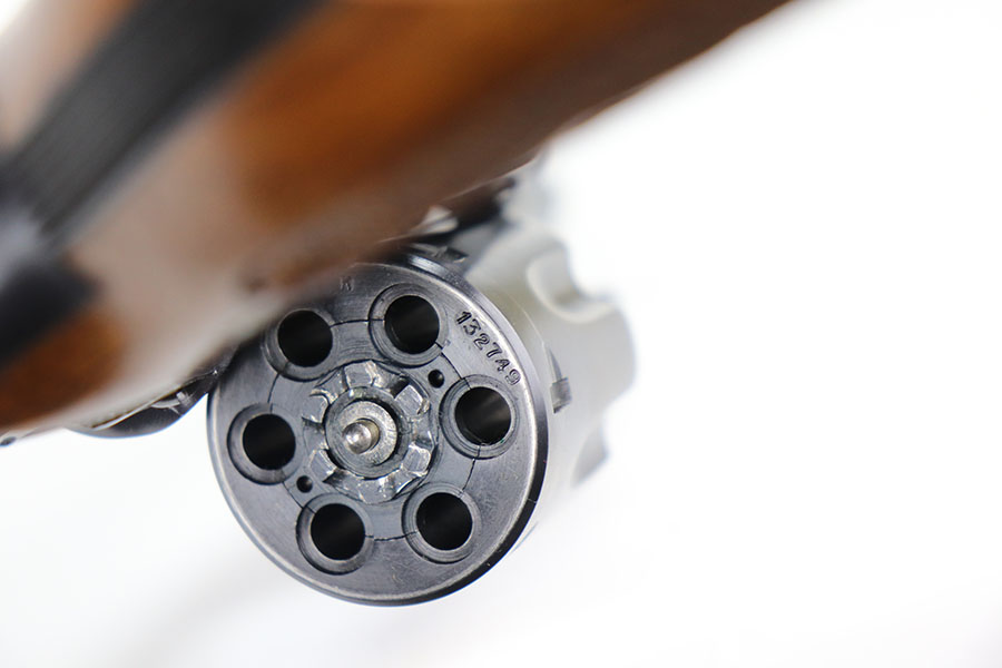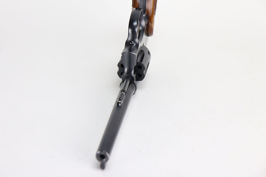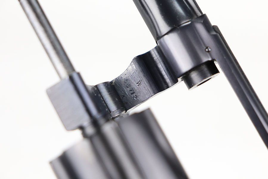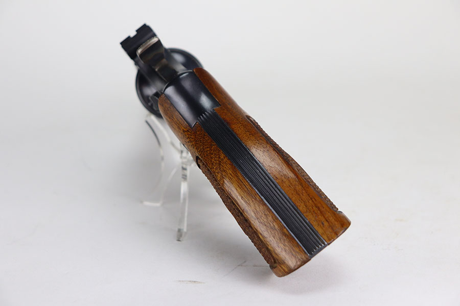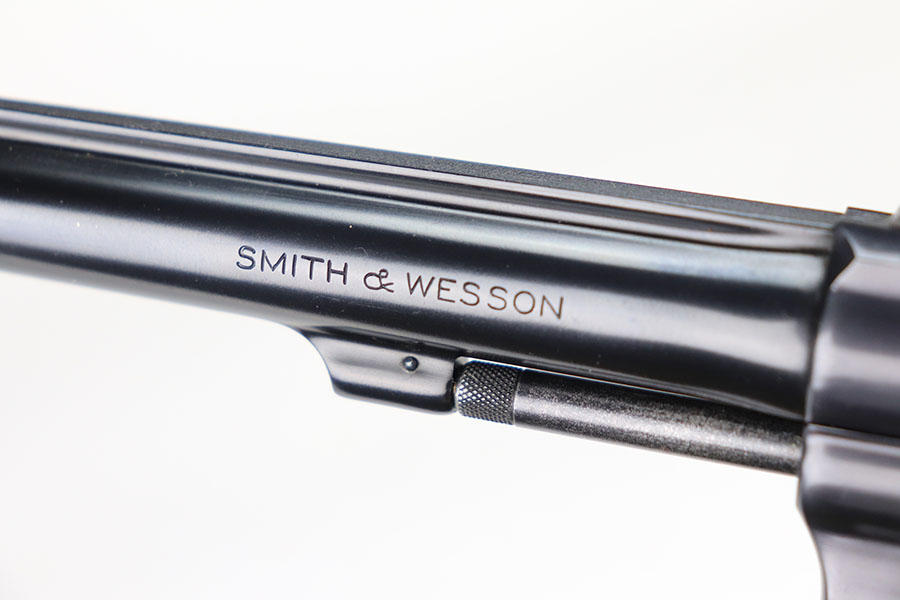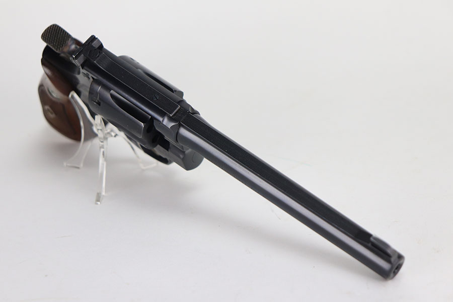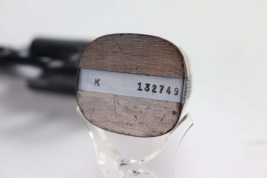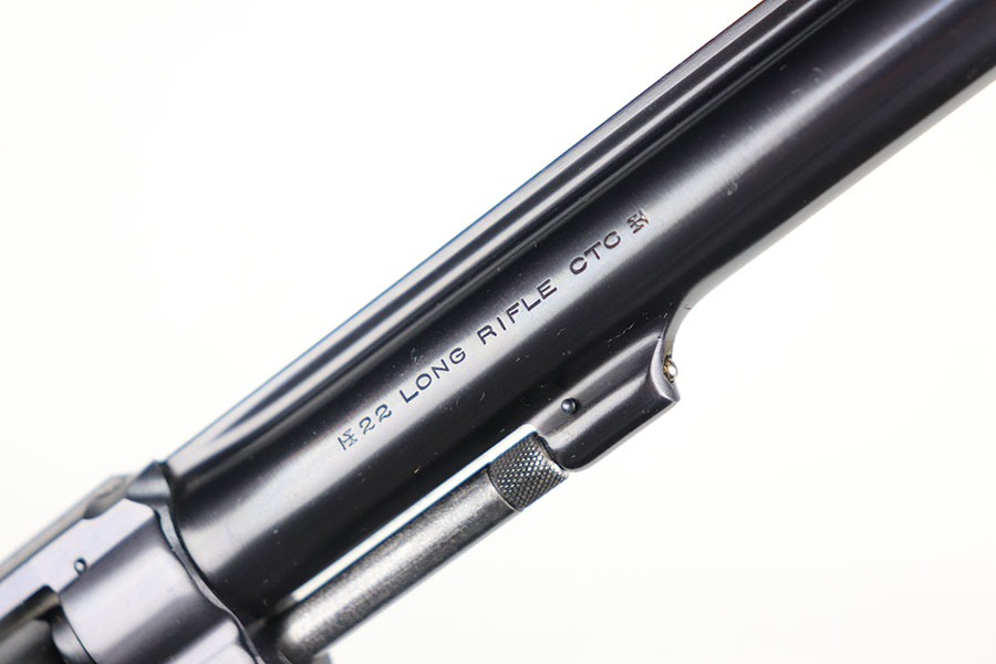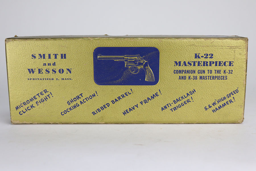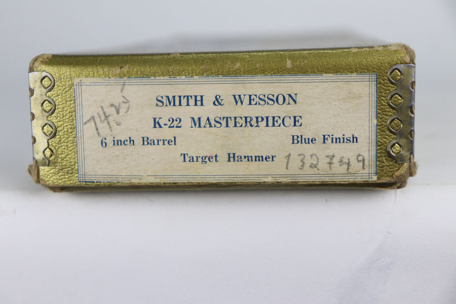 4/22/21 – This is a near-mint Smith & Wesson K-22 Masterpiece Pre-17 model revolver in the original box. It was made in 1950, and has just minor muzzle wear and a roll mark on the cylinder. Beautiful condition overall. All original, including the original grips with matching numbered right panel. Six inch barrel with a mint bore. The original S&W box is included and has the matching serial number of the revolver on the label. Hischier collection.