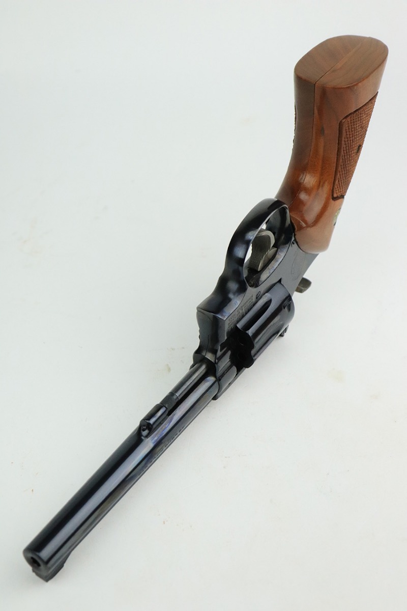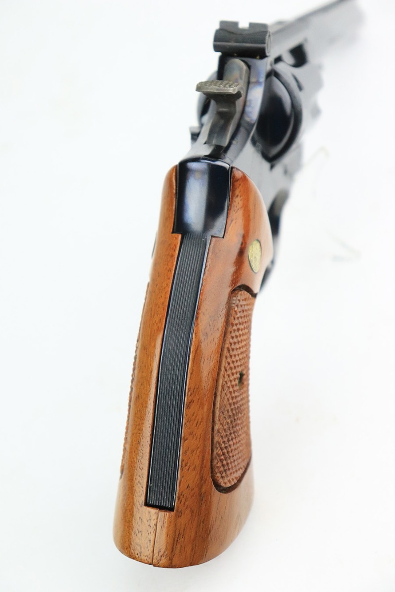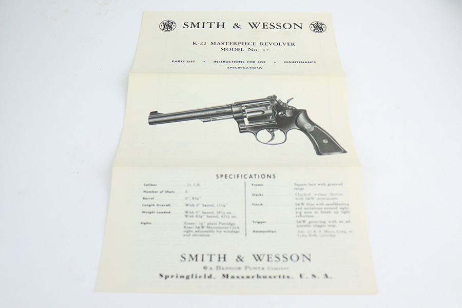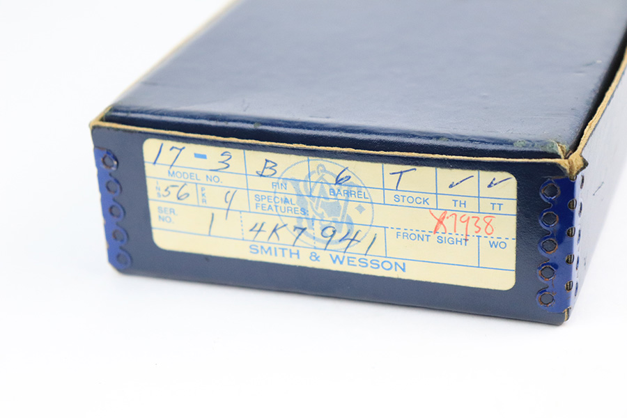 7/28/22 – This is a gorgeous example of a Smith & Wesson K-22 Masterpiece Model 17-3 Revolver manufactured in 1977. 6″ barrel and chambered in .22 LR. The gun comes with its original matching-numbered box, owners manual, and un-opened cleaning kit. It is in mint condition with virtually no signs of wear – there is barely even a hint of a roll mark on the cylinder. Comes with mint Walnut grips. The bore is factory-new. The cylinder is tight, and the action is very smooth.