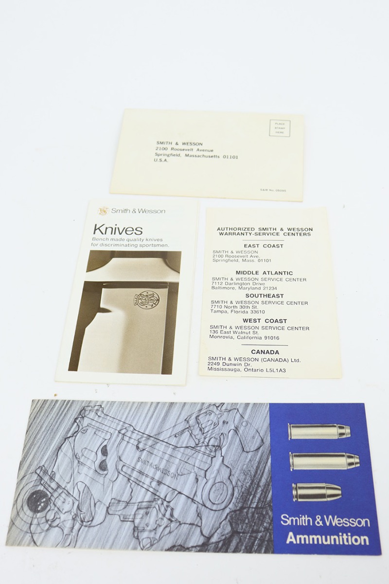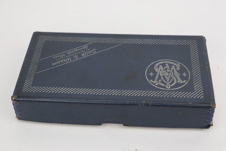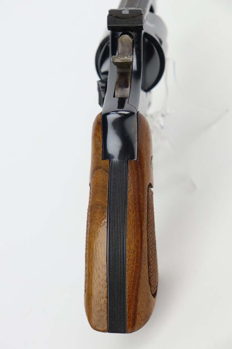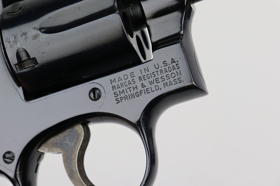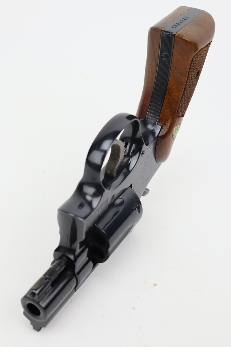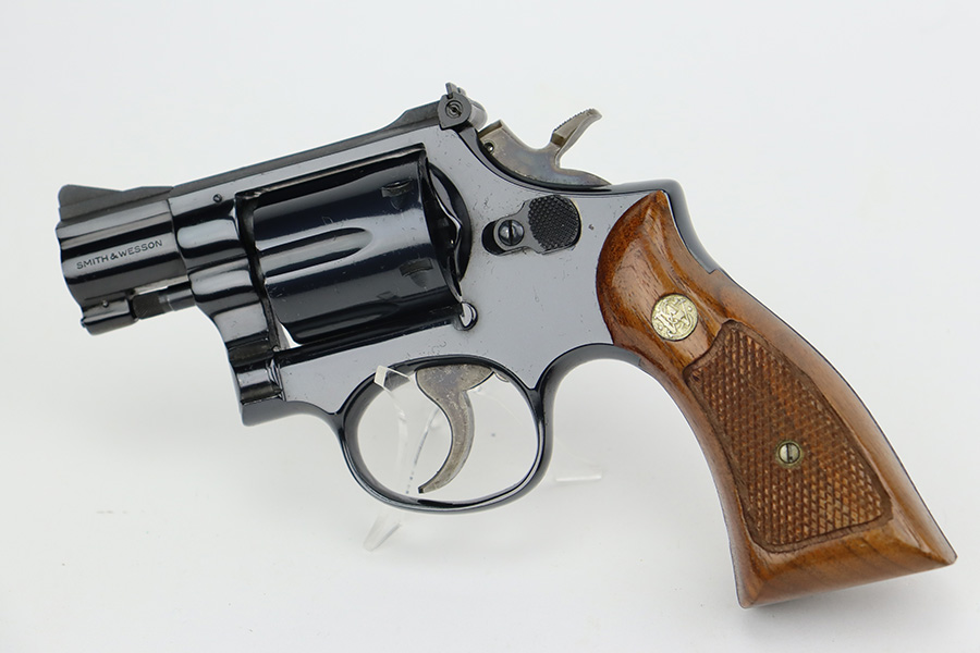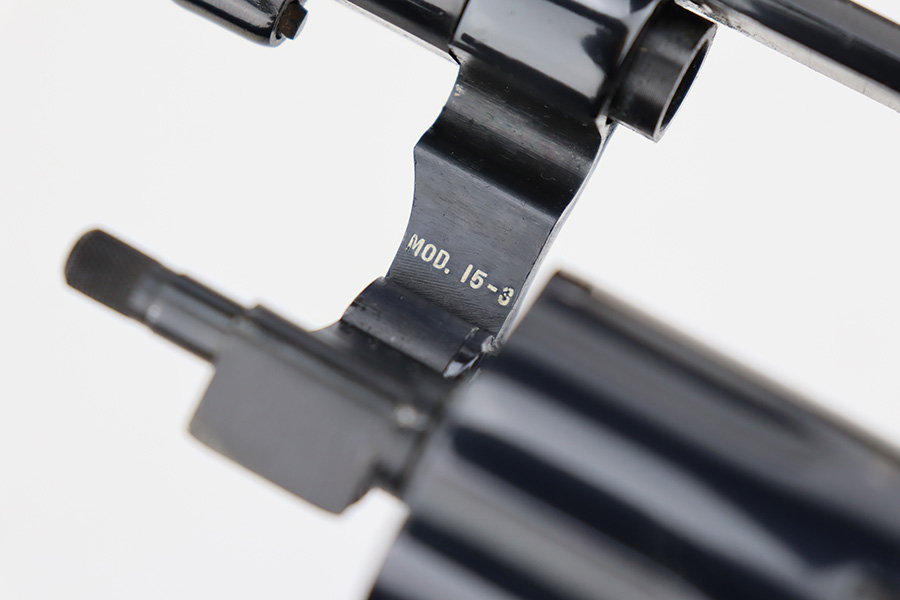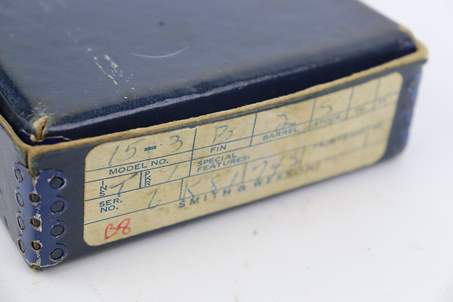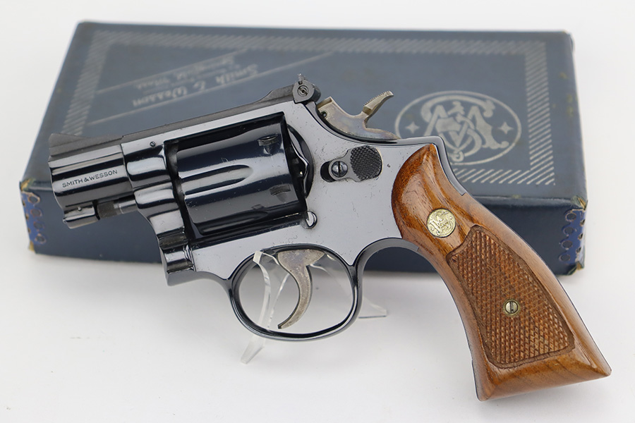 8/25/23 – This is a minty Smith & Wesson Model 15-3 revolver in the original box. Made in 1974 , this revolver has 99% of the original blue remaining with only a minor turn line on the cylinder. There’s no other bluing loss to mention but there is a small patch of pinpricking/oxidation on the cylinder. Two inch barrel with mint bore. Excellent grips with no defects.