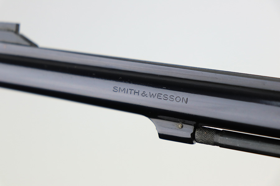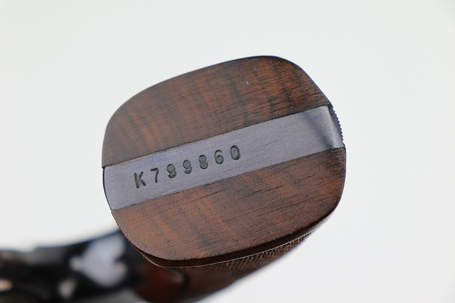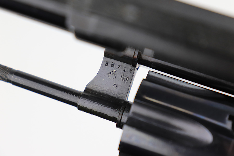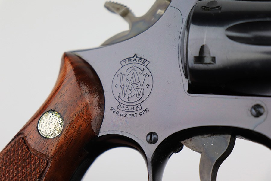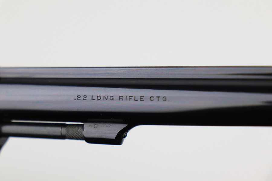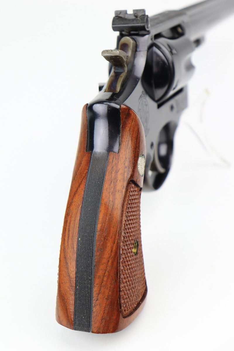11/29/22 – This is a mint Smith & Wesson Model 17-3 revolver in its original, matching box. Made in 1968, it appears nearly unfired with a mint bore. Hardly even a turn line on the cylinder. Beautiful case hardening on trigger and hammer. Original, minty grips with matching right panel. C&R eligible. The box label is intact but the lid has notable cracking/holes.