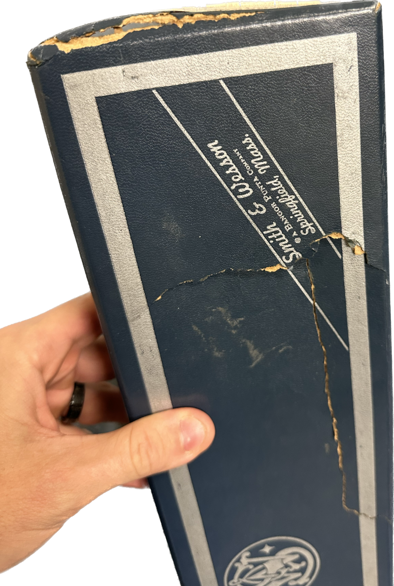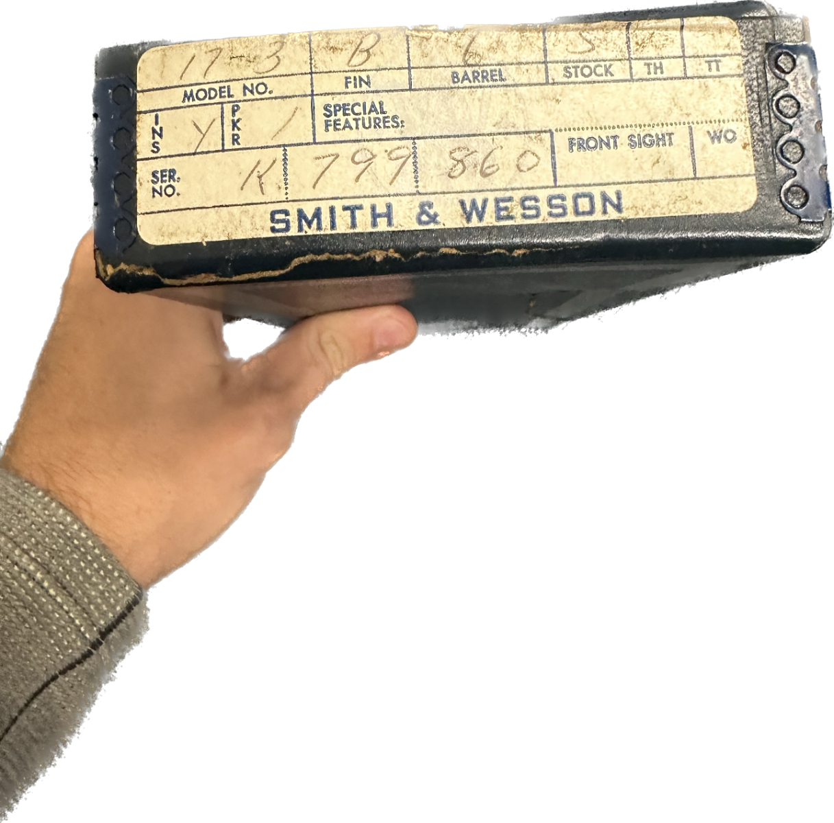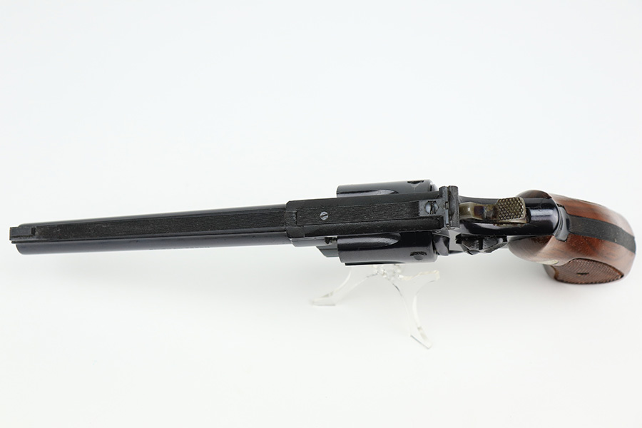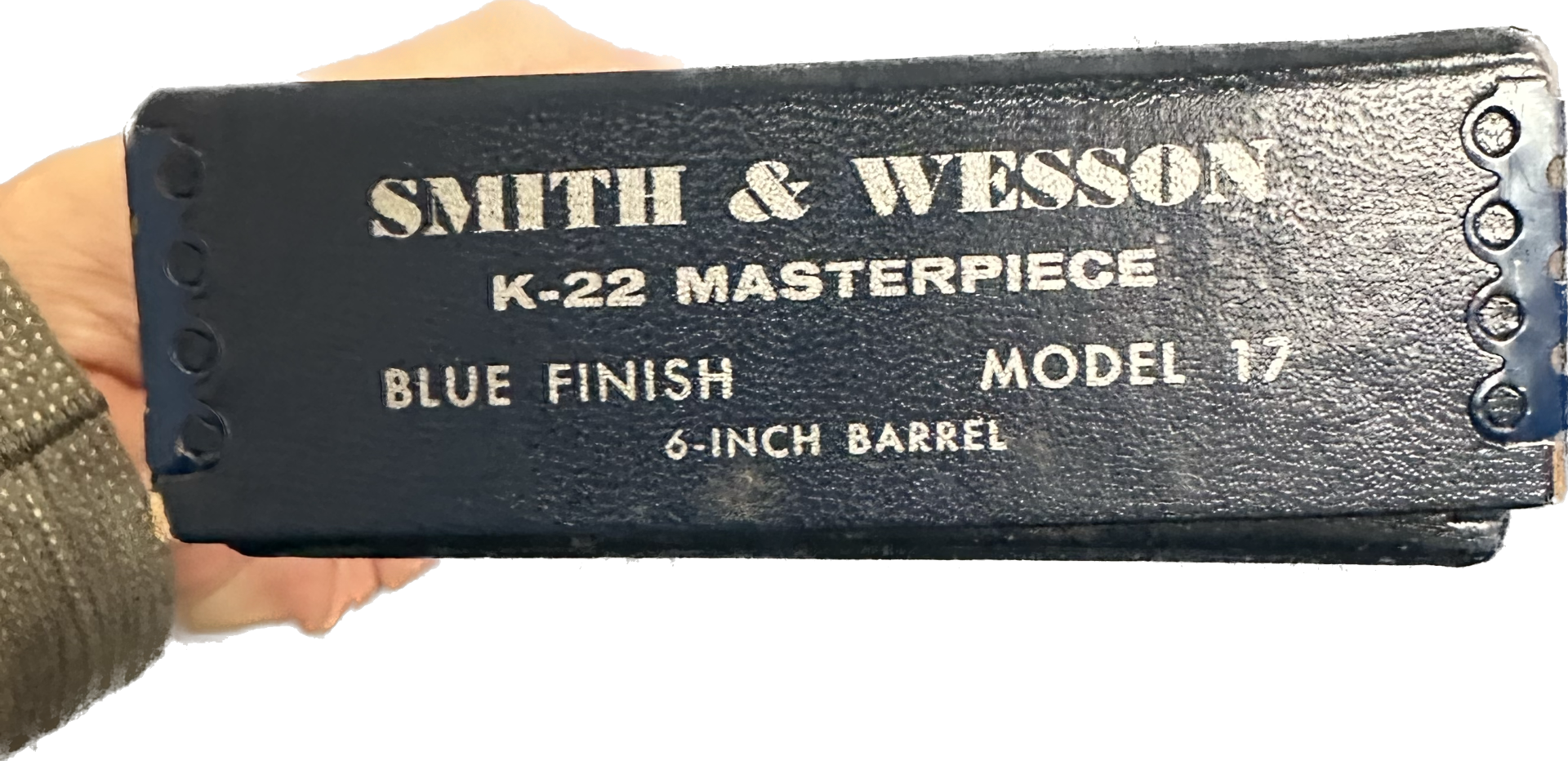 11/29/22 – This is a mint Smith & Wesson Model 17-3 revolver in its original, matching box. Made in 1968, it appears nearly unfired with a mint bore. Hardly even a turn line on the cylinder. Beautiful case hardening on trigger and hammer. Original, minty grips with matching right panel. C&R eligible. The box label is intact but the lid has notable cracking/holes.