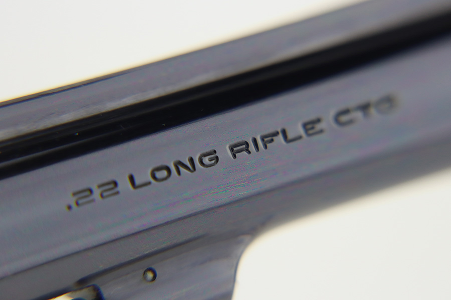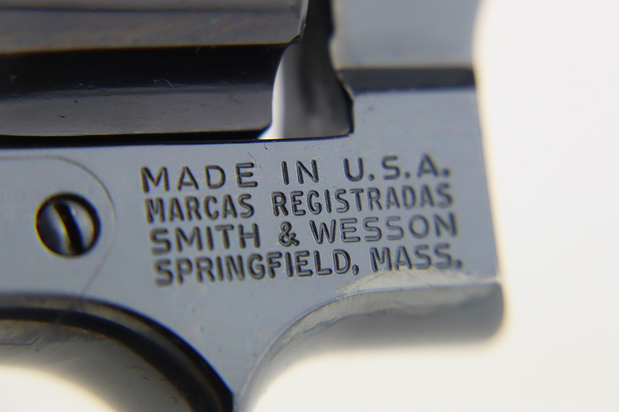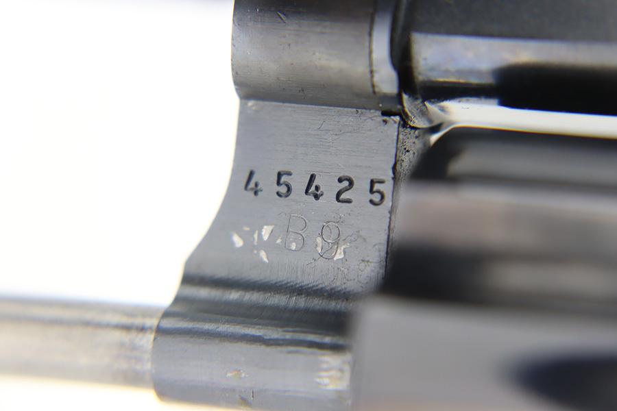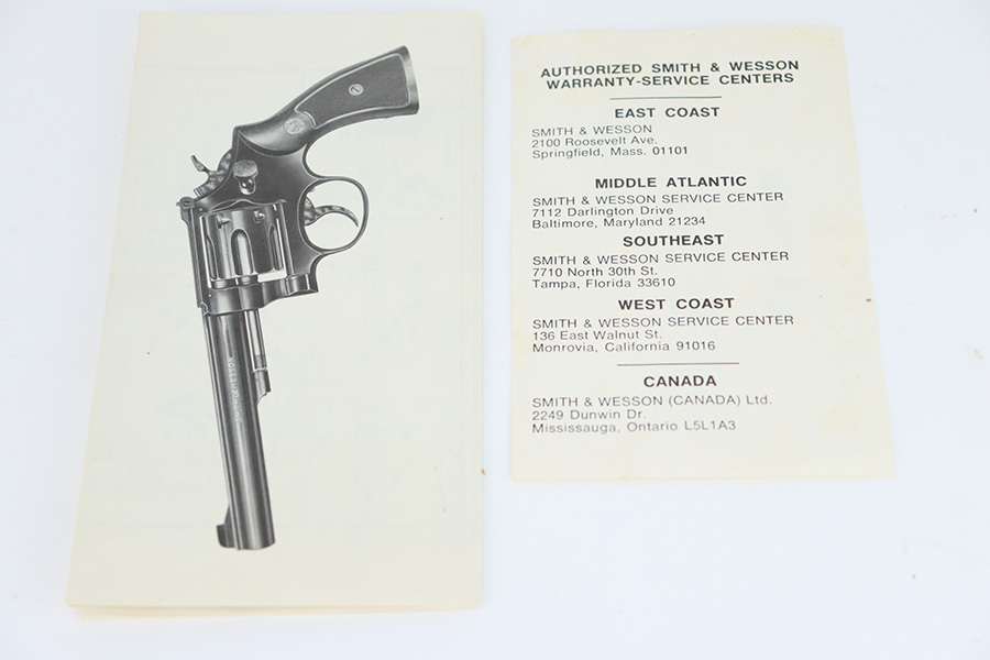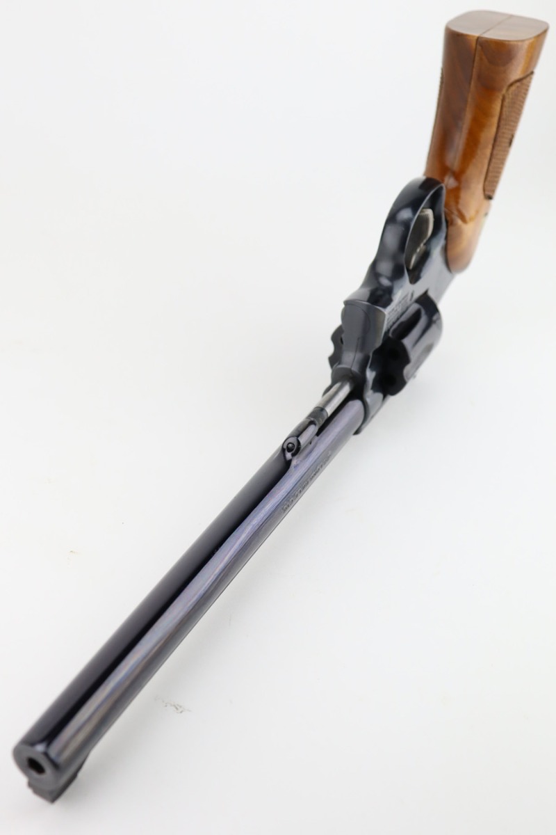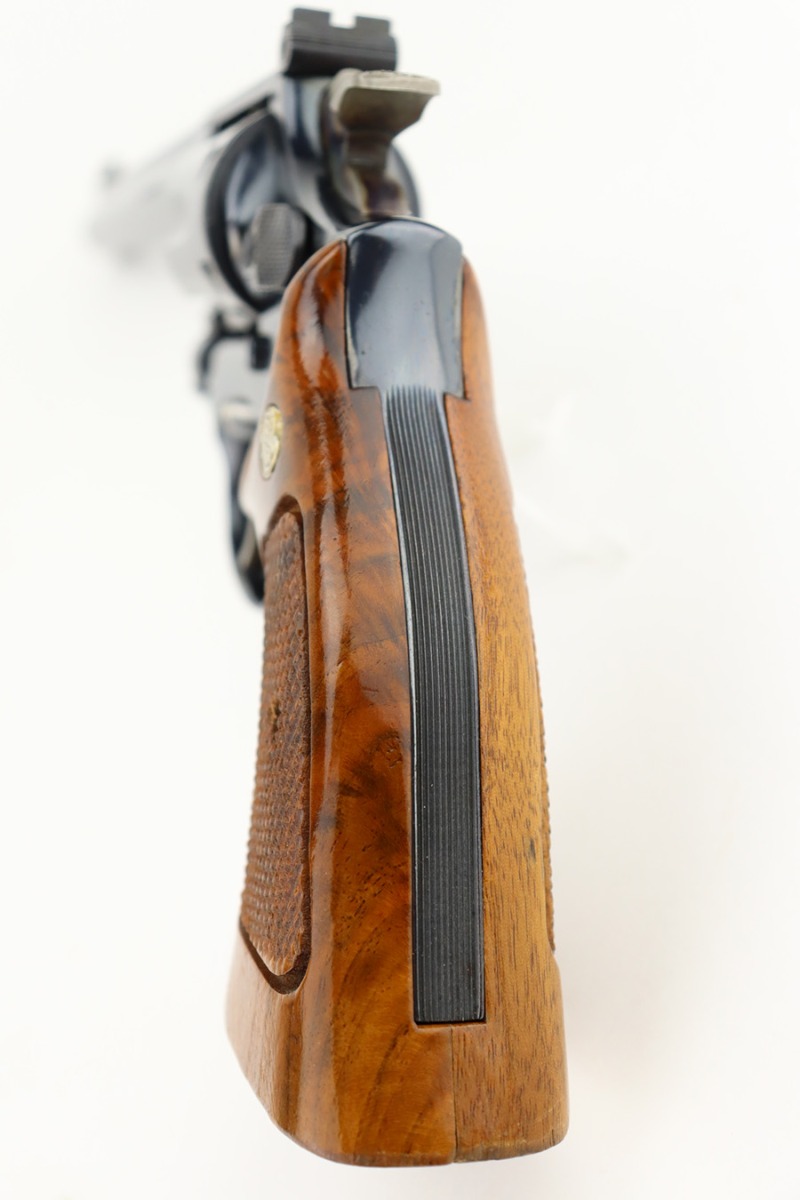 1/8/24 – This is a mint Smith & Wesson Model 17-3 from 1977. It is chambered in .22 LR with an 8 3/8″ barrel. It comes with its original matching-numbered box and owners manual. The gun itself has retained virtually all of its original high polish finish with just a very light roll mark on the cylinder. Excellent case-hardening on the small parts. Fitted with excellent hand-checkered Walnut grips. Mint bore. Smooth action.
