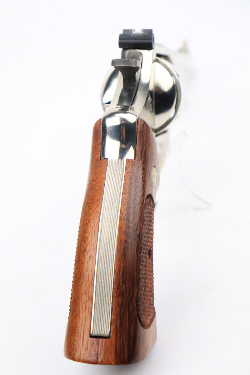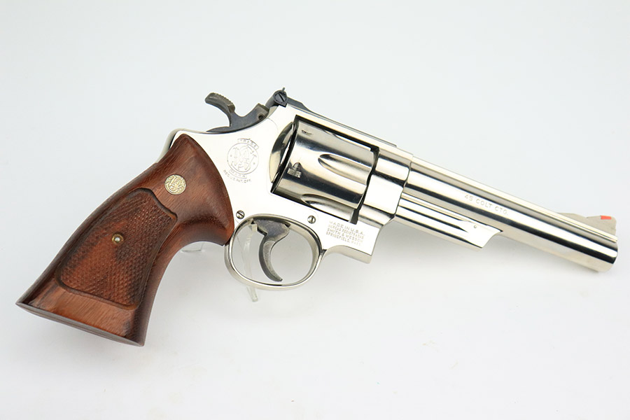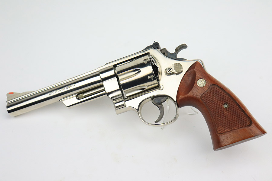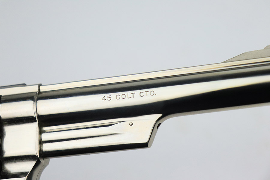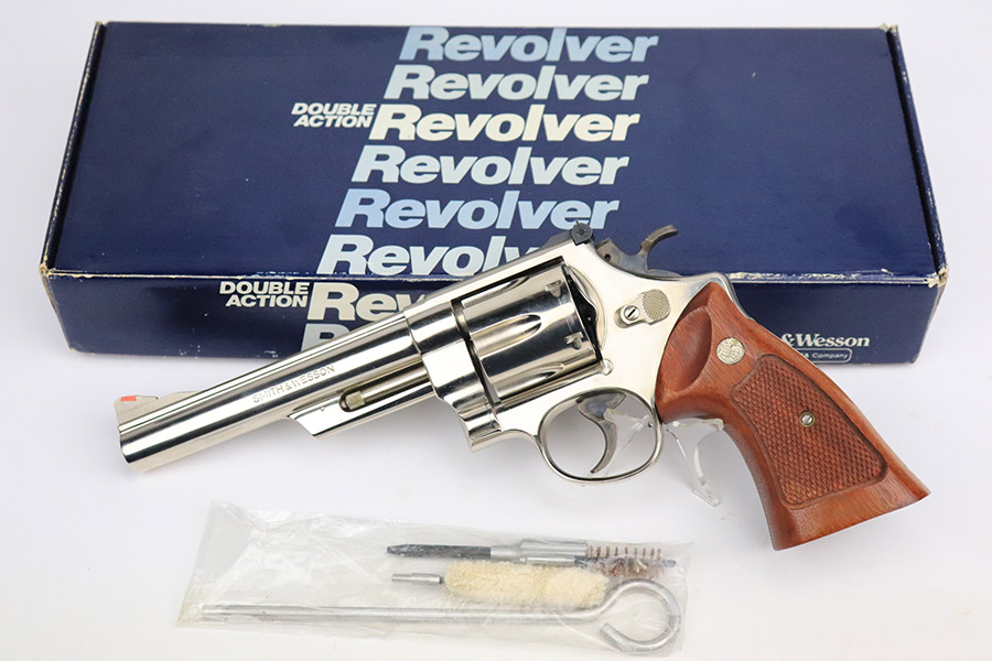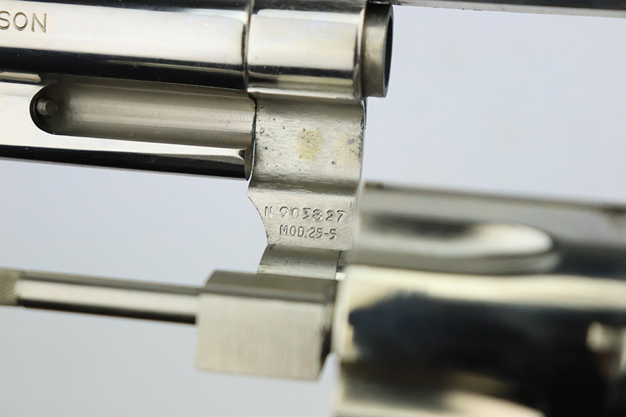 11/15/22 – This is a minty Smith & Wesson Model 25-5 in the original, matching box. It has 99% of the original nickel finish remaining, with a minor turn line on the cylinder. Mint bore and grips. Six inch barrel. Comes with the S&W box, insert and cleaning tools. FFL required.