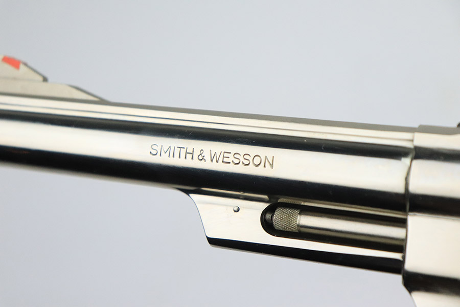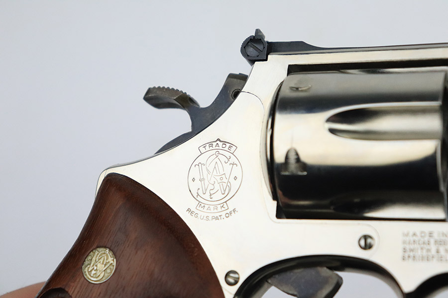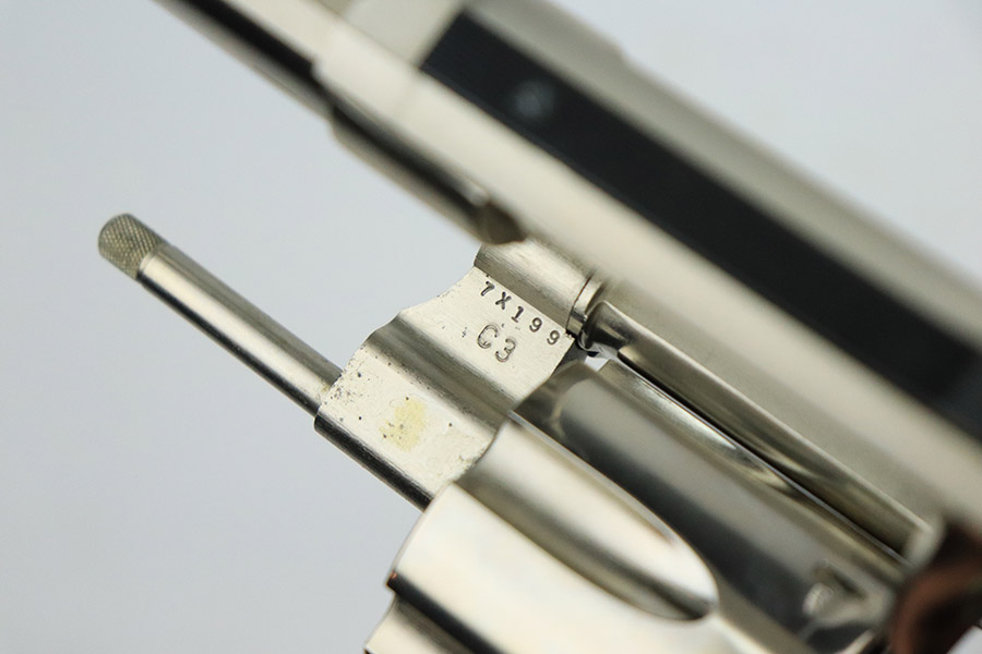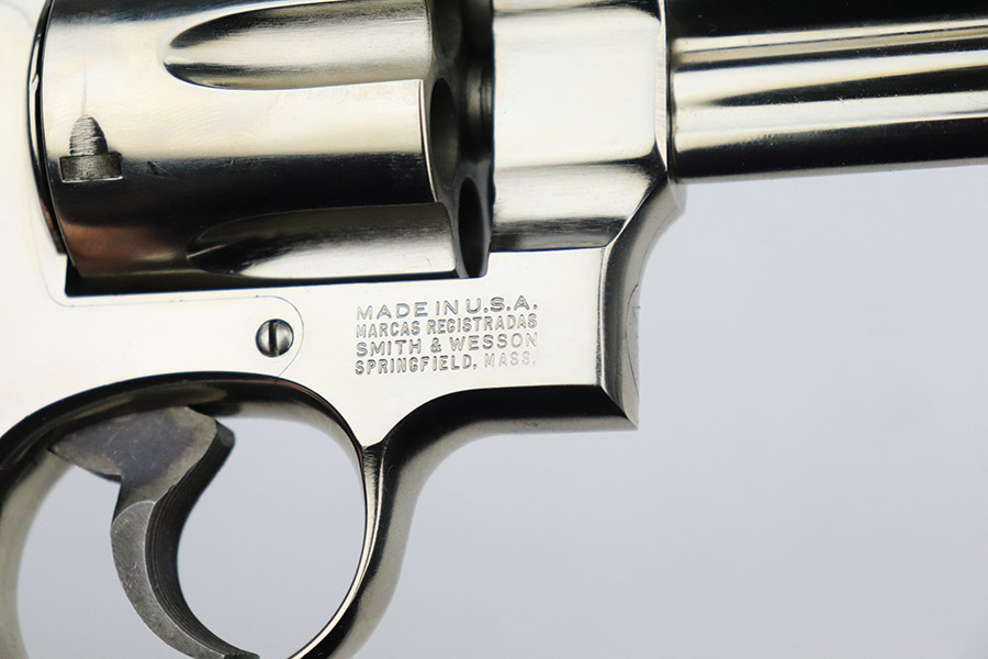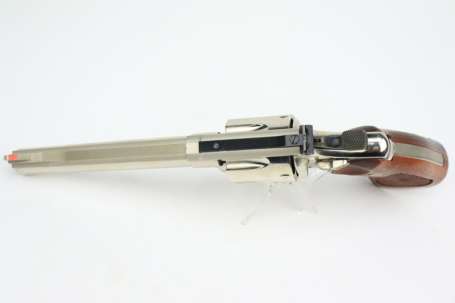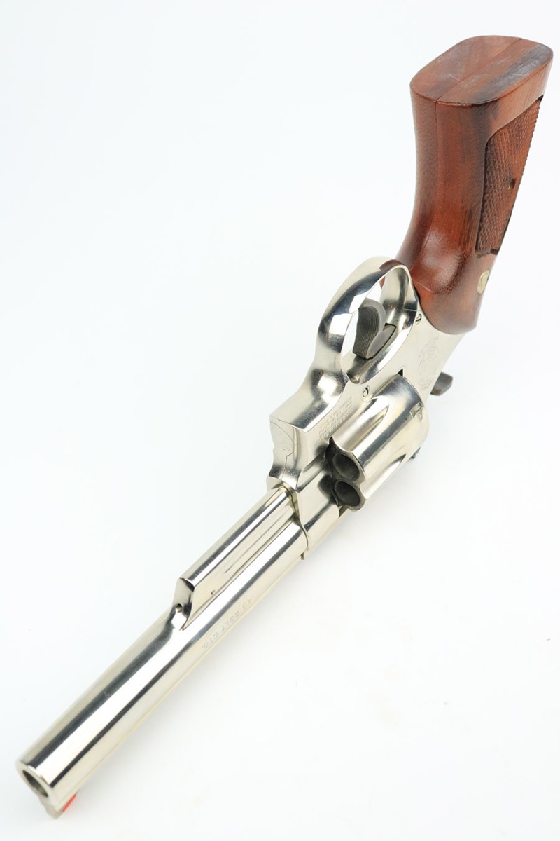 11/15/22 – This is a minty Smith & Wesson Model 25-5 in the original, matching box. It has 99% of the original nickel finish remaining, with a minor turn line on the cylinder. Mint bore and grips. Six inch barrel. Comes with the S&W box, insert and cleaning tools. FFL required.