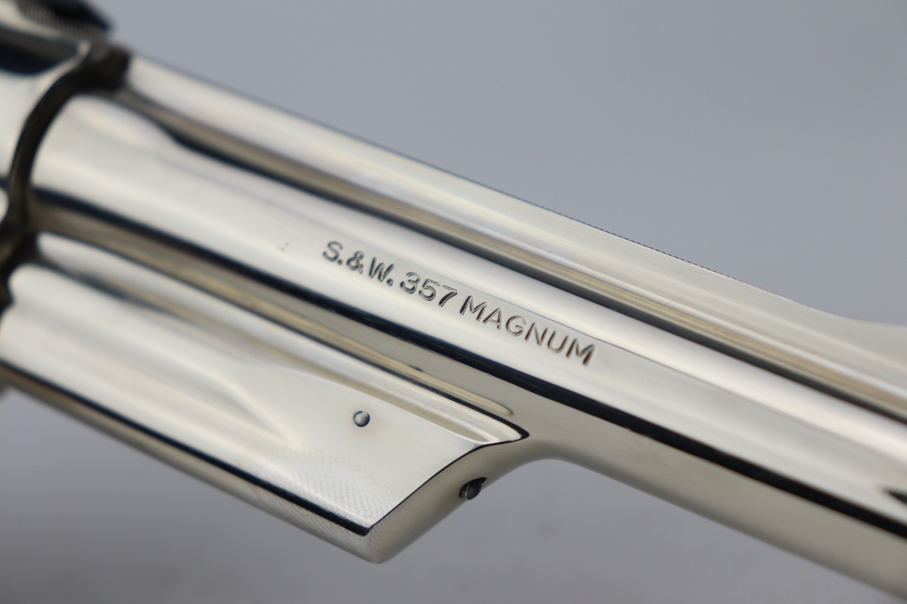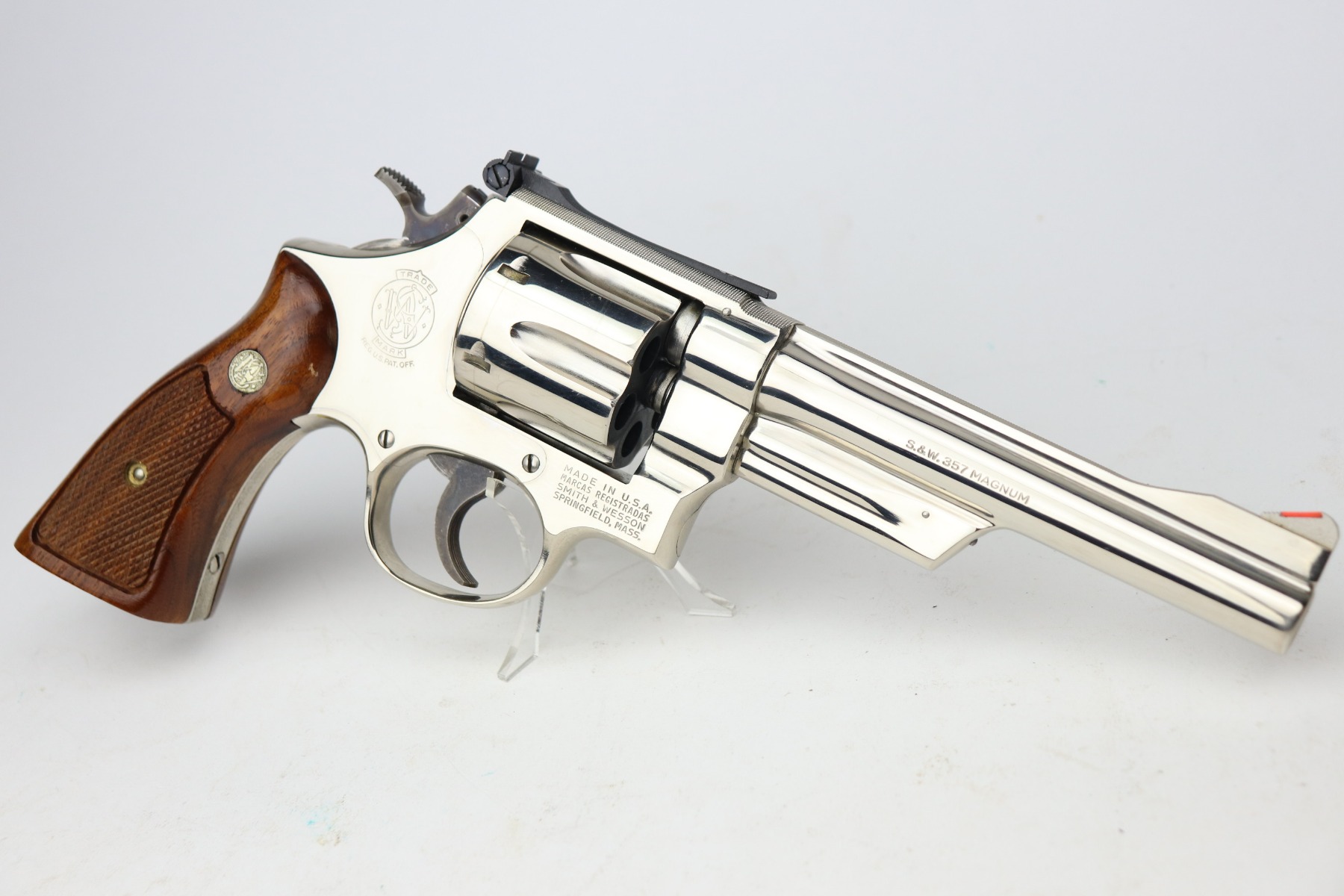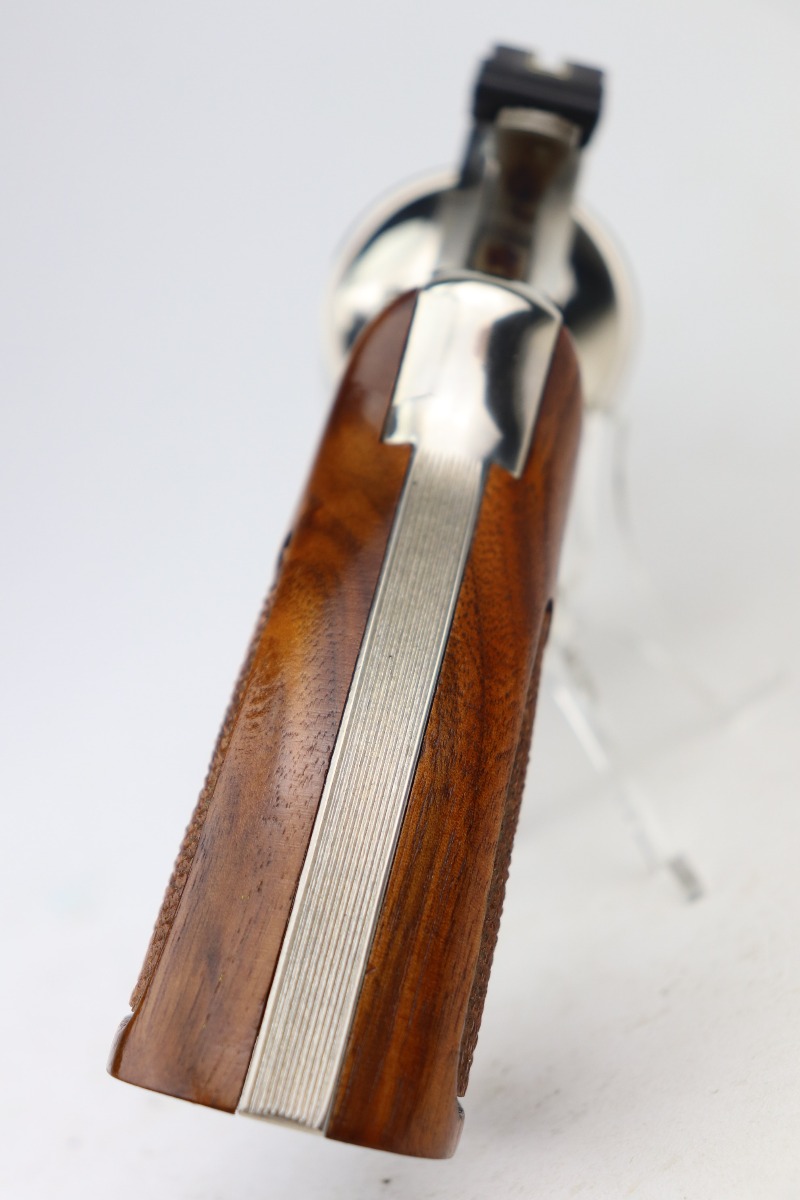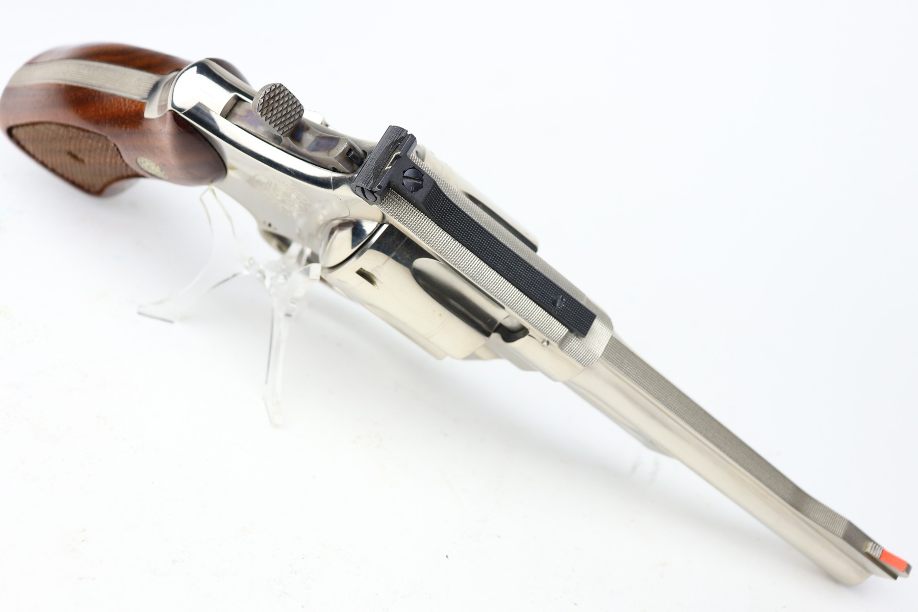 3/3/21 – This is a mint example of a Smith and Wesson Model 27-2 Revolver, chambered in .357 Magnum. 5.75 inch barrel. It was manufactured in the 1970’s. It comes with the original box (serialized to the gun). The gun is in mint condition except for some micro scratches in the finish here and there, a very faint roll mark on the cylinder, and a smudge on the left side of the frame. Mint grips. Mint bore. The cylinder is tight and the action is smooth. It also comes with a grip extension.