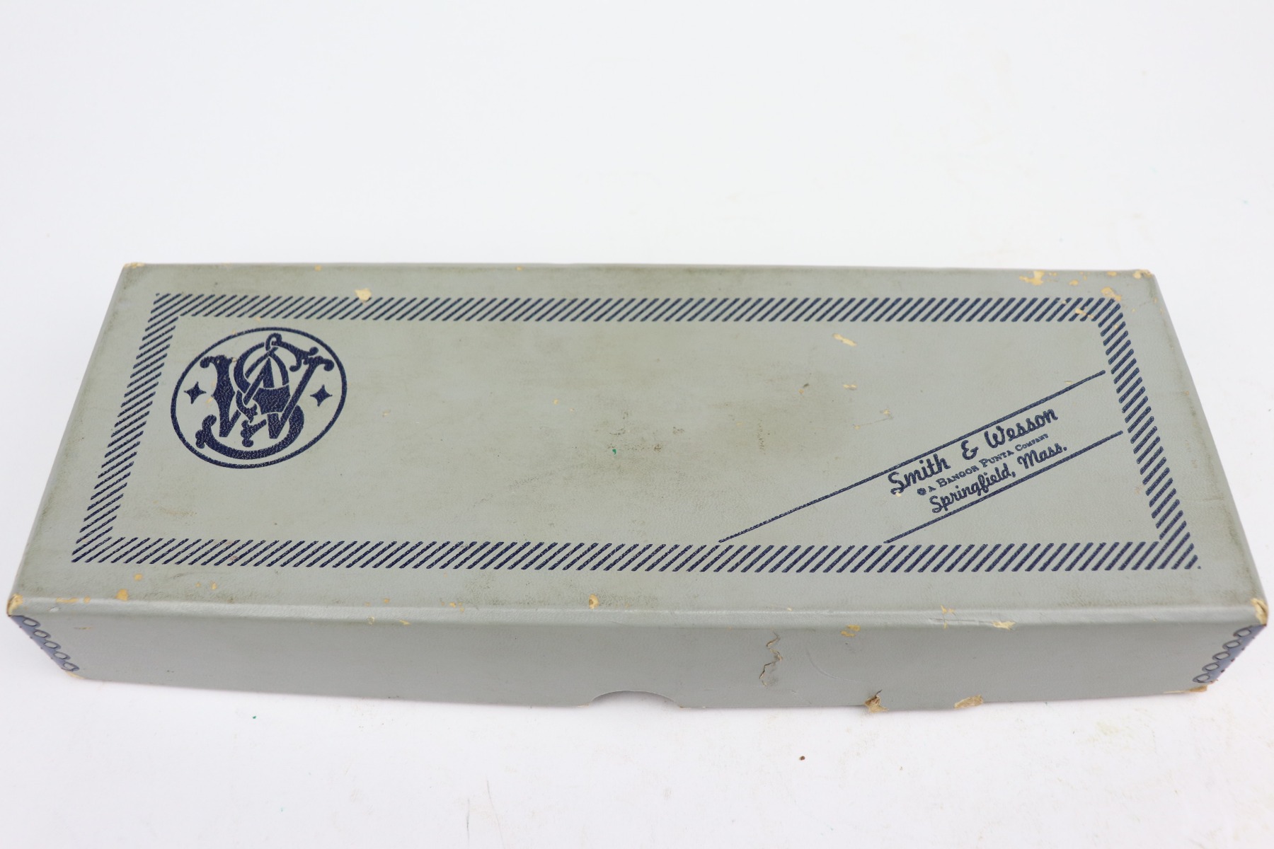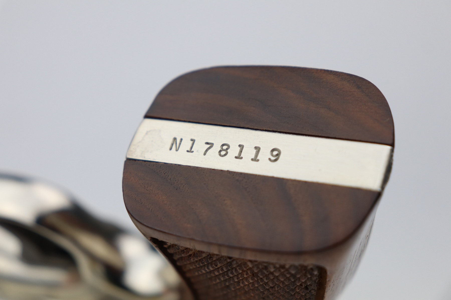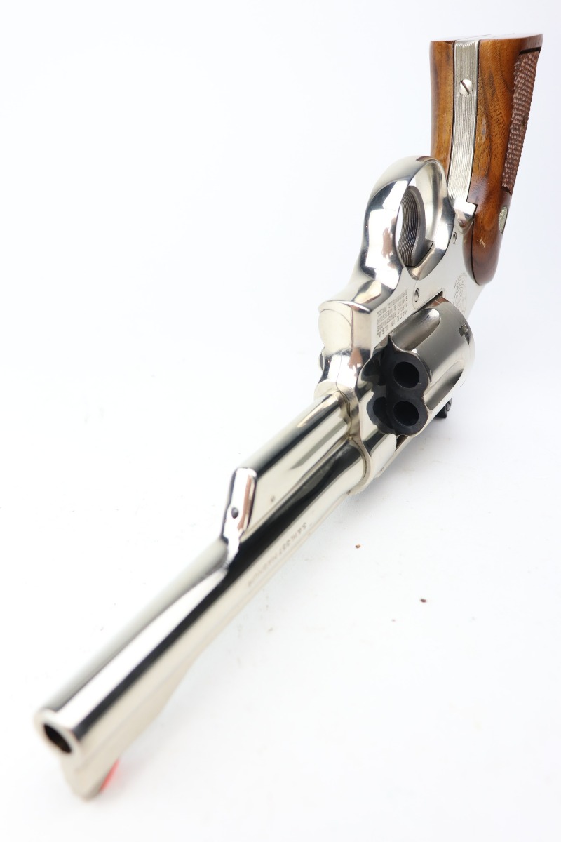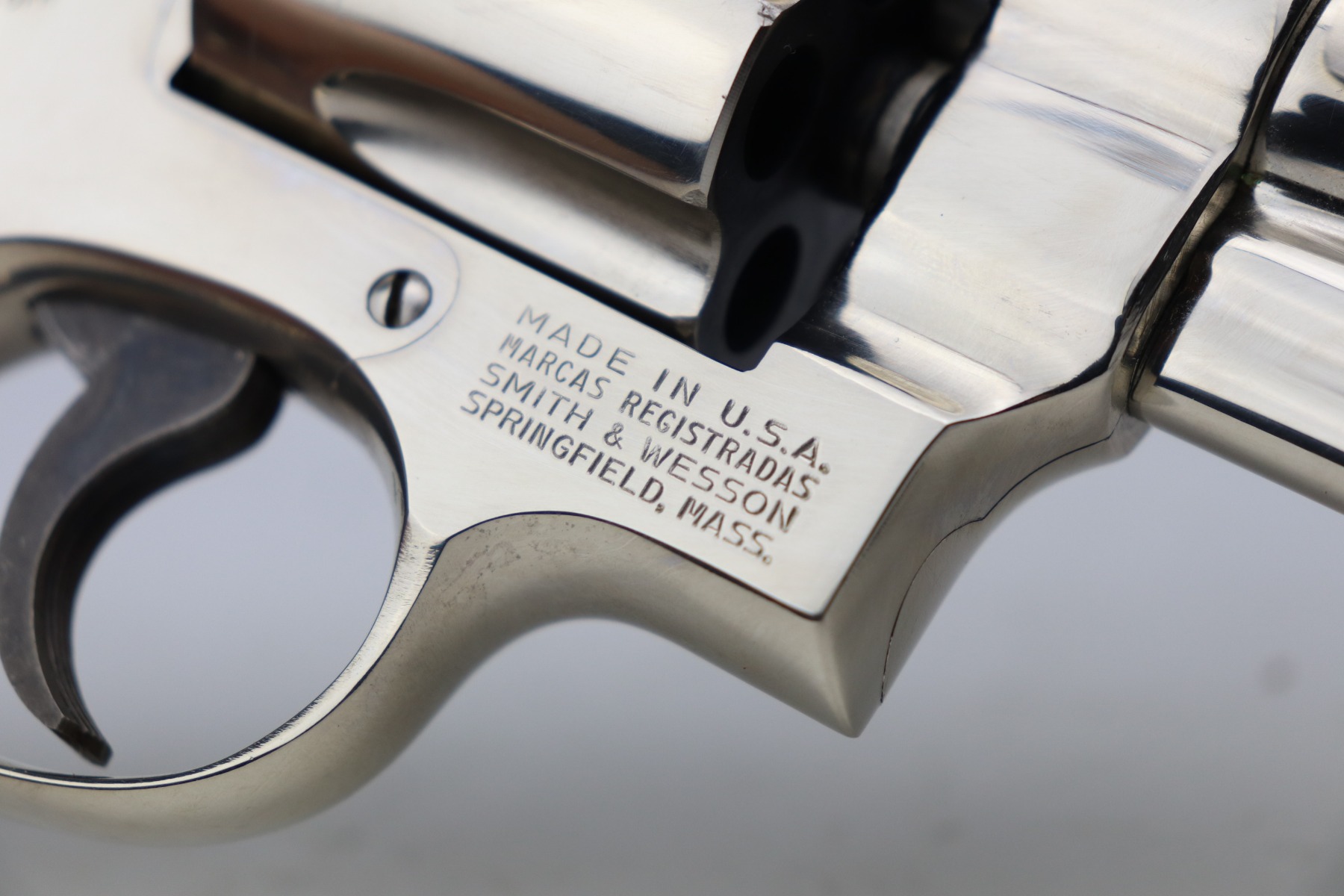 3/3/21 – This is a mint example of a Smith and Wesson Model 27-2 Revolver, chambered in .357 Magnum. 5.75 inch barrel. It was manufactured in the 1970’s. It comes with the original box (serialized to the gun). The gun is in mint condition except for some micro scratches in the finish here and there, a very faint roll mark on the cylinder, and a smudge on the left side of the frame. Mint grips. Mint bore. The cylinder is tight and the action is smooth. It also comes with a grip extension.