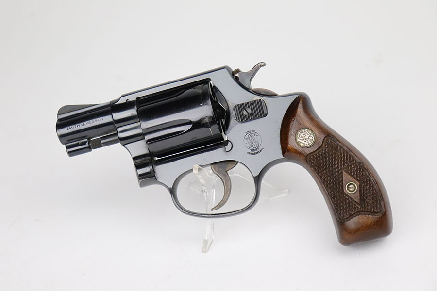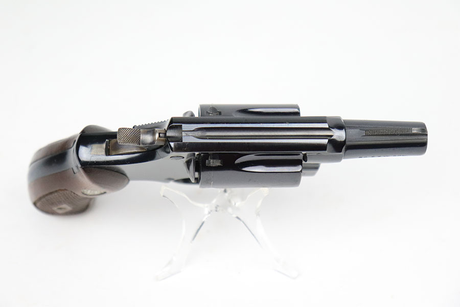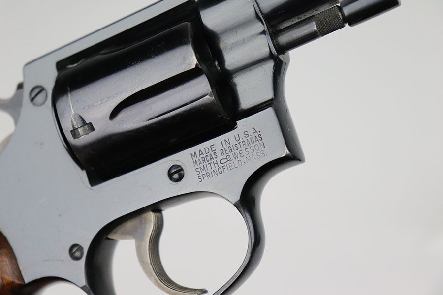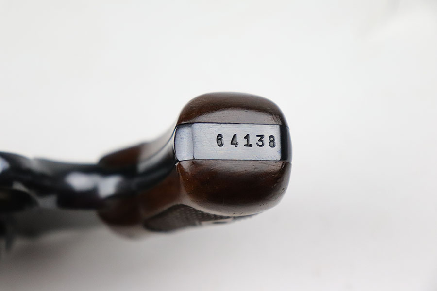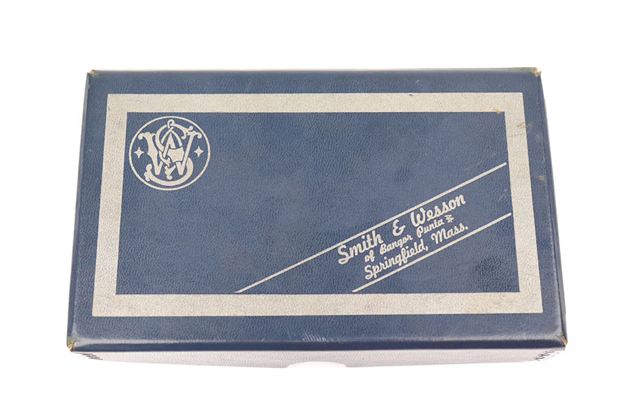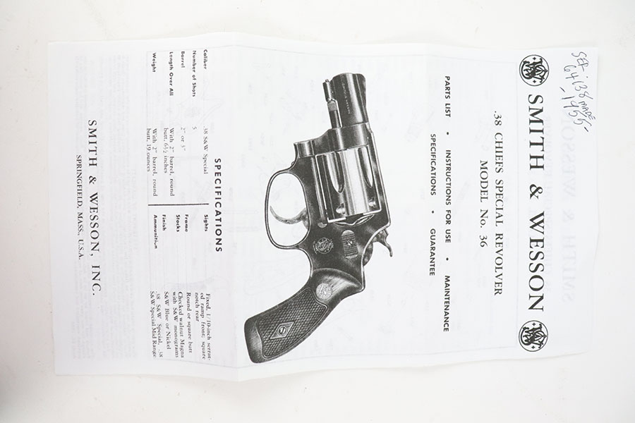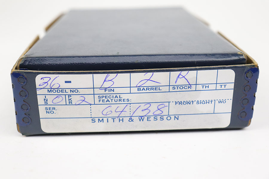 8/11/20 – This is a near-mint Smith & Wesson Model 36 in the original, matching box. Made in 1955, the revolver has 98-99% of the original blue with just a bit of muzzle wear and a roll mark on the cylinder. The Model 36 was designed in the era just after World War II, when Smith & Wesson stopped producing war materials and resumed normal production. For the Model 36, they sought to design a revolver that could fire the more powerful .38 special round in a small, concealable package. The new design was introduced at the International Association of Chiefs of Police convention in 1950, and was favorably received. A vote was held to name the new revolver, and the name “Chiefs Special” won. This one comes with the matching box and has a minty bore. Original grips are present and the right grip is numbered to the gun.